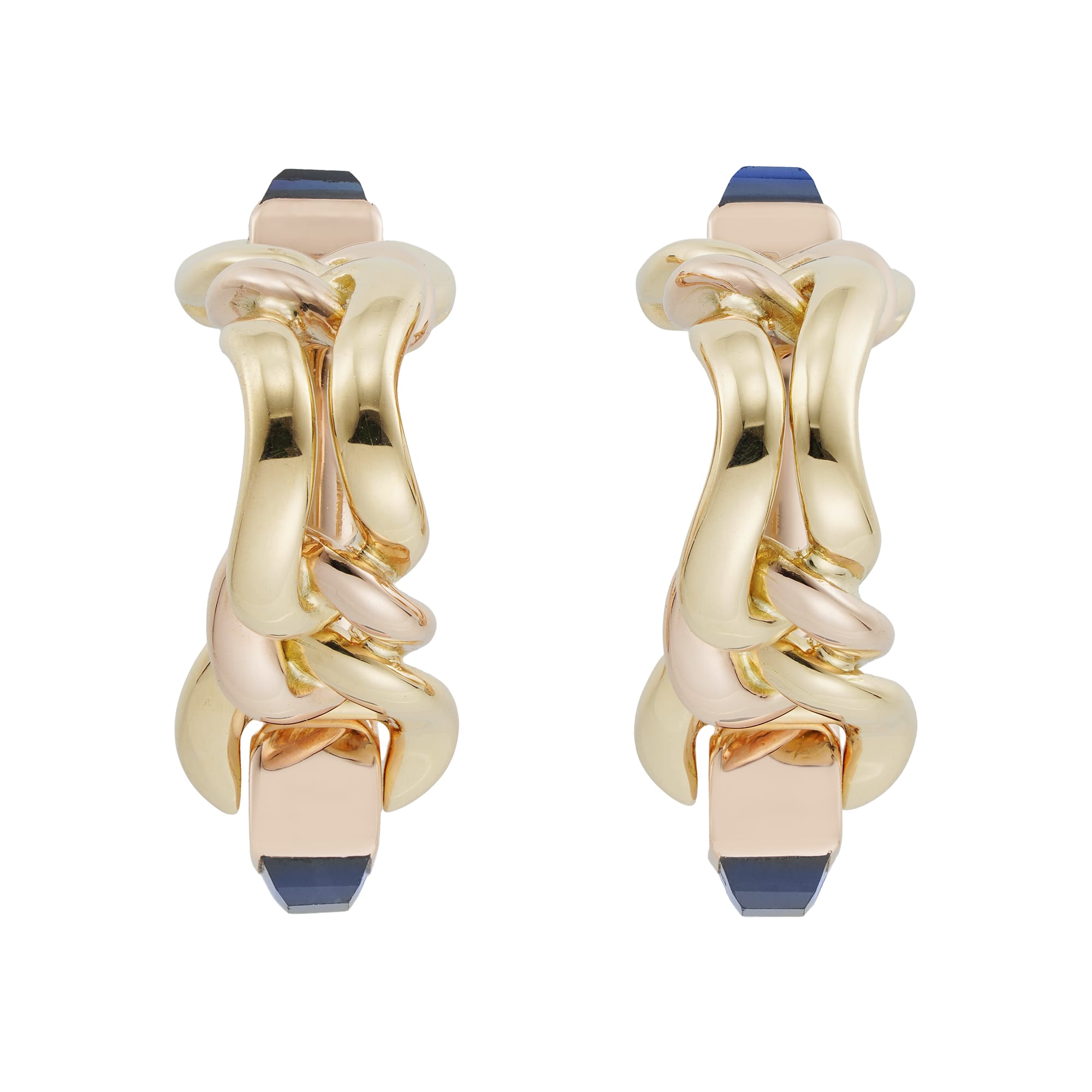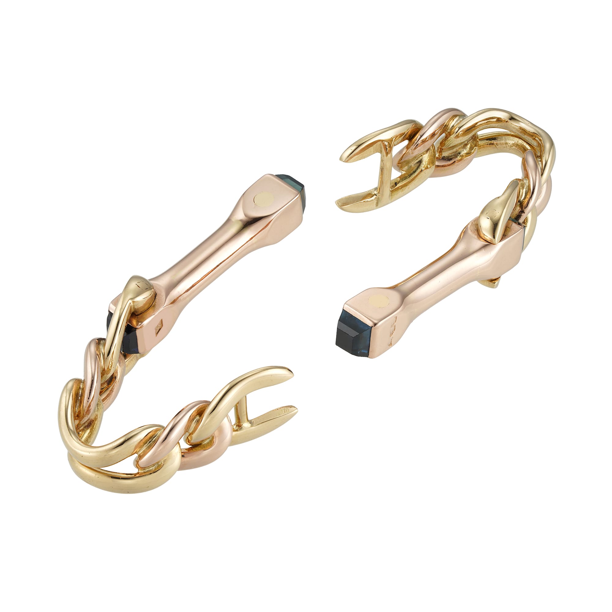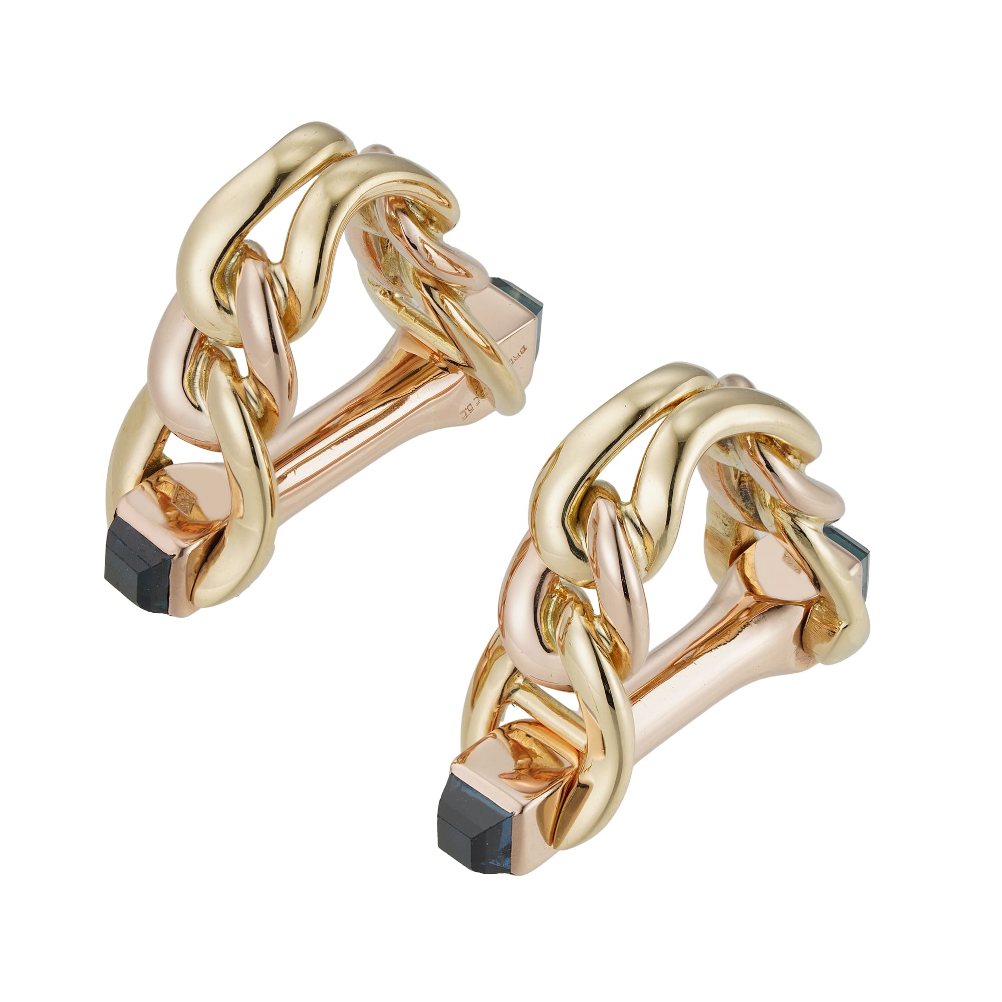 A sophisticated pair of cufflinks. Each cufflink features a bold square sapphire strongly contrasting against the glinting yellow and rose gold curb-link arches. Elegant and minimalist, these cufflinks are a perfect accessory for any occasion.