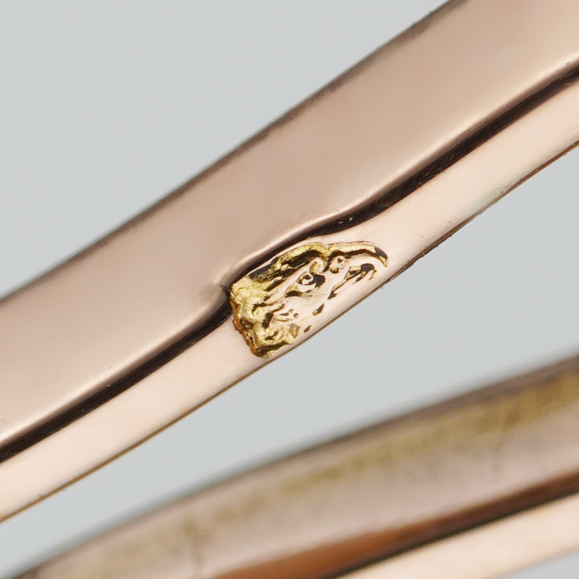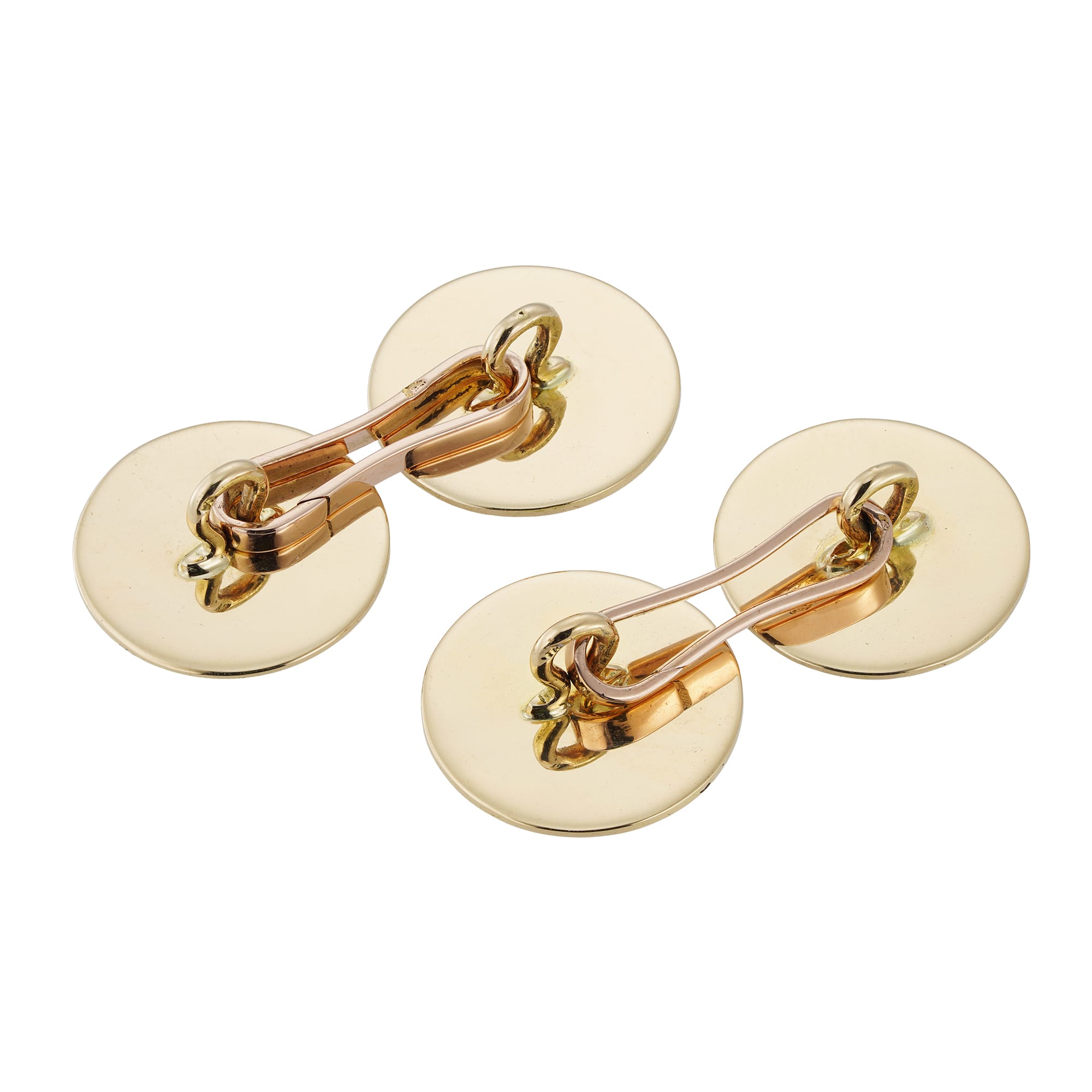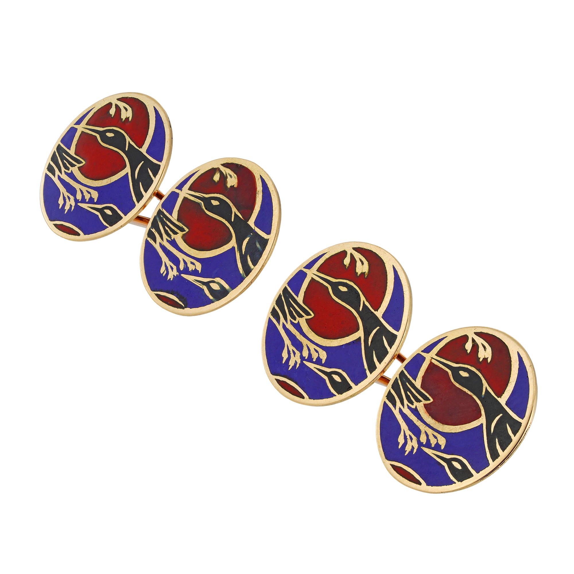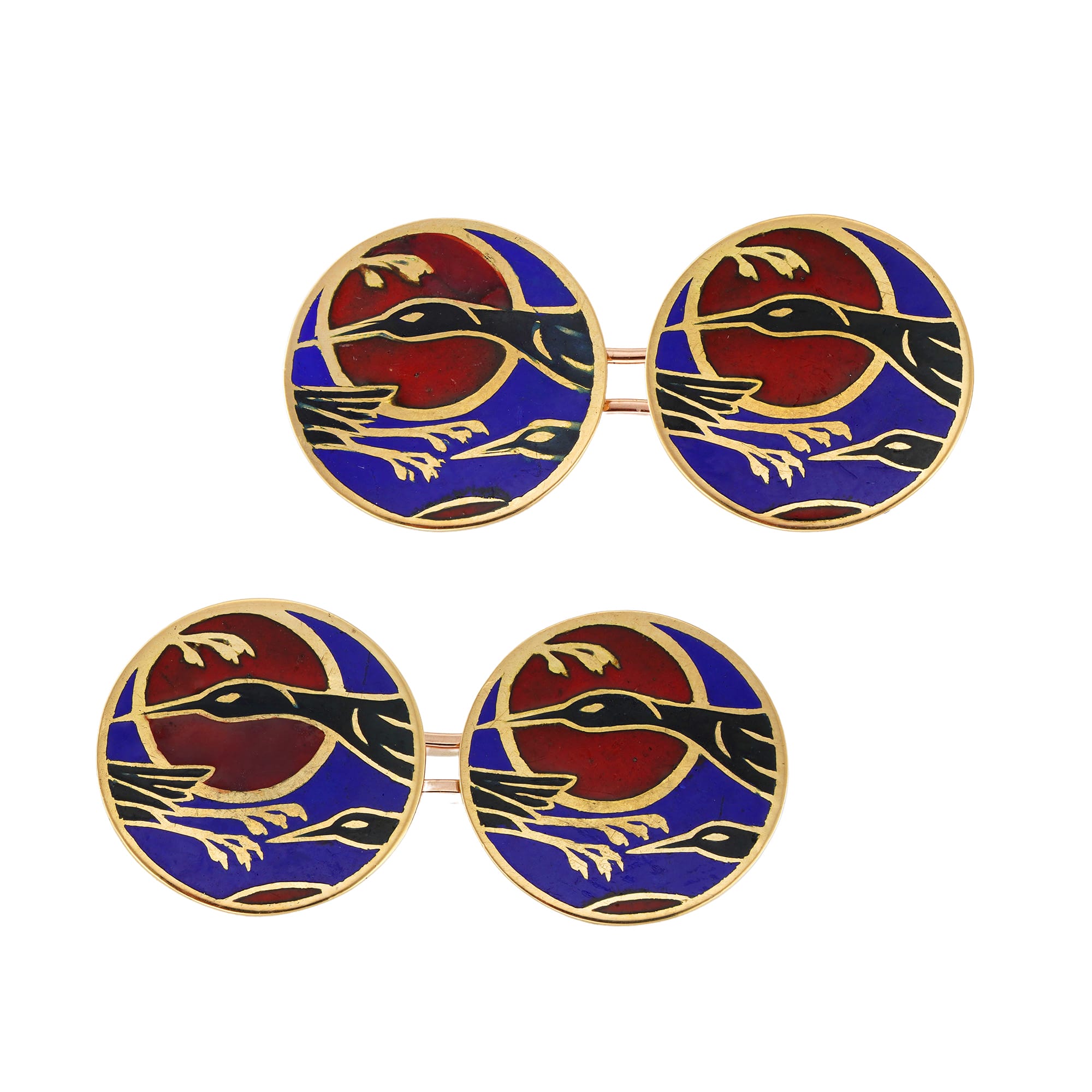A pair of French Art Deco cufflinks, each cufflink with two round enamelled plaques, each plaque depicting cranes in flight with the sun in the background, inspired by Japanese art and symbolising longevity associated with the first day of the New Year, enamelled in red, blue and black and connected with rose gold link fitting, mounted in yellow gold, bearing French assay marks for 18ct gold, each measuring approximately 2.4×1.4cm, gross weight 8.2 grams.