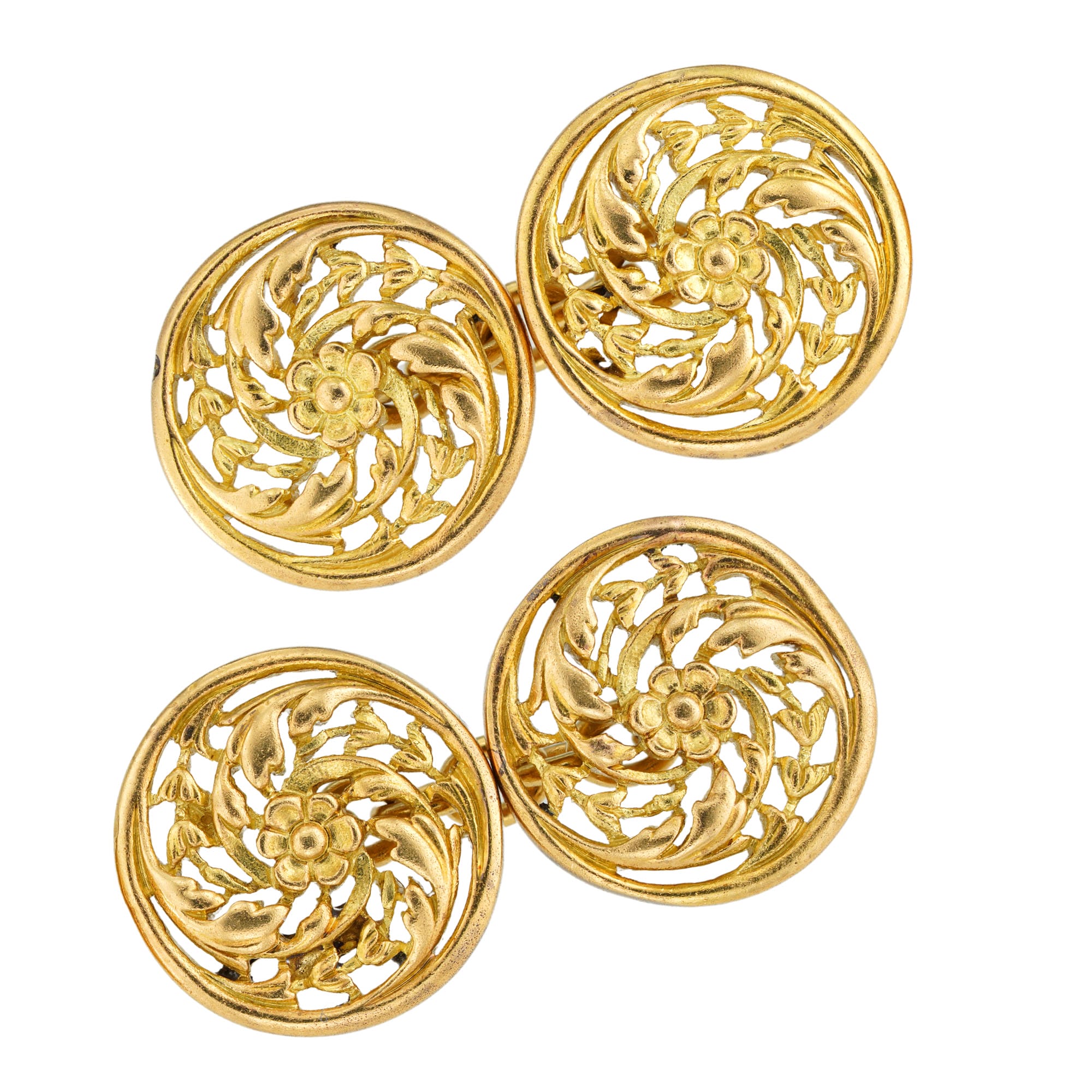 A pair of gold cufflinks by Wiese, each round face with a central carved flower surrounded by openwork scrolling surround of foliate design, mounted in yellow gold and connected with chain links, signed Wiese, circa 1880, measuring 1.4cm in diameter, gross weight 14.1 grams.