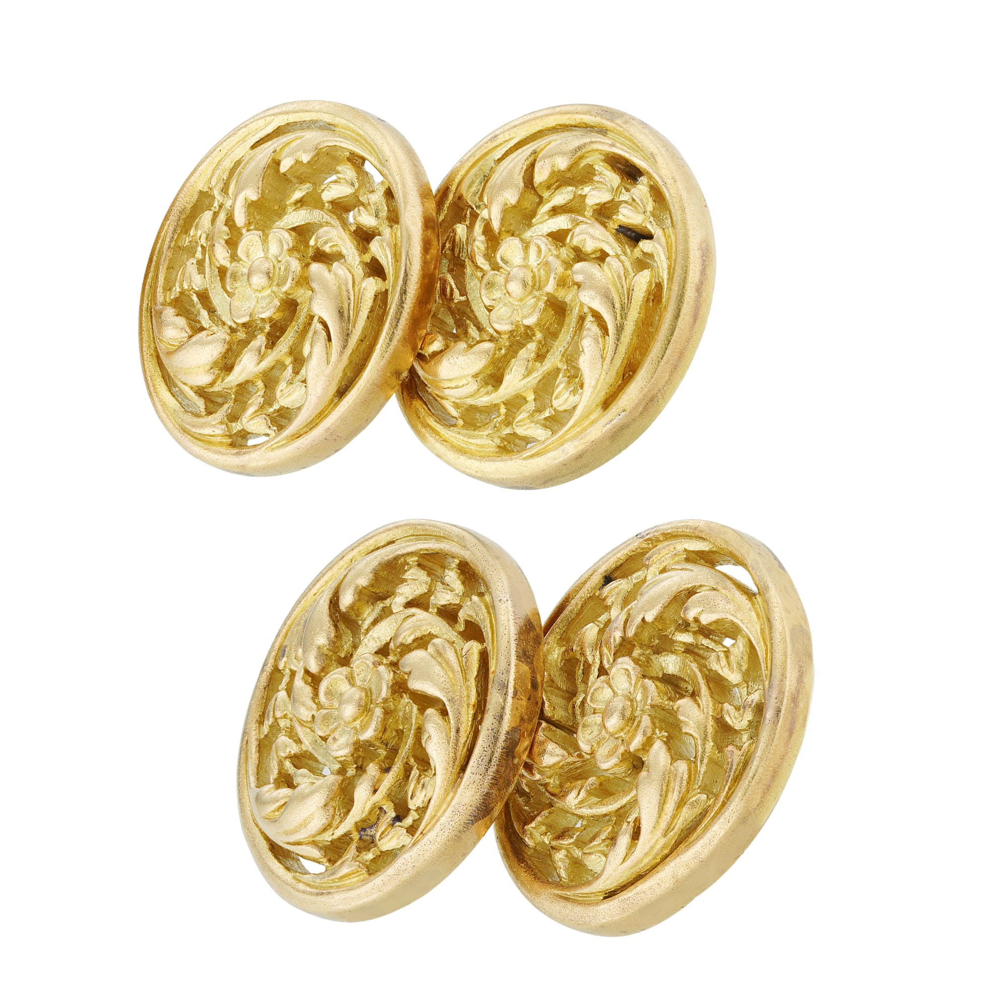 A pair of gold cufflinks by Wiese, each round face with a central carved flower surrounded by openwork scrolling surround of foliate design, mounted in yellow gold and connected with chain links, signed Wiese, circa 1880, measuring 1.4cm in diameter, ...