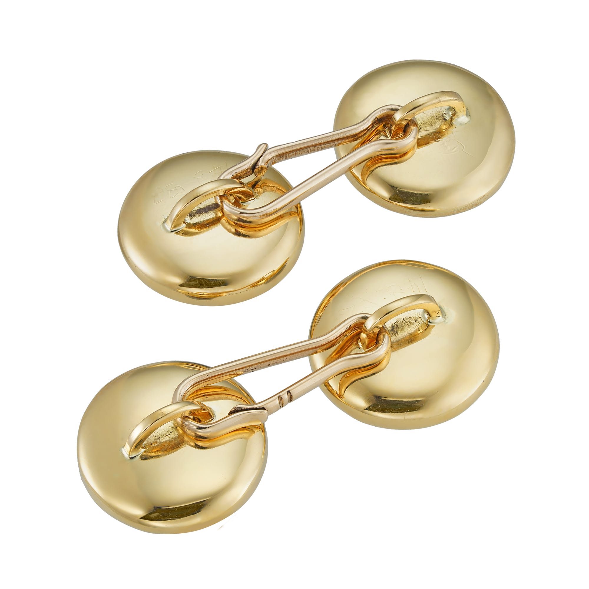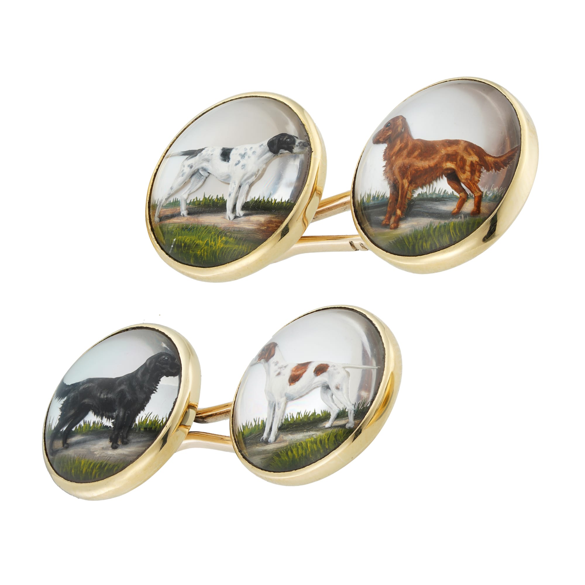 More informationA pair of Edwardian reverse intaglio crystal cufflinks, the four cabochon-cut crystal faces depicting a different hunting dog, each set to a yellow gold rubover mount, connected by a baton fastening, accompanied by a fitted box, circa 1905, measuring approximately 3.3×1.5cm, gross weight 11.1 grams.