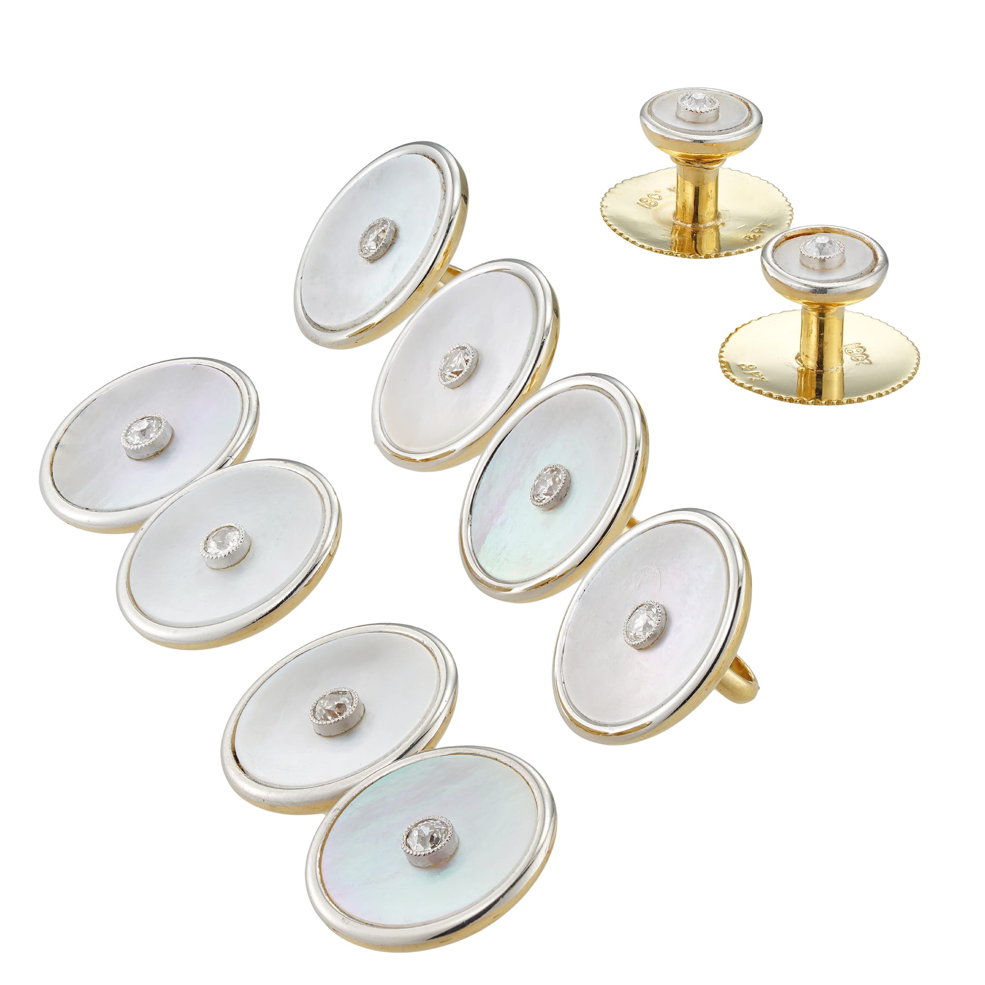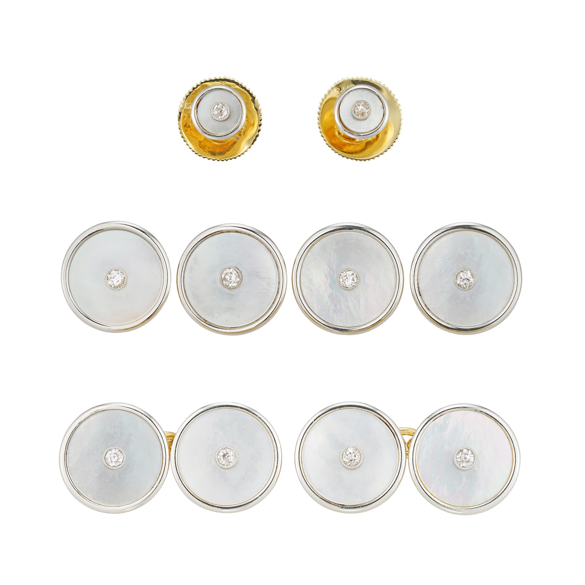 A pair of Art Déco Mother-of-Pearl and diamond gentlemans dress set, consisting of a pair of cufflinks, two shirt studs and four waistcoat buttons, each with a round mother of pearl disc centrally collet-set with a small old-European cut diamond, ...