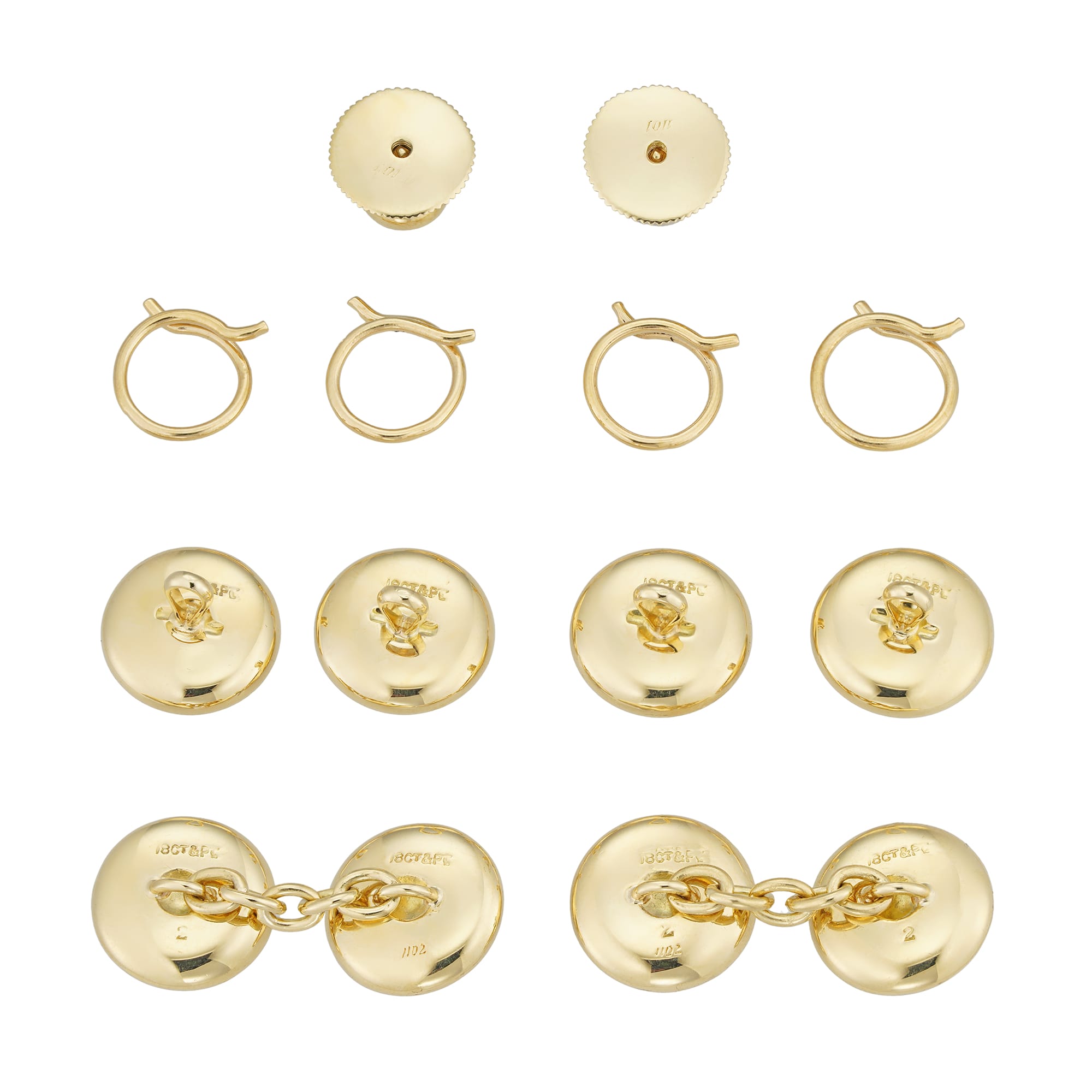 More informationA pair of Art Déco Mother-of-Pearl and diamond gentlemans dress set, consisting of a pair of cufflinks, two shirt studs and four waistcoat buttons, each with a round mother of pearl disc centrally collet-set with a small old-European cut diamond, the diamonds estimated to weigh 0.3 carats in total for the set, within a platinum border, mounted in yellow gold, circa 1925, the waistcoat buttons and cufflinks measuring approximately 1.4 x 1.4cm, the shirt buttons measuring approximately 0.7 cm diameter, gross weight 18 grams, within a fitted box by Jays of London.