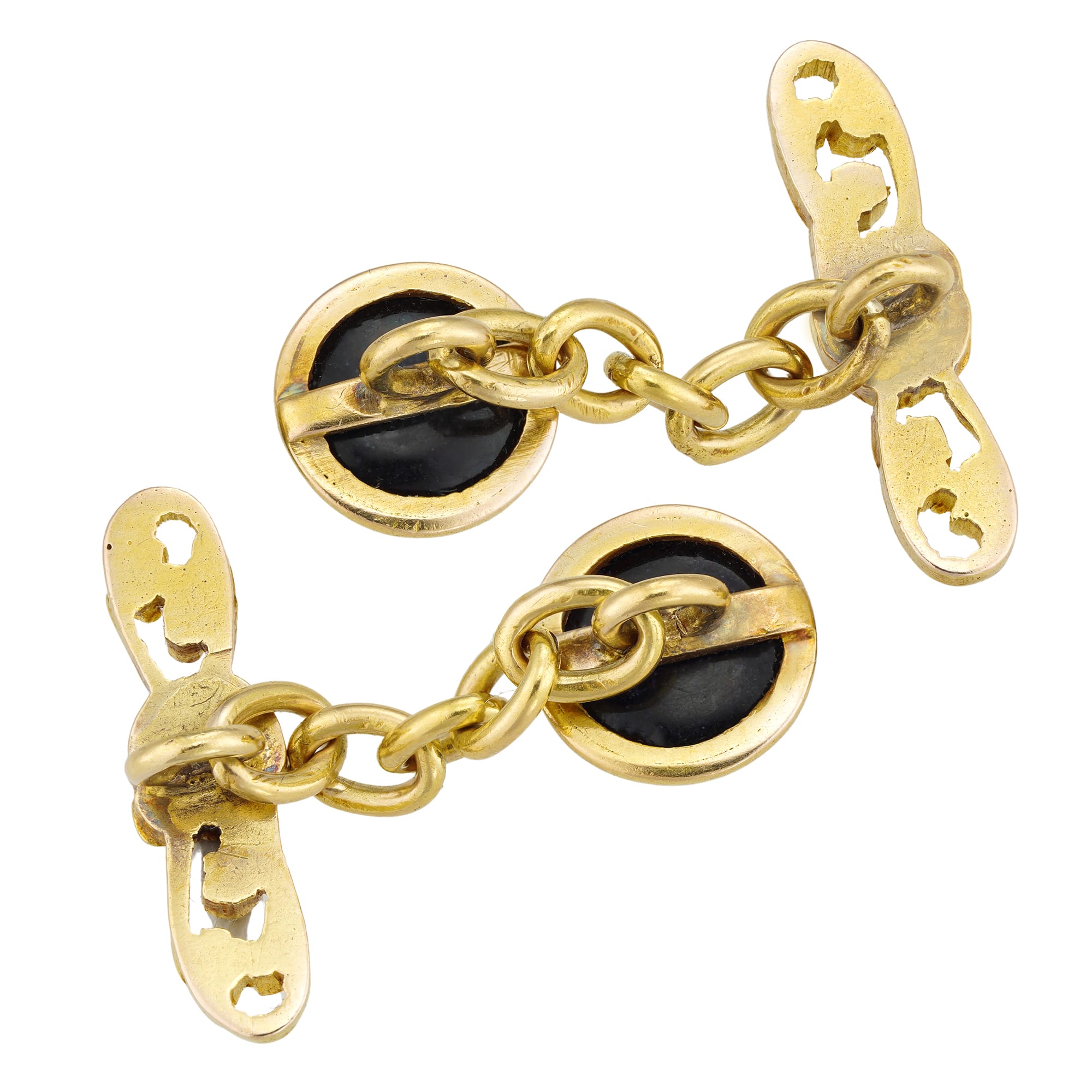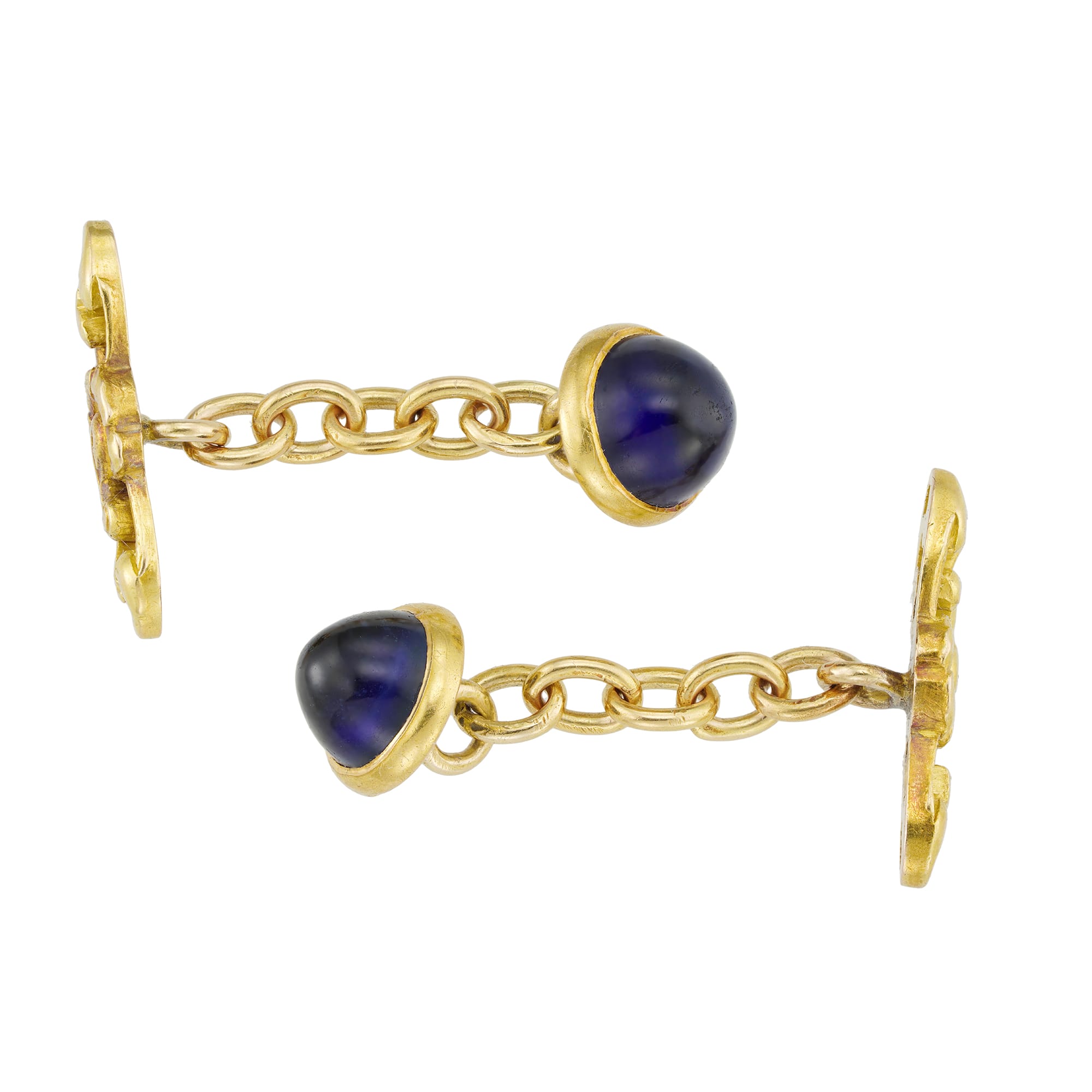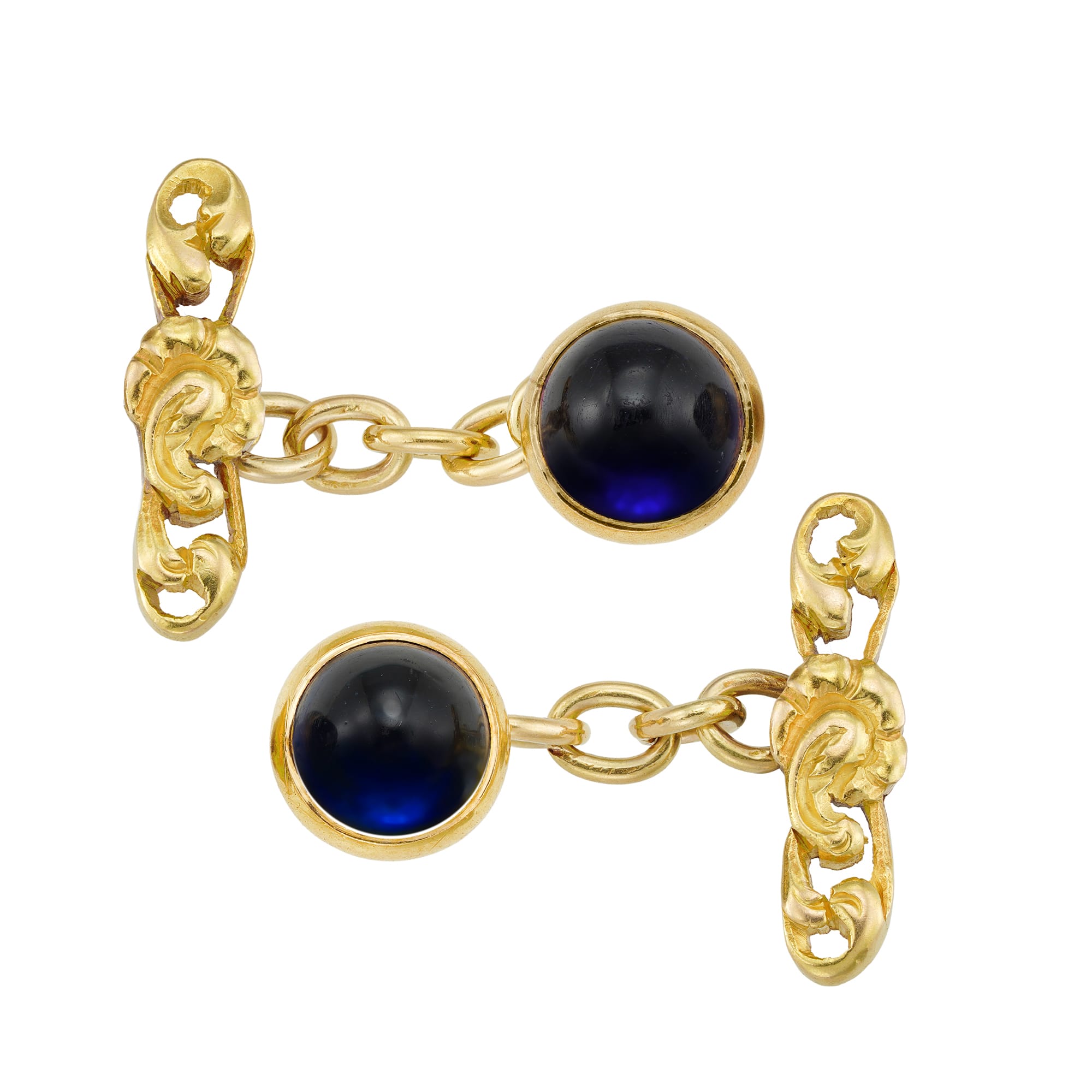 A pair of Edwardian sapphire and gold cufflinks, each cufflink comprising of a round sugar-loaf sapphire, estimated to weigh approximately 1½ carats each, rubover set in yellow gold with chain fittings and open-work floral bars, circa 1910, measuring approximately 9mm in diameter, gross weight 6.9 grams.