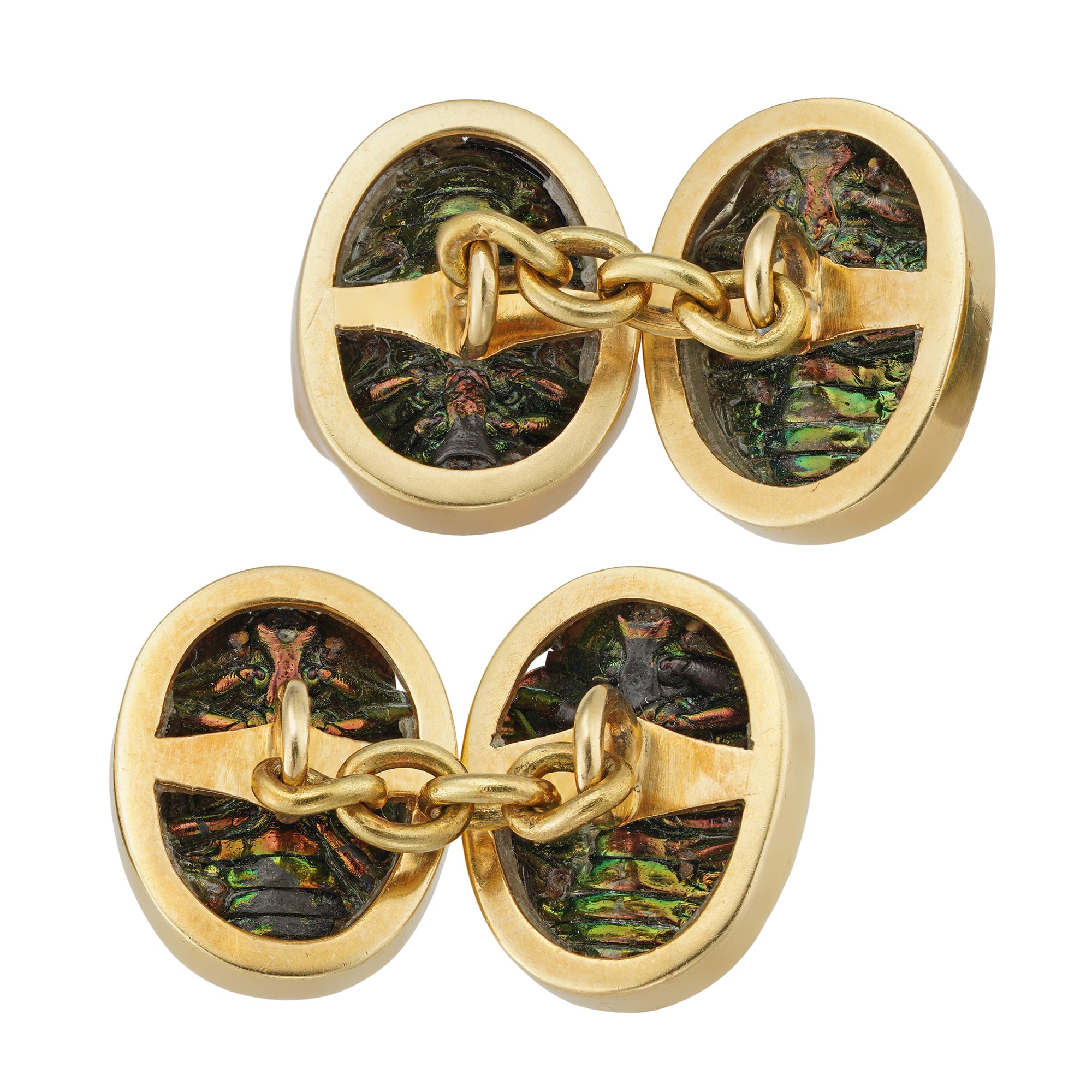 More informationA pair of Late 19th Century French scarab cufflinks, each cufflink with two scarab beetles bezel set to yellow gold mounts with chain fittings, bearing French hallmarks for 18ct gold, circa 1890, measuring approximately 1.5 x 1.1cm, gross weight 5.3grams.