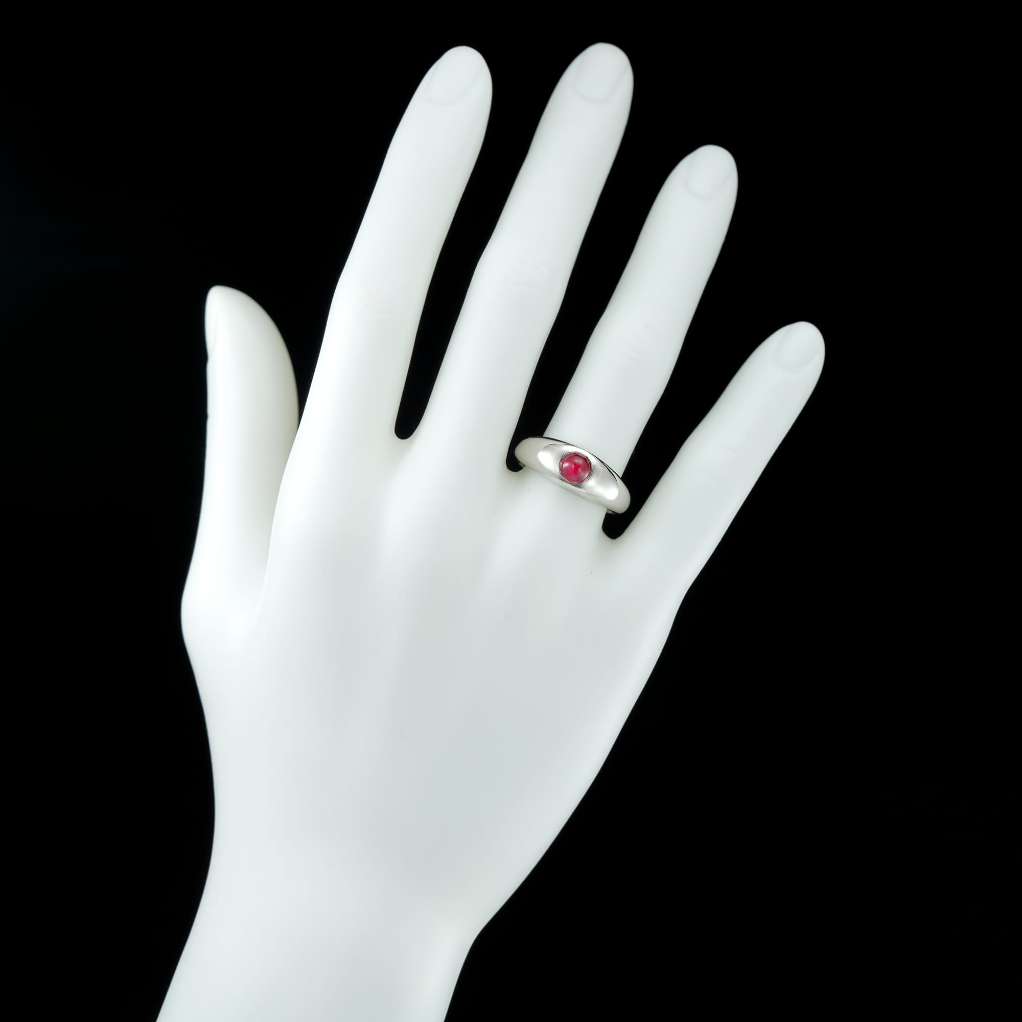 A simple and striking ring. It features a crimson ruby gypsy-set in an elegant and thick platinum band. Gypsy style rings are perennially popular for their comfortable profile and simple but elegant design. This wonderful ring would add sophistication to everyday wear.