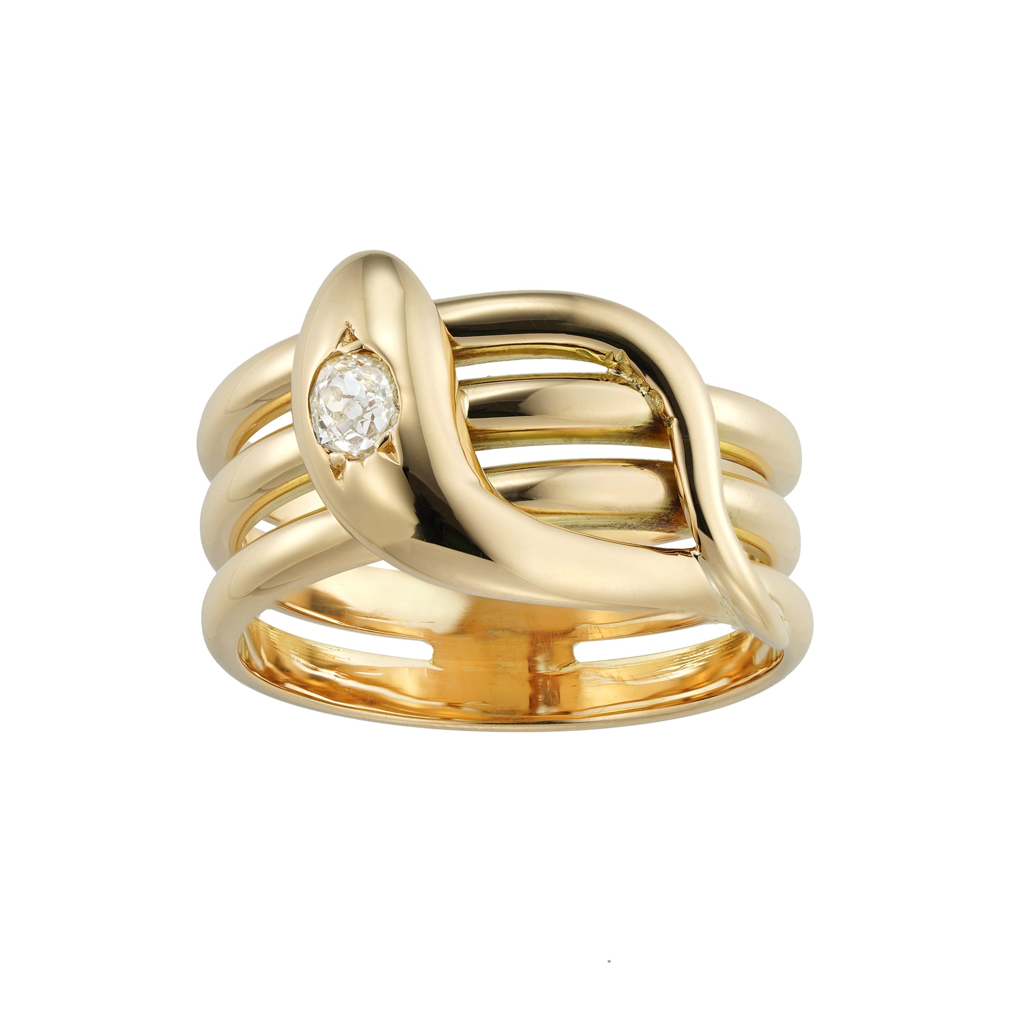 A Turn-of-the-20th century gold and diamond snake ring, the yellow gold coiled snake with an old-cut diamond estimated to weigh 0.2 carats set to the head, circa 1900, measuring 2.2 x 1.3cm, finger size S, gross weight 10.3 grams.