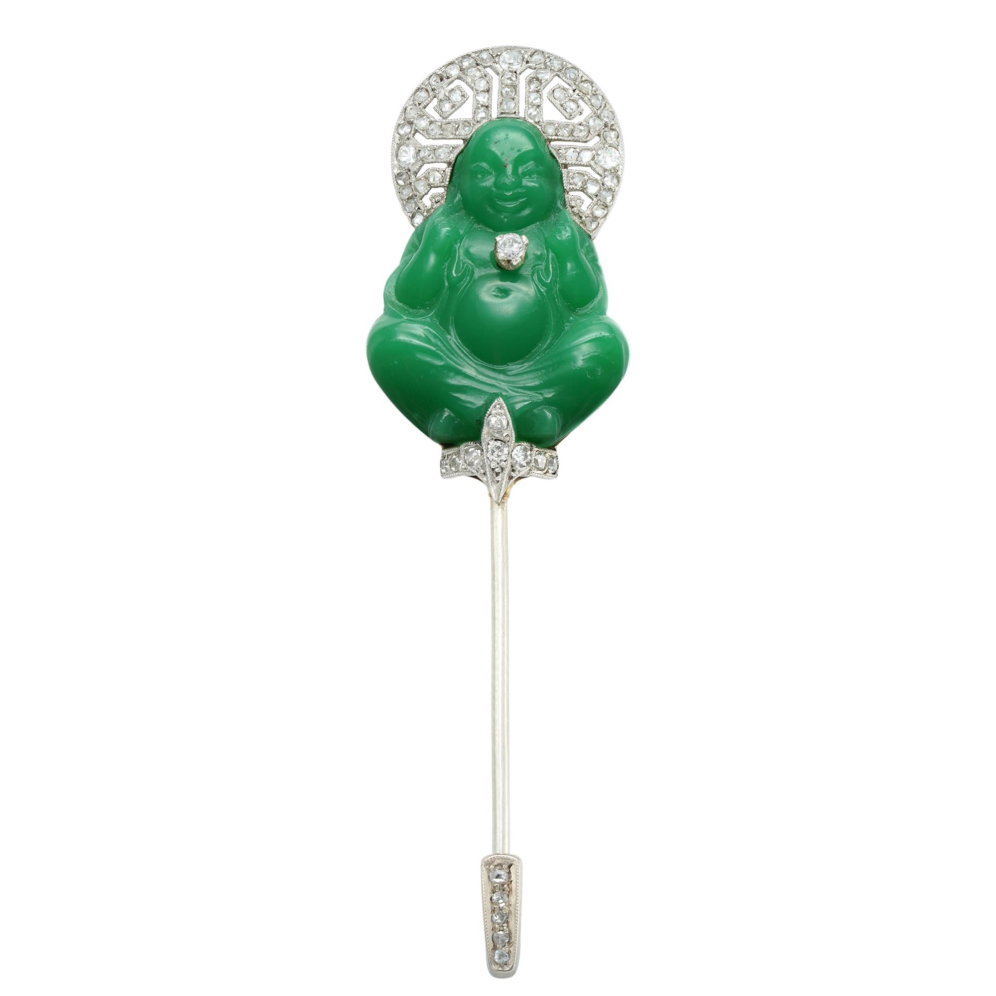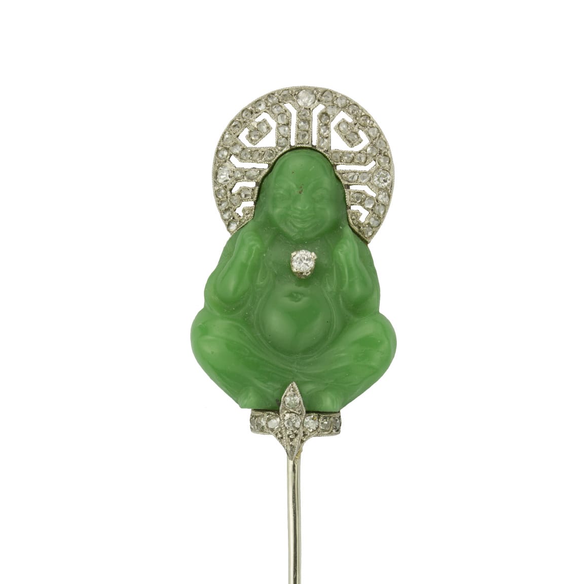 A wonderful Art Deco stick pin. It features a green pâte de verre Chinese Buddha, with a single diamond set to its chest and a detailed diamond halo. Pâte de verre is a pressed glass popularly used in the Art Nouveau and Art Deco period. The diamonds complement the vivid green Buddha well. This pin reflects the Eastern influences on Art Deco design and would add a pop of colour and character to a tailored suit.