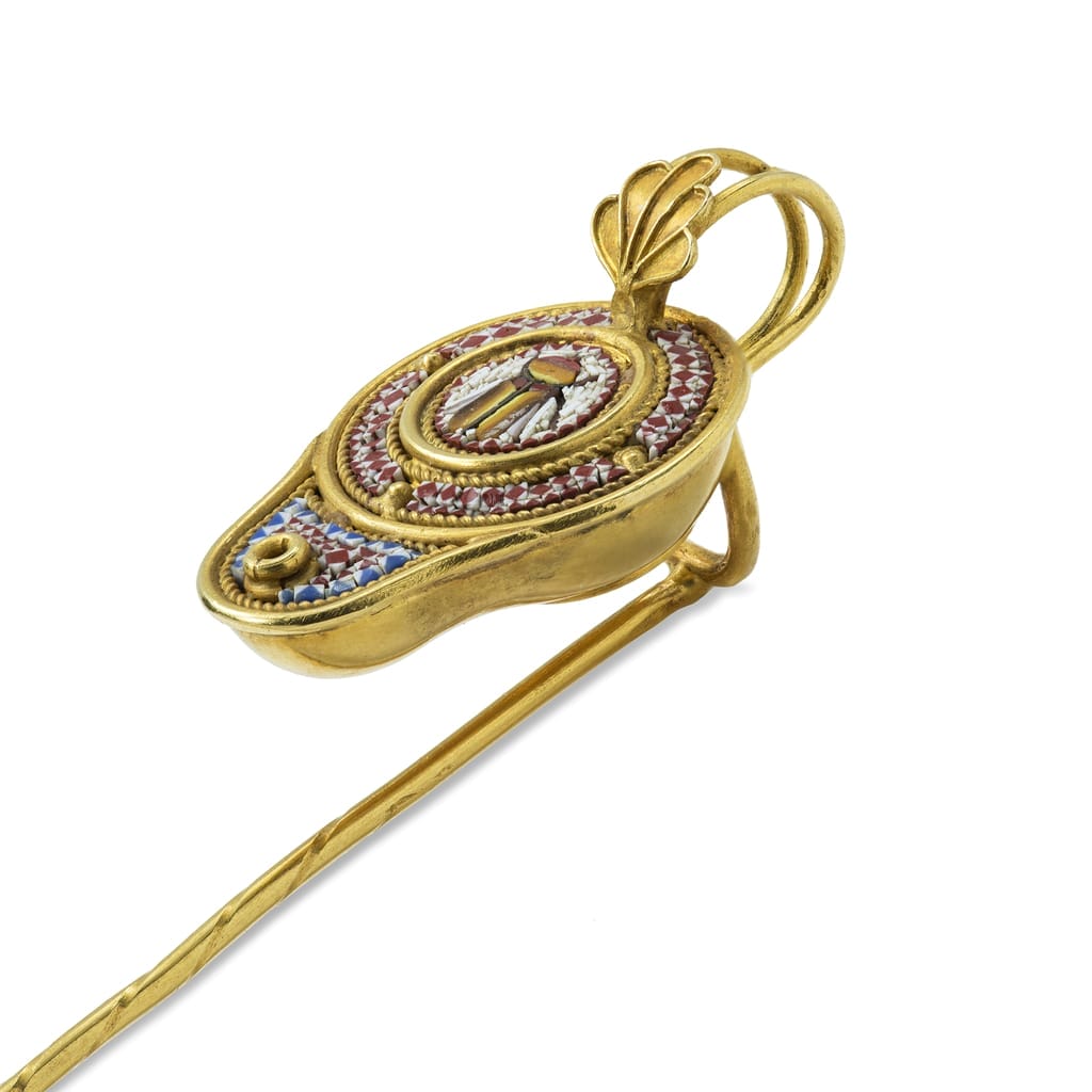 This exquisite stick pin was made by the revivalist jewellery Antonio Carli. This piece is in the form of a Byzantine oil lamp, decorated on the top with a palmette motif. The body of the lamp is decorated with extremely fine micro mosaic, an ancient technique from Italy that experienced a resurgence of popularity in the mid nineteenth century. The mosaic features a complex pattern of red and white to the top and blue and white to the bottom. In the centre is a detailed mosaic insect. This wonderful and historic piece is a fine collector’s item.