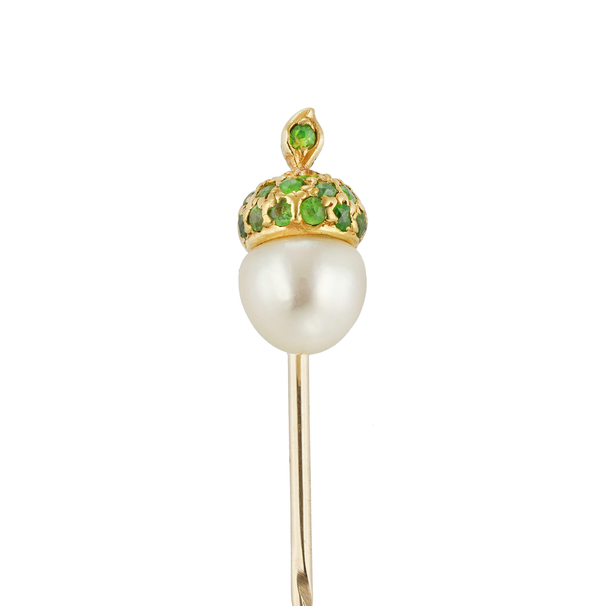 An Edwardian natural pearl and demantoid garnet acorn stick pin, the cupule encrusted with seventeen small faceted demantoid garnets, the pericarp formed by a button-shaped white colour natural pearl, weighing 1.86 carats and accompanied by The Gem & Pearl Laboratory ...