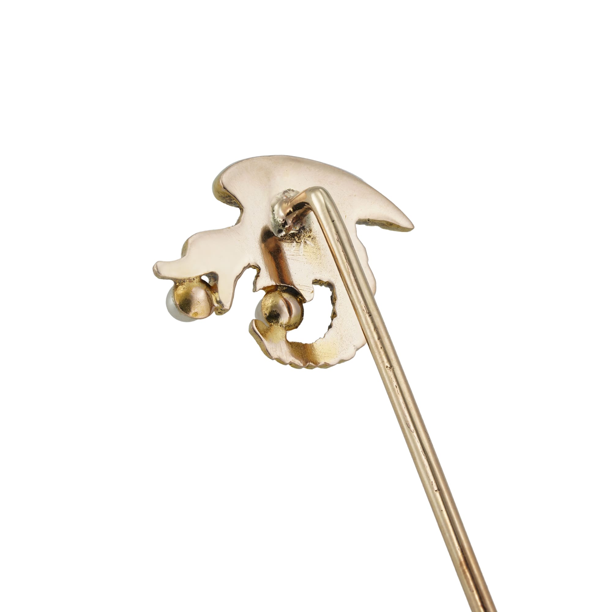 An Art Nouveau gold stick pin, depicting a dragon holding one round seed pearl in its jaws and another seed pearl in its claws, circa 1890, the jewelled part measuring approximately 1.1×1.45cm, the pin measuring 5.5cm long, gross weight 1.2 grams.