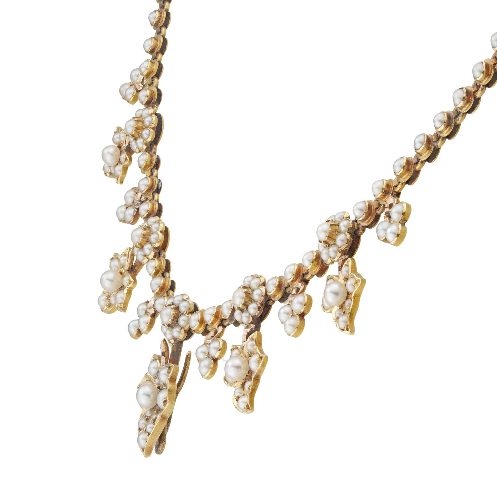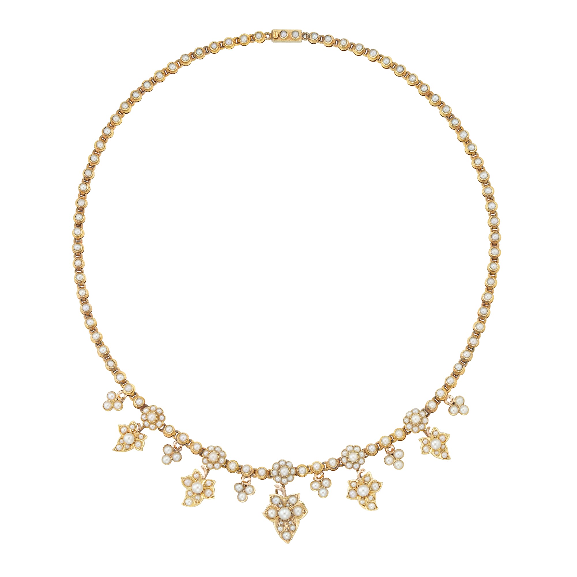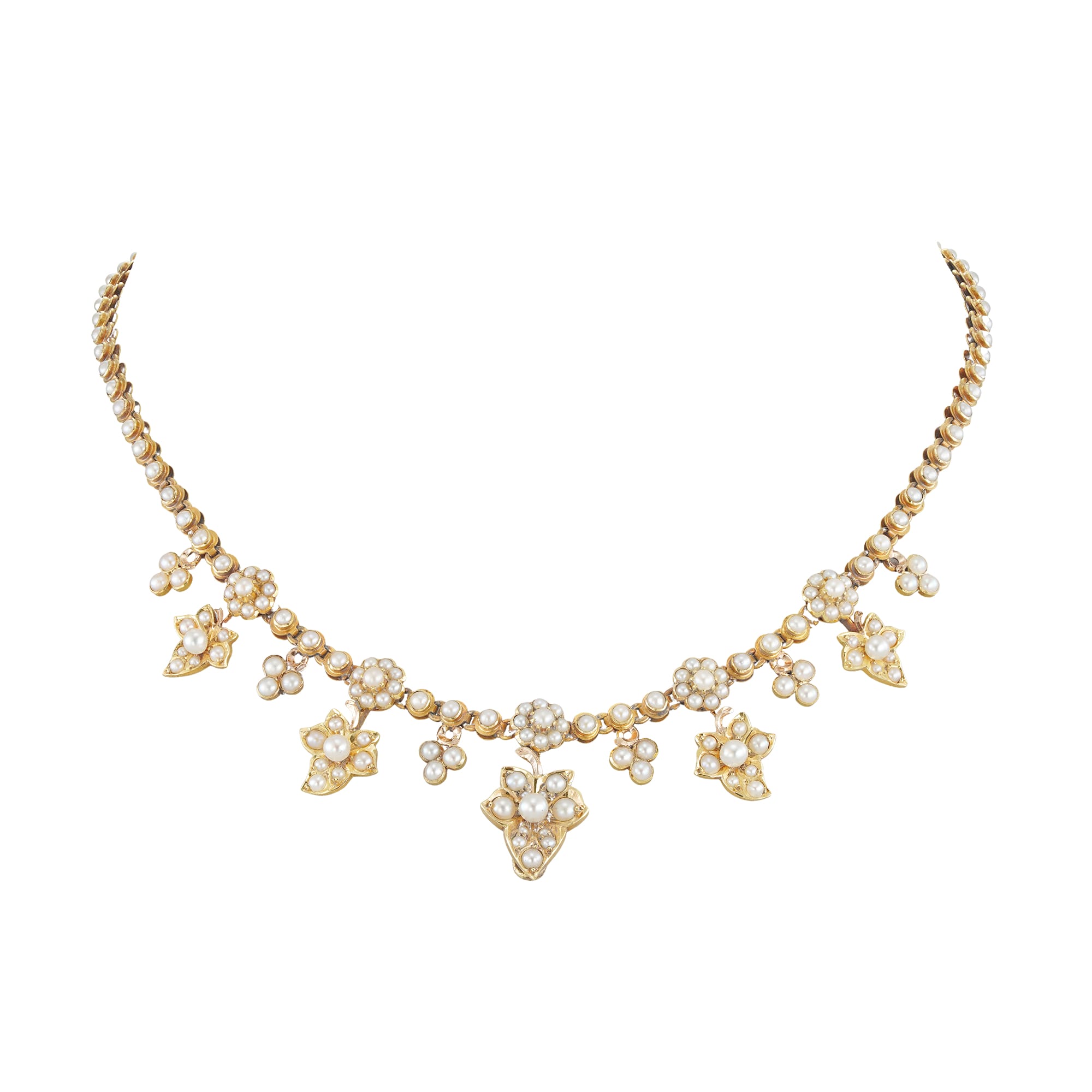 A Victorian seed pearl floral necklace, with circular flower clusters suspending gold leaves set with seed pearls alternating with trefoil motif drops, all mounted on 18ct yellow gold, circa 1860, gross weight 24.9 grams A gorgeous Victorian necklace. This delicate ...