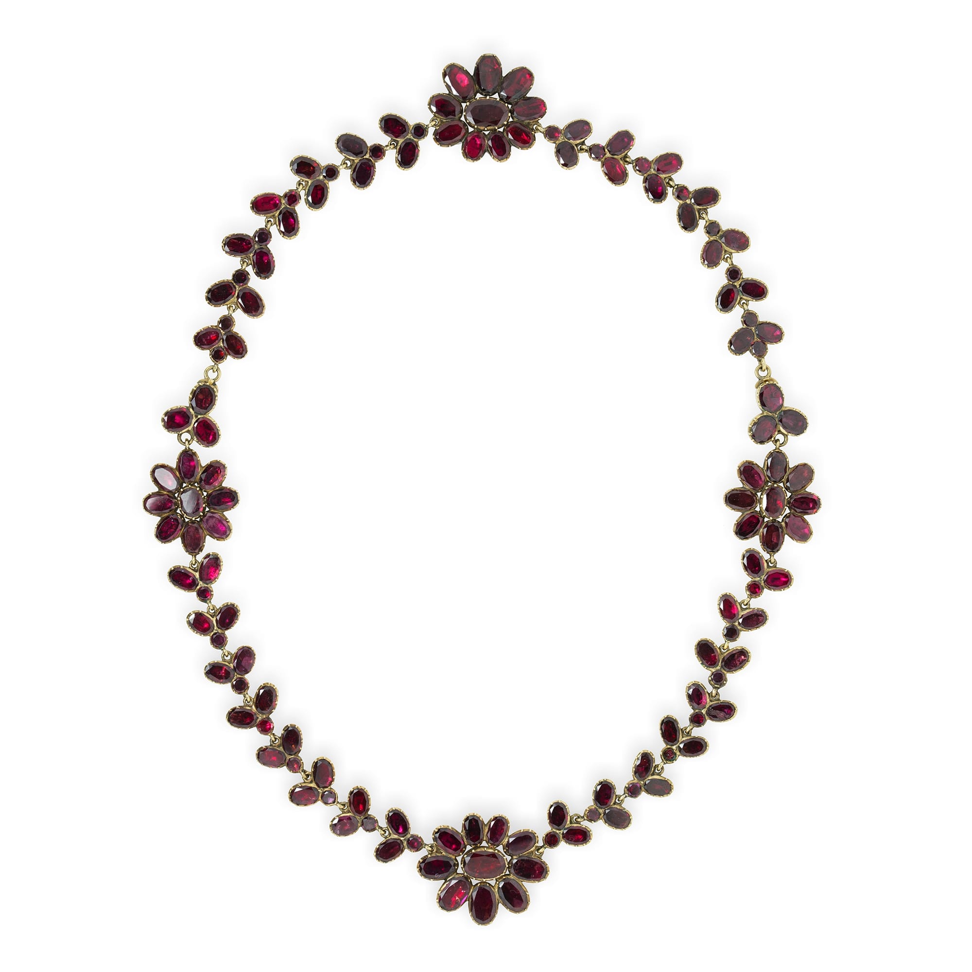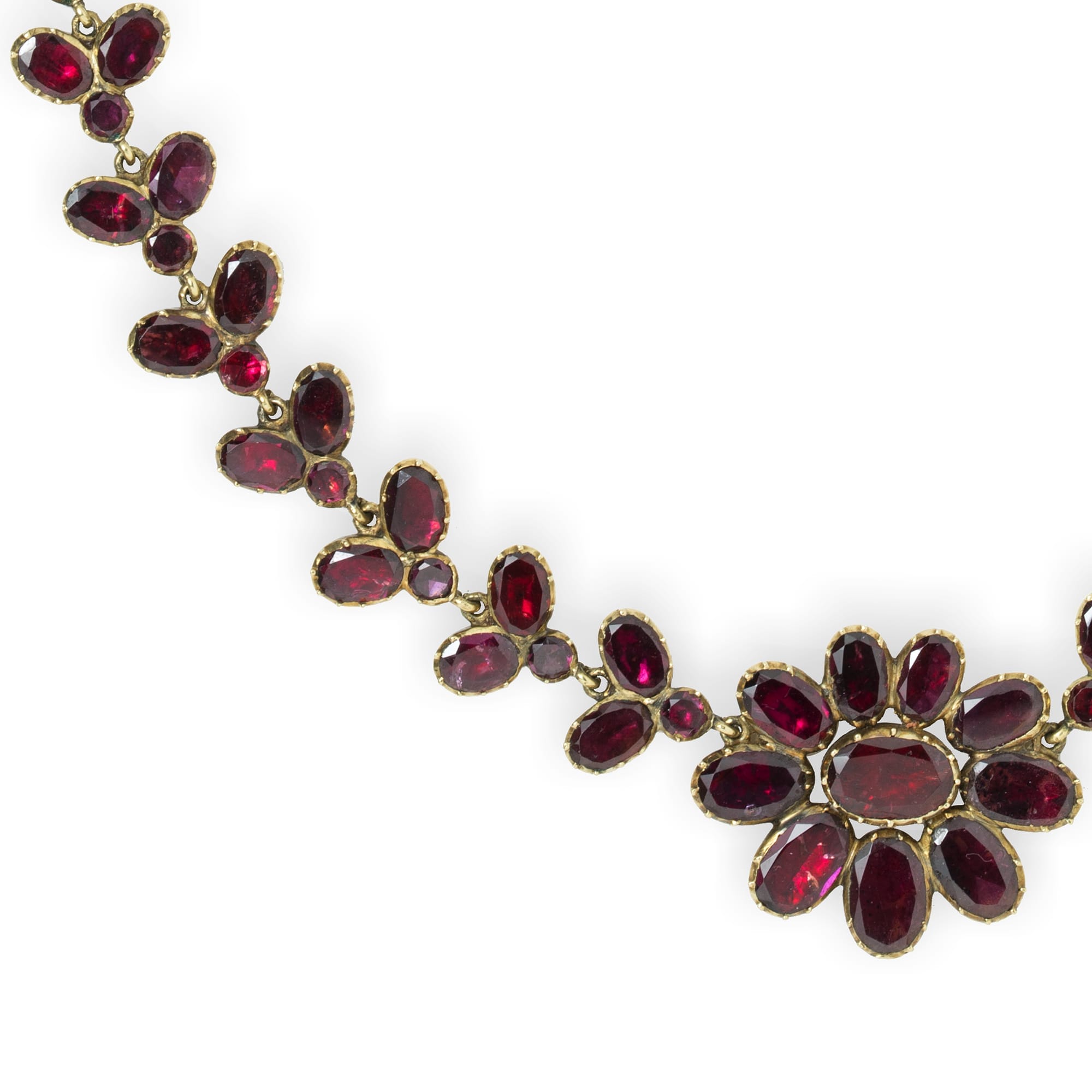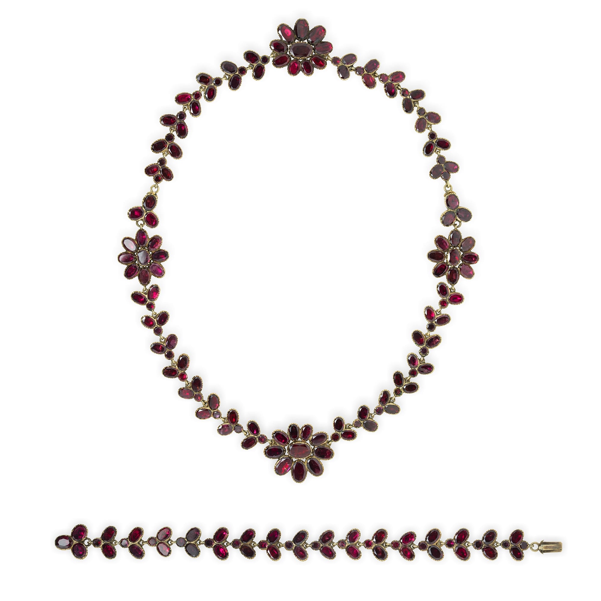 A George III garnet-set demi-parure, the necklace consisting of four garnet-set foliate clusters linked with articulated garnet-set trefoil-links, 17.5 inches long, the bracelet consisting of seventeen articulated garnet-set trefoil-links 7 inches long, all garnets cut-down set to yellow gold closed-back mount, circa 1800, gross weight 53.0 grams.