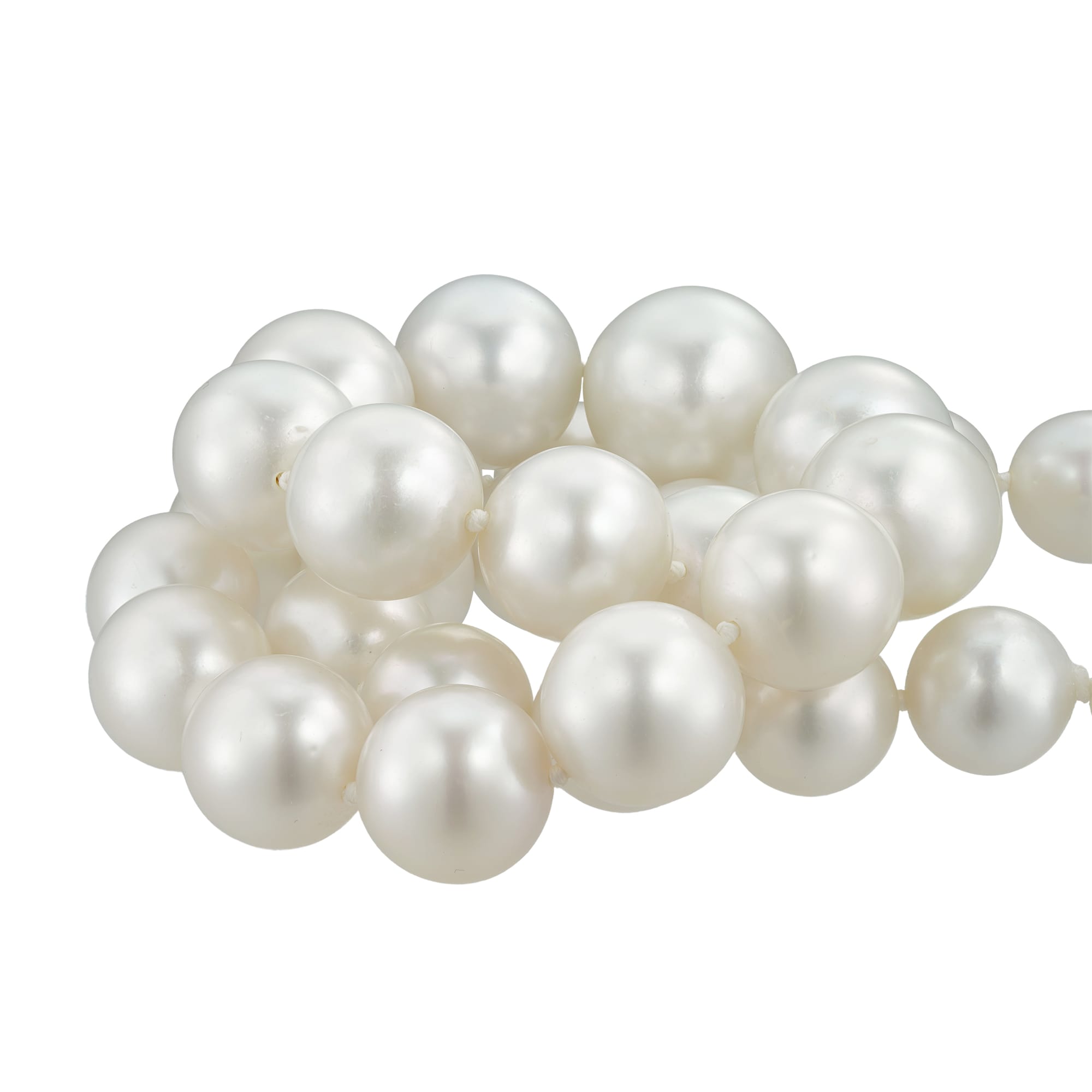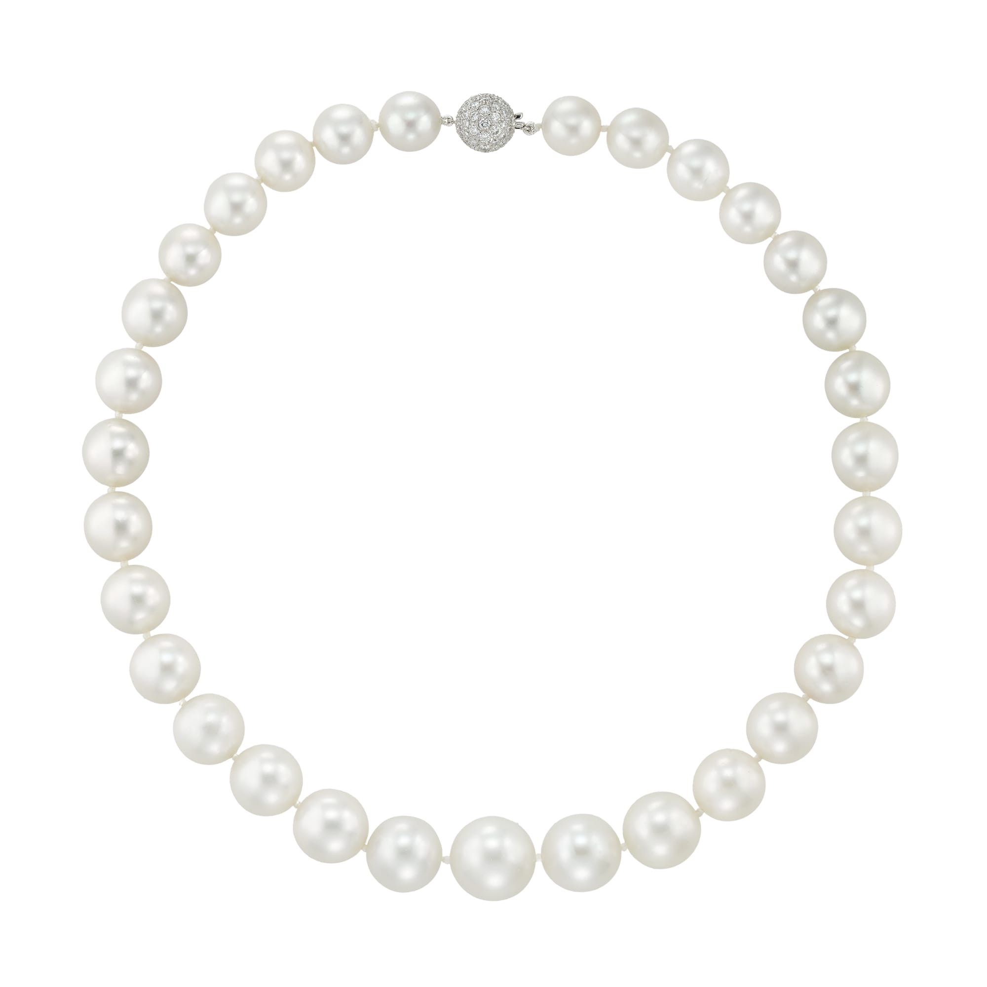 A South Sea cultured pearl and diamond necklace, consisting of thirty-one South Sea cultured pearls graduating in size from 16.6mm to 11.9mm, all strung and knotted to a platinum ball clasp pave-set with small brilliant-cut diamonds estimated to weigh 1.9 ...