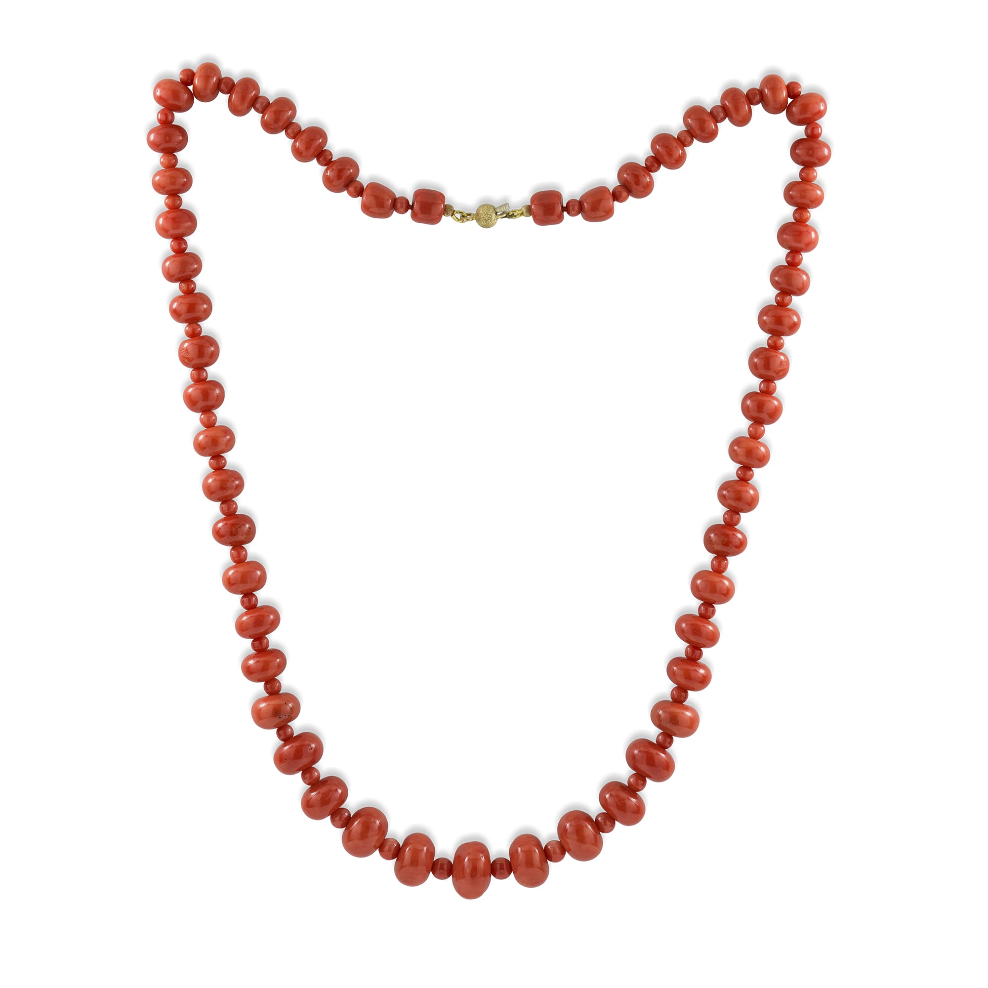 More informationAn mid-20th century single row graduating coral bead necklace, the fifty-three rondelle shaped coral beads graduating in size from the centre, measuring 12.8 to mm 6.5 mm, alternately strung with fifty-two small round coral beads all measuring approximately 4-5 mm in diameter, all to a later textured yellow gold ball clasp, bearing Italian mark for 18ct gold, circa 1955, measuring approximately 60 cm long, gross weight 74.4 grams.