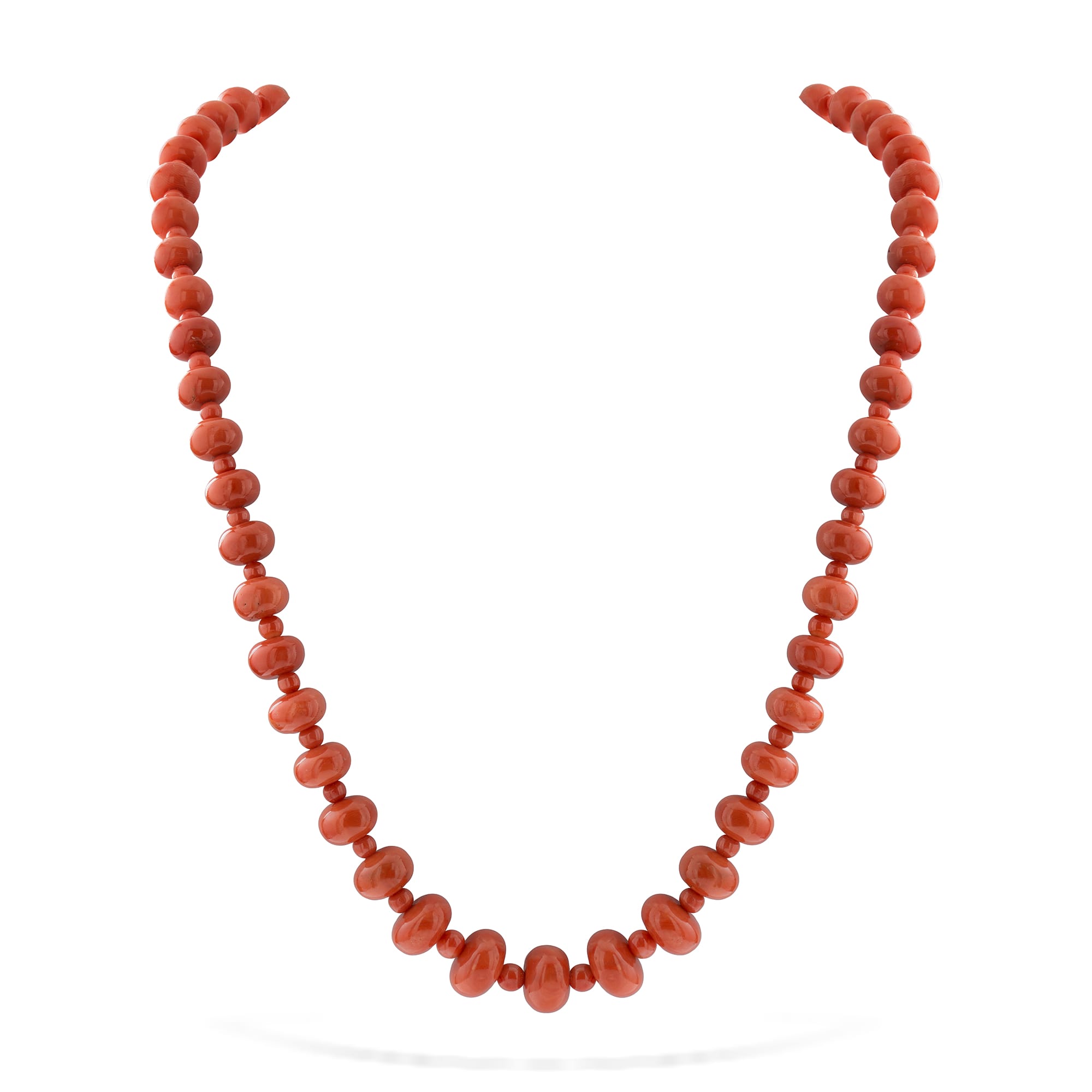 An mid-20th century single row graduating coral bead necklace, the fifty-three rondelle shaped coral beads graduating in size from the centre, measuring 12.8 to mm 6.5 mm, alternately strung with fifty-two small round coral beads all measuring approximately 4-5 mm ...