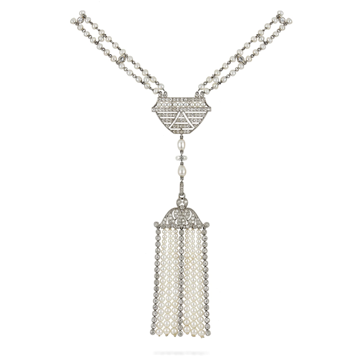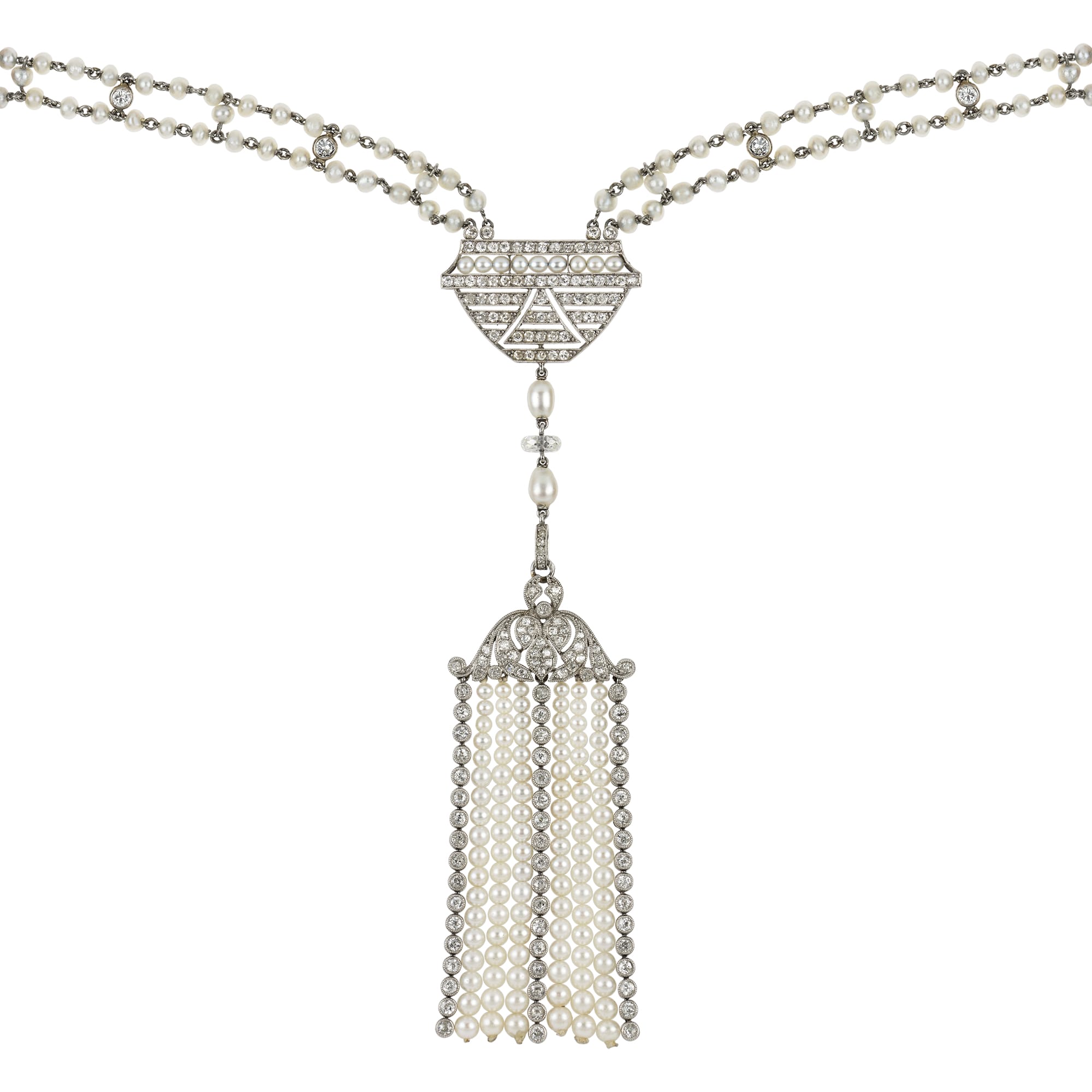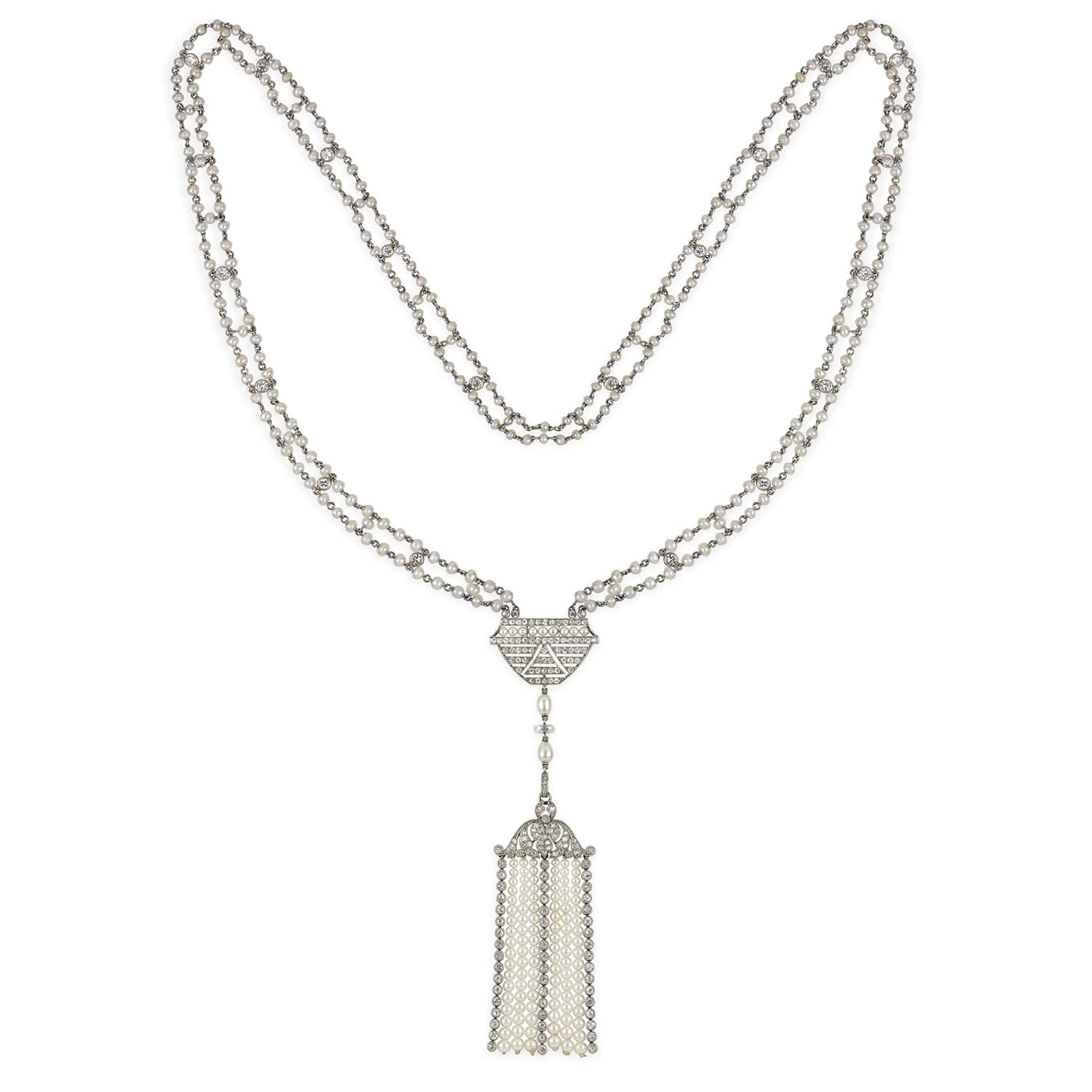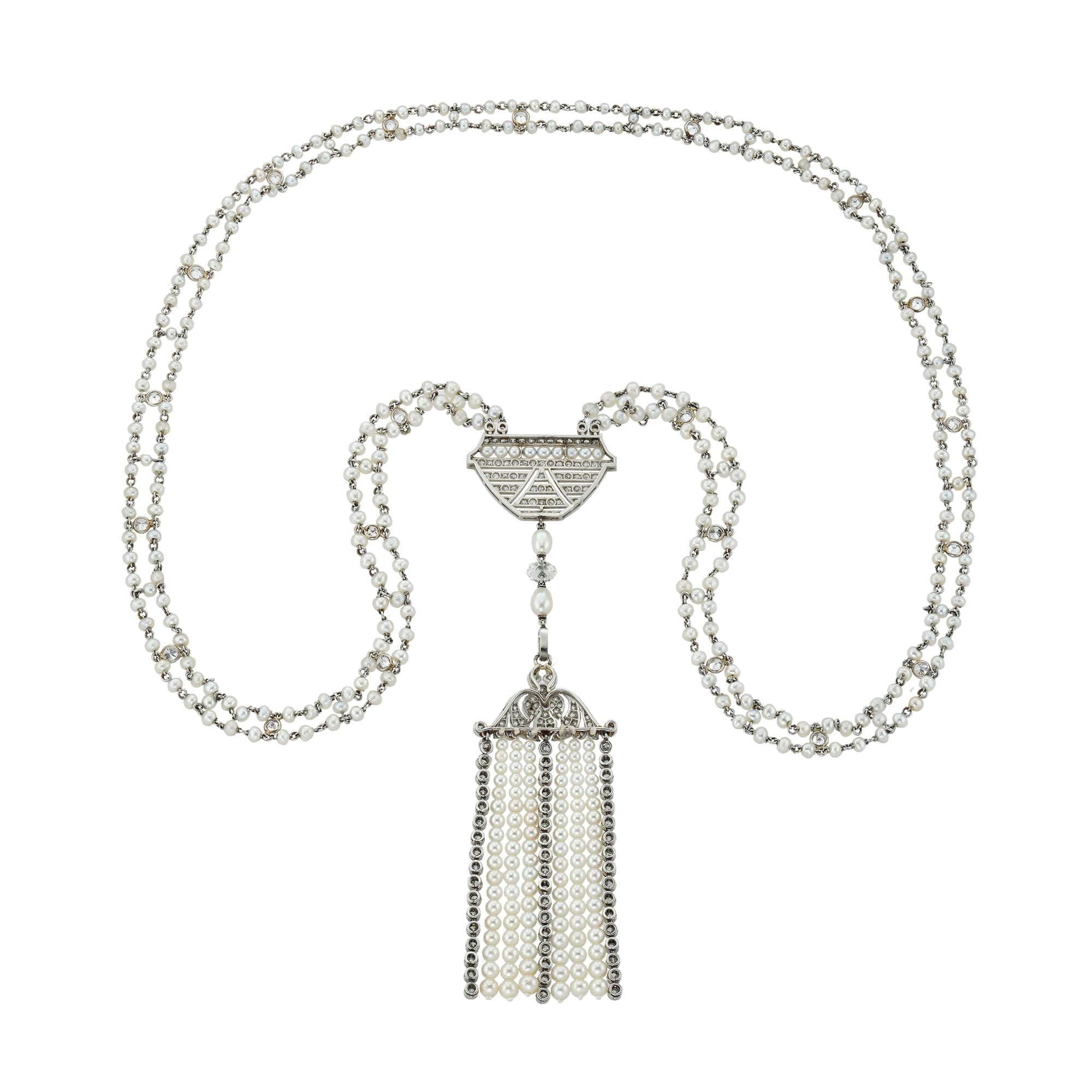 A Belle Epoque natural pearl and diamond sautoir necklace, centred with an openwork plaque of geometric design, encrusted with swiss-cut diamonds and pearls, suspending two pear-shaped pearls and a diamond bead terminating to a tassel, the scroll-designed top of the ...