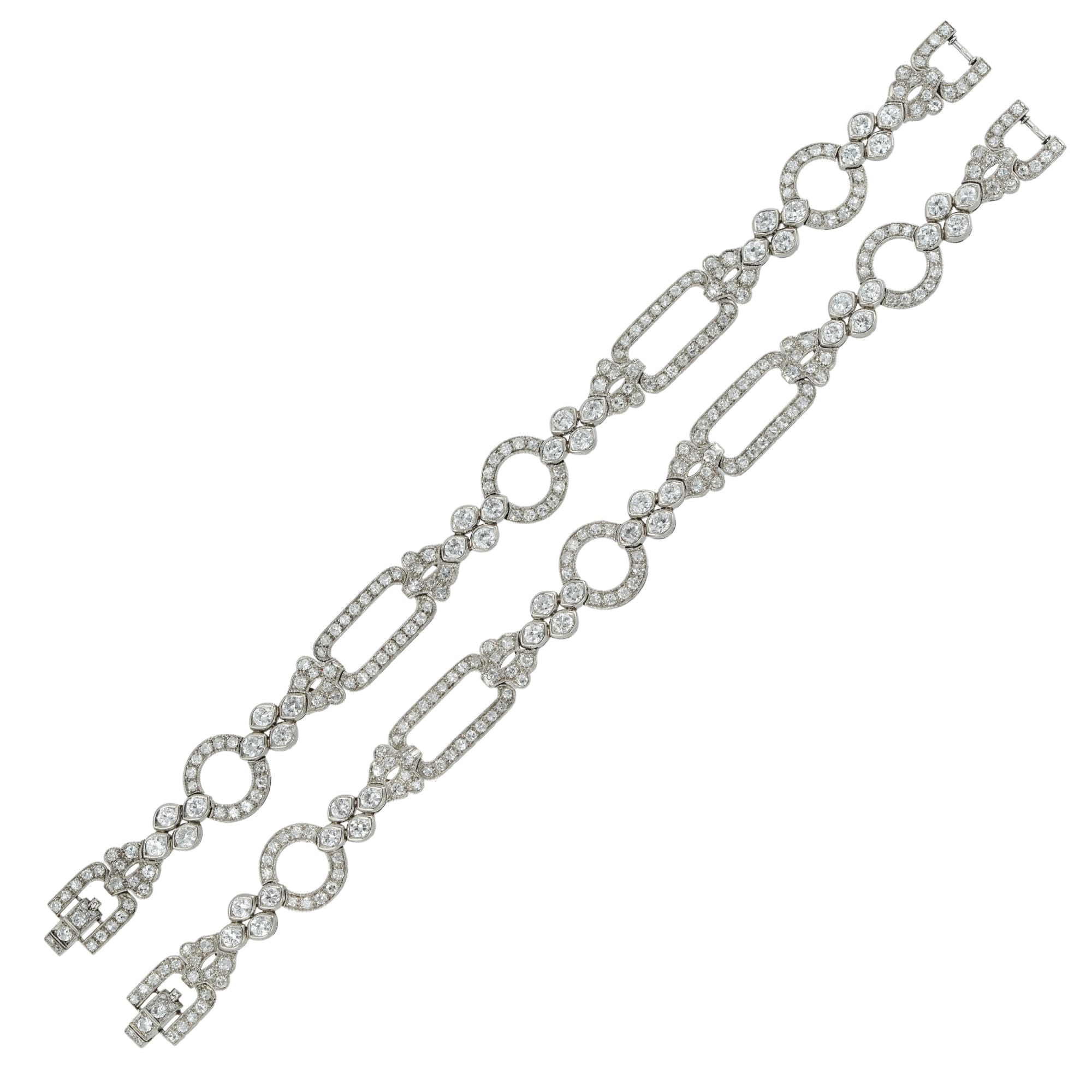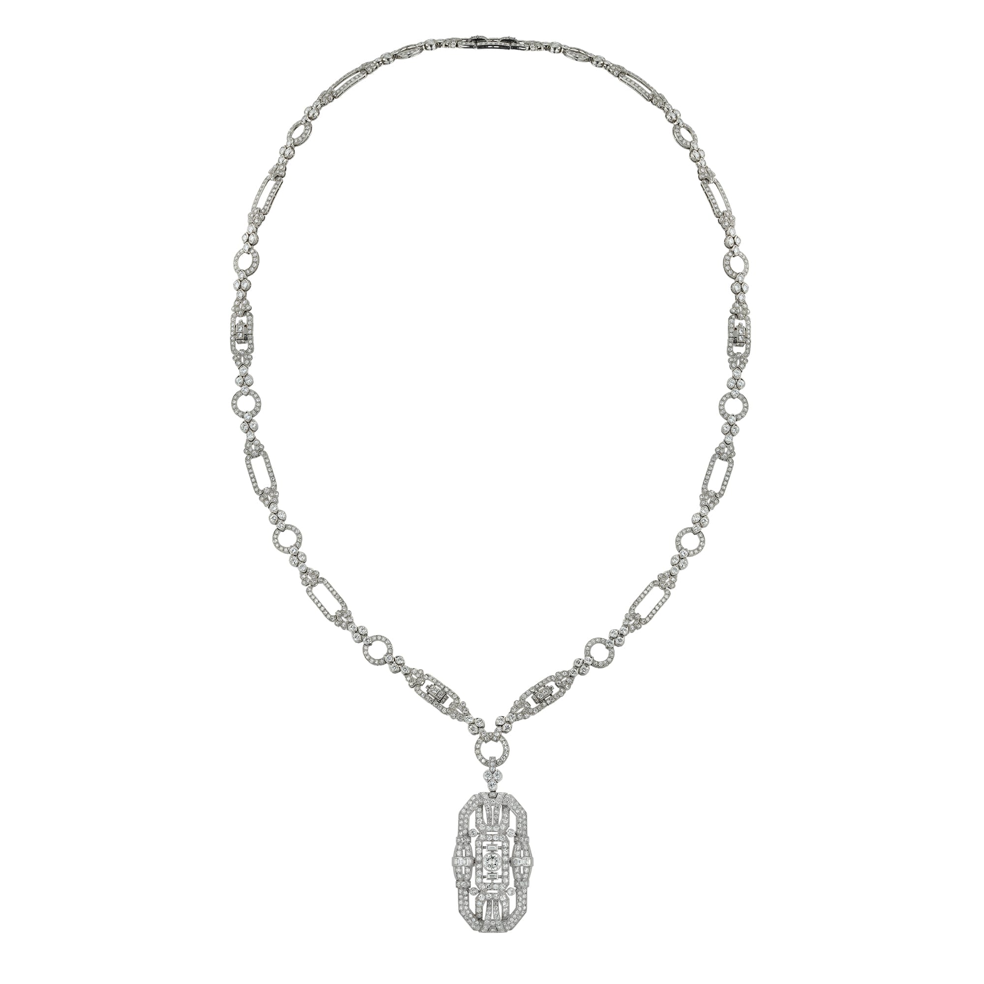 More informationAn Important Art Deco diamond-set sautoir, the necklace with rectangular and circular links, all set with old brilliant and swiss-cut diamonds, suspending a pendant centrally-set with a transition brilliant-cut diamond estimated to weigh 1.5 carats, assessed colour I and clarity VS1, to an openwork surround of geometric design, set with baguette, transition and swiss-cut diamonds, the diamonds estimated to weigh a total of 46 carats, all set in platinum mount, circa 1925, measuring approximately 78.5 cm long, gross weight 122.4 grams, converting to a shorter necklace accompanied by a pair of matching bracelets.