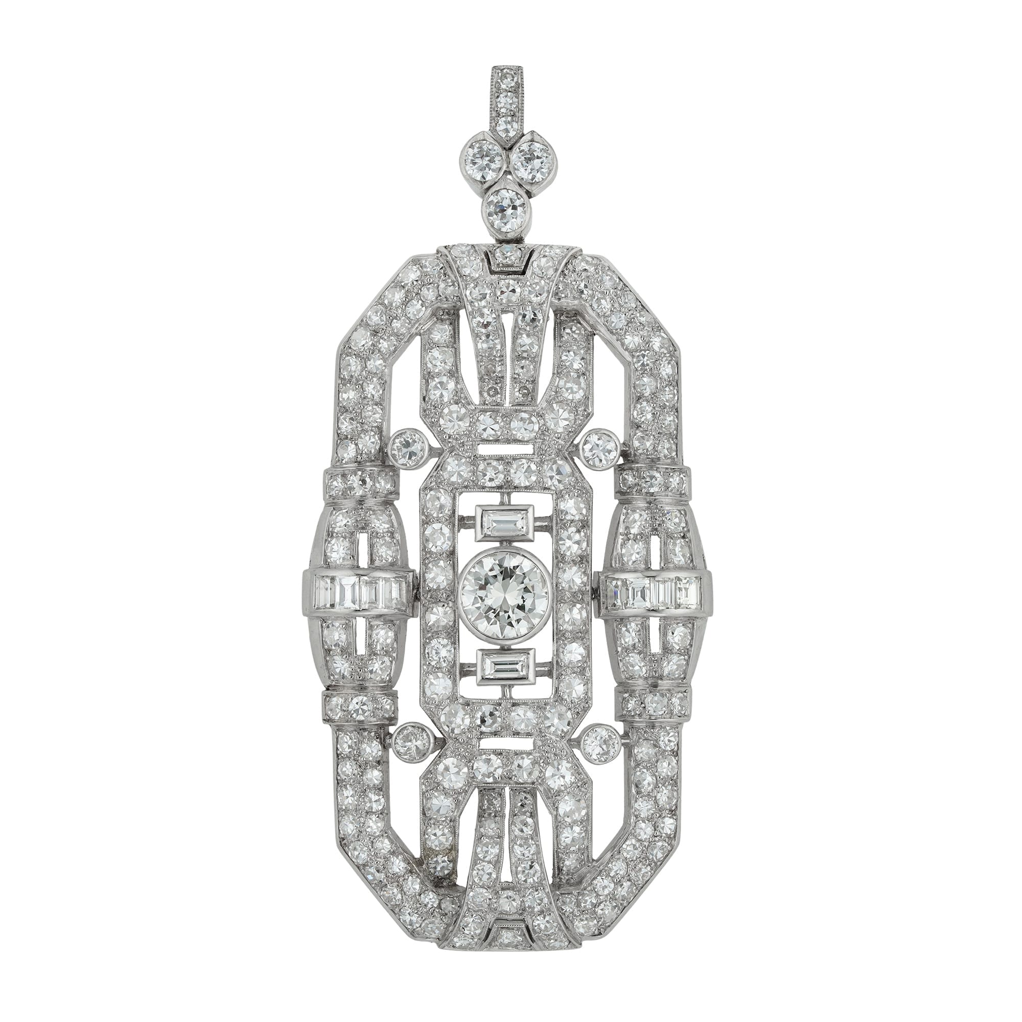 This stunning sautoir embodies Art Deco elegance and glamour. This piece features both angular and rounded links created from platinum and set with lively diamonds. The links form a long necklace with a dramatic central pendant. The necklace can ingeniously transform from the long necklace into a shorter necklace and two matching bracelets with a simple clasp mechanism. This allows this magnificent piece to be worn in a variety of ways to a range of different occasions.