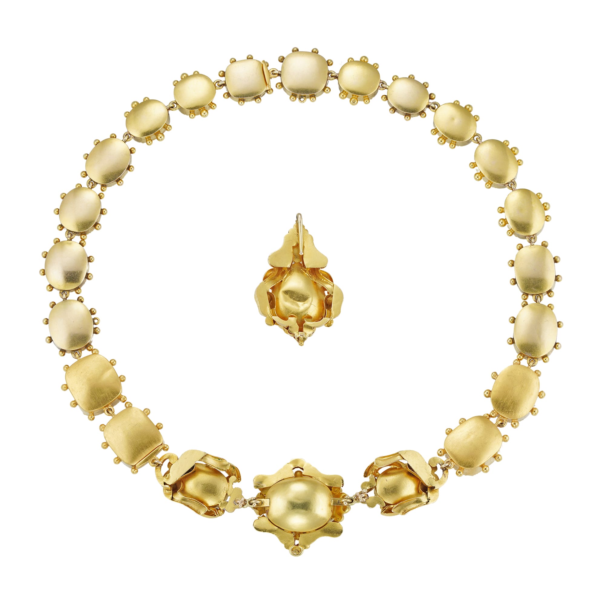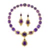 A late Georgian amethyst suite, the necklace centrally set with three oval faceted amethysts within gold scroll decorations, suspending a detachable drop with a pear-shaped and a small oval amethyst on a similar surround, attached to nineteen cushion and oval-cut ...