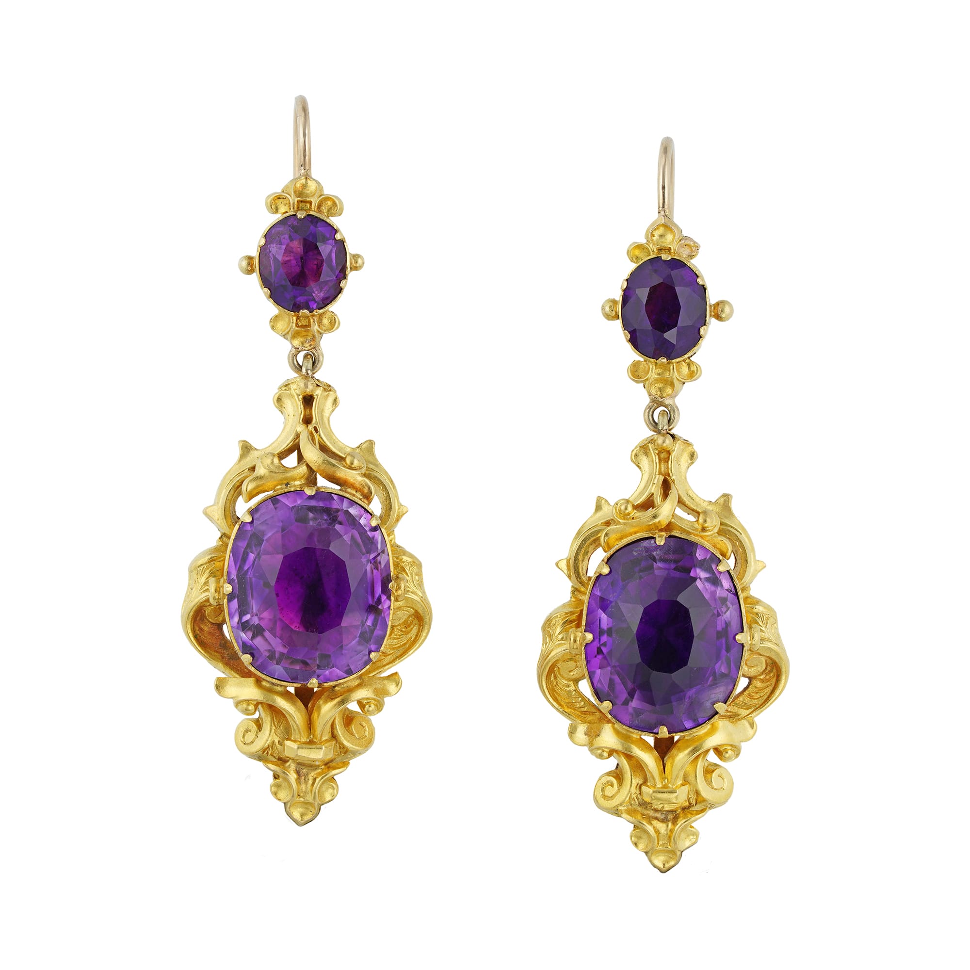 A late Georgian amethyst suite, the necklace centrally set with three oval faceted amethysts within gold scroll decorations, suspending a detachable drop with a pear-shaped and a small oval amethyst on a similar surround, attached to nineteen cushion and oval-cut faceted amethysts all set in closed-back collets, with a hidden snap clasp, accompanied by drop earrings of matching design, with gold wire fitting, all mounted in yellow gold, circa 1830, the necklace measuring approximately 41 x 6.3cm, the earrings measuring approximately 5.5 x 2cm, gross weight 88.6 grams.