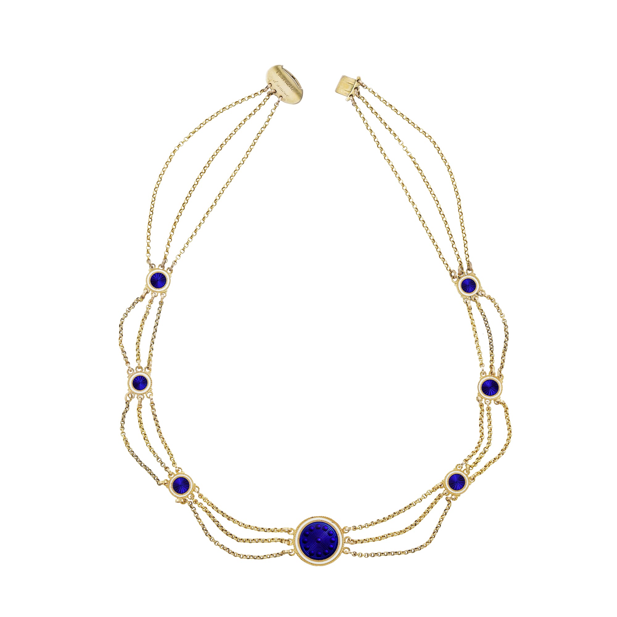 A Georgian enamel and gold necklace, consisted of seven round plaques graduating in size from the centre, each with blue guilloche enamel decoration surrounded by white enamel fame, connected by three strands of trace chain forming festoons, all to an oval clasp of similar design with a split pearl set at the centre, the reverse engraved ‘Chainette d’amour’ (little chain of love), circa 1800, measuring 40.8cm long, the central plaque measuring 1.7cm in diameter, gross weight 16.6 grams.