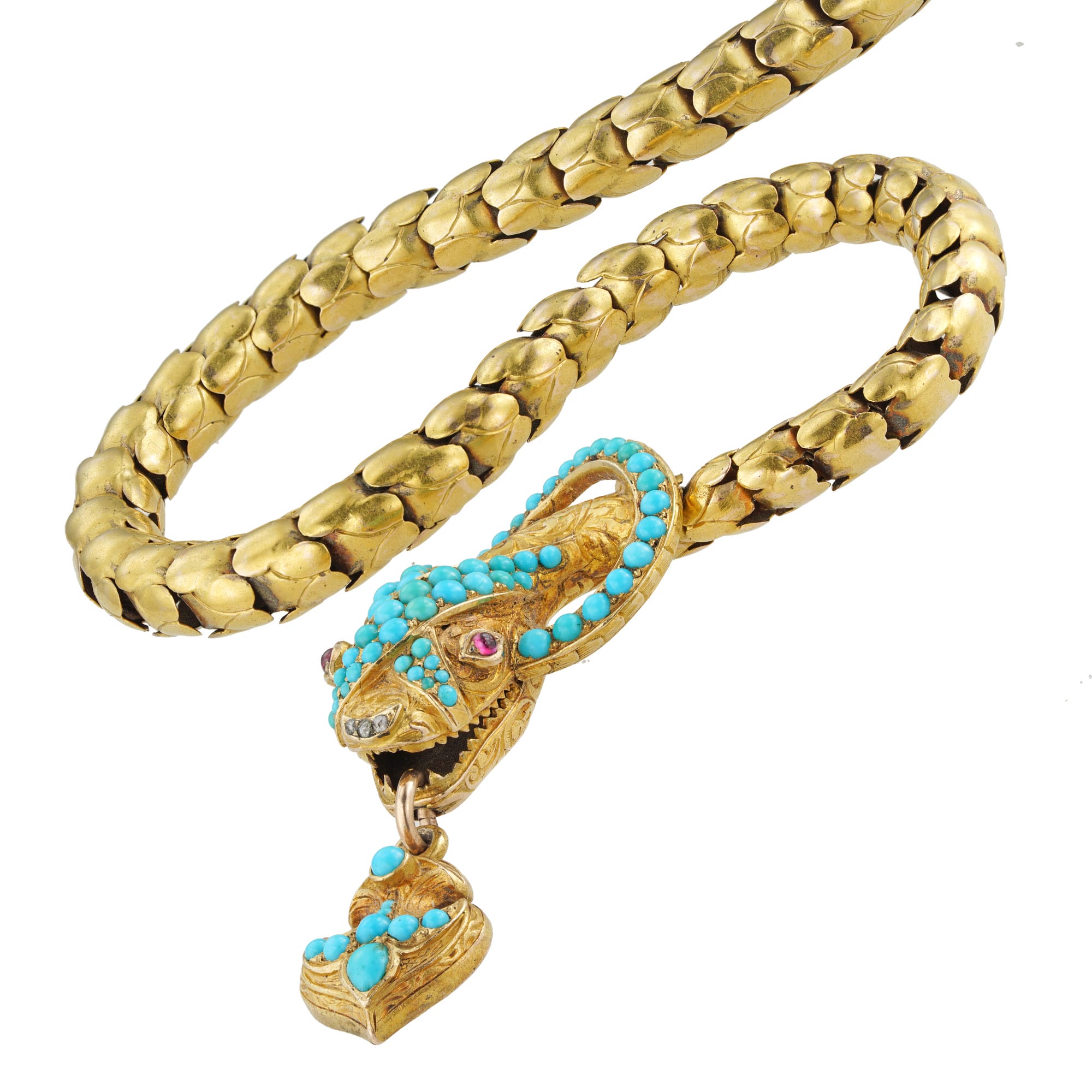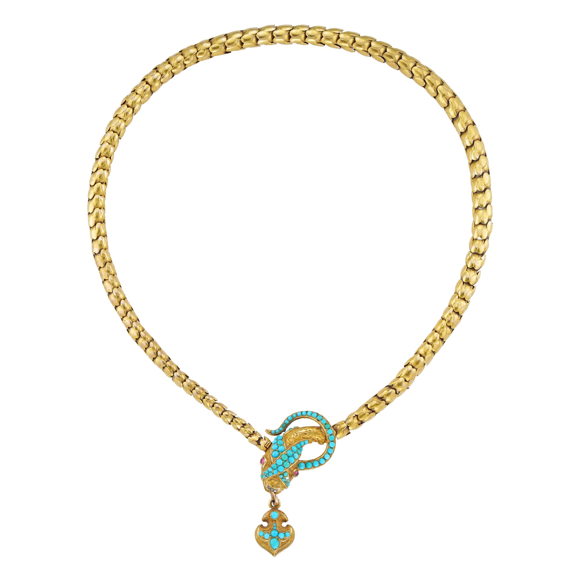 A Victorian turquoise and gold snake necklace, the realistically formed serpent with graduated snake scale-link body, the head set with small round cabochon-cut turquoise on a finely scroll engraved background, with cabochon-cut ruby-set eyes, suspending from its mouth a turquoise-set ...