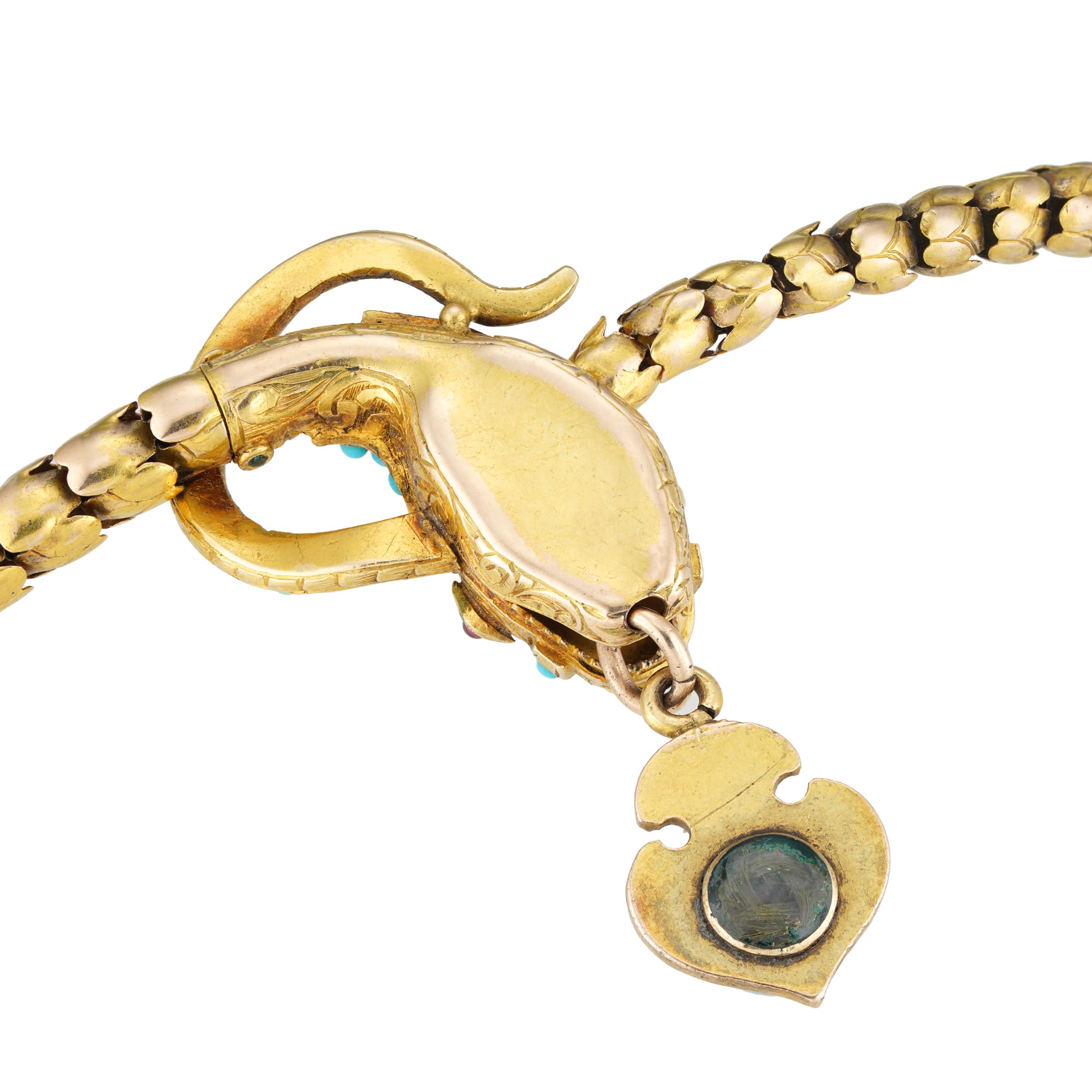 More informationA Victorian turquoise and gold snake necklace, the realistically formed serpent with graduated snake scale-link body, the head set with small round cabochon-cut turquoise on a finely scroll engraved background, with cabochon-cut ruby-set eyes, suspending from its mouth a turquoise-set gold anchor with a glazed locket compartment to reverse containing woven hair, all mounted in gold with hidden clasp, circa 1840, measuring 45.5 x 2cm, gross weight 39 grams.