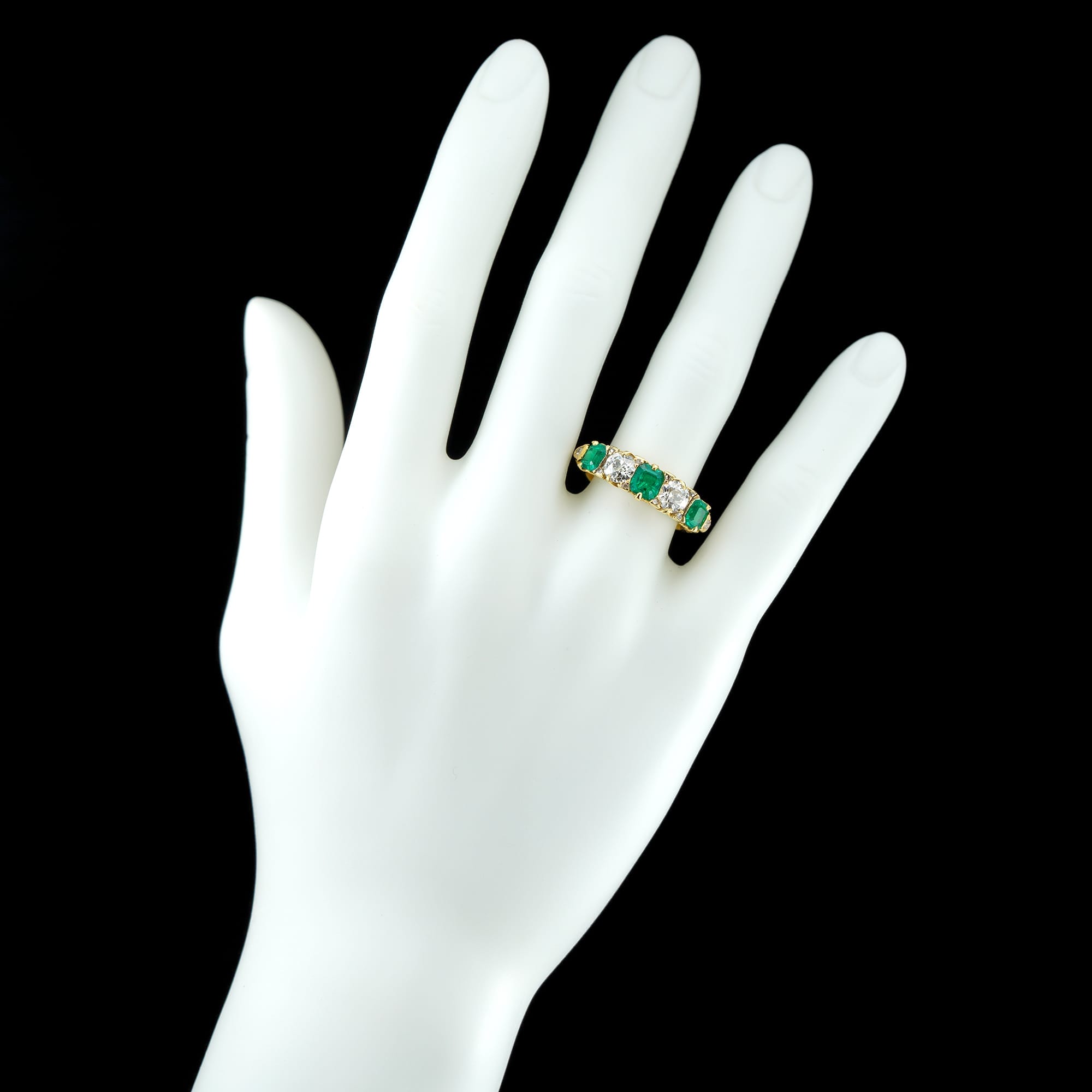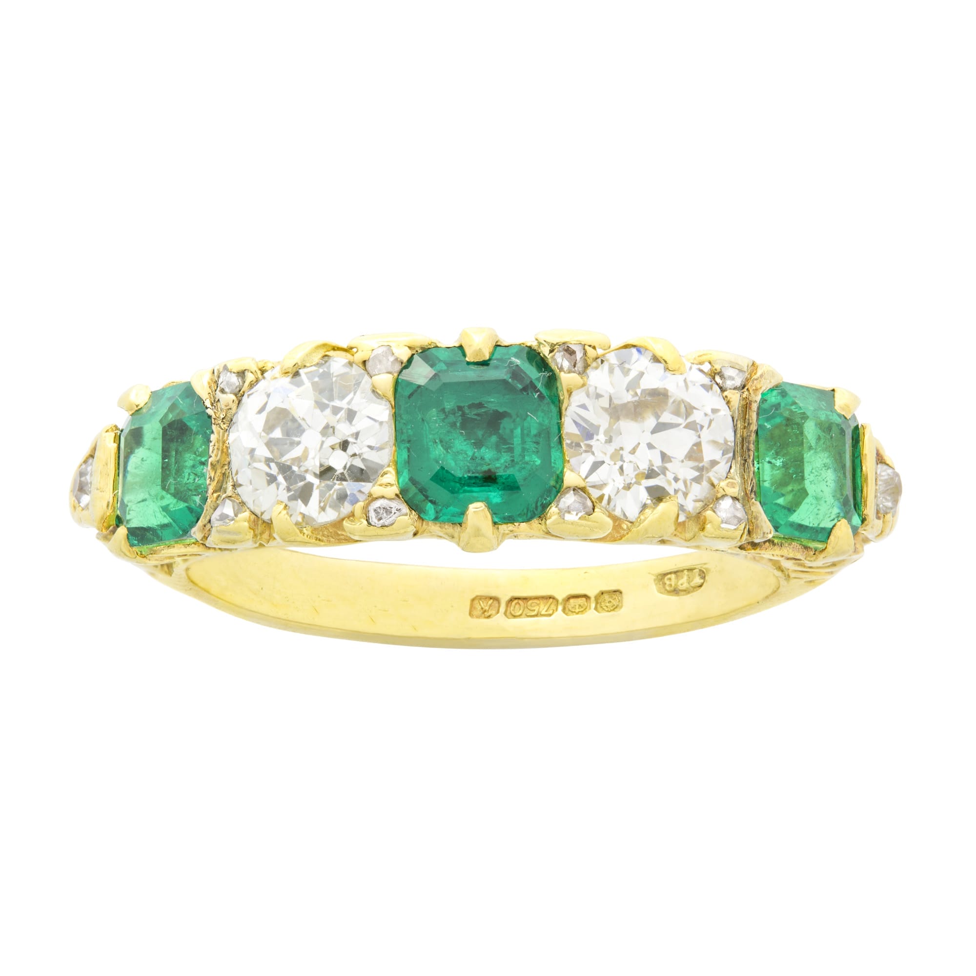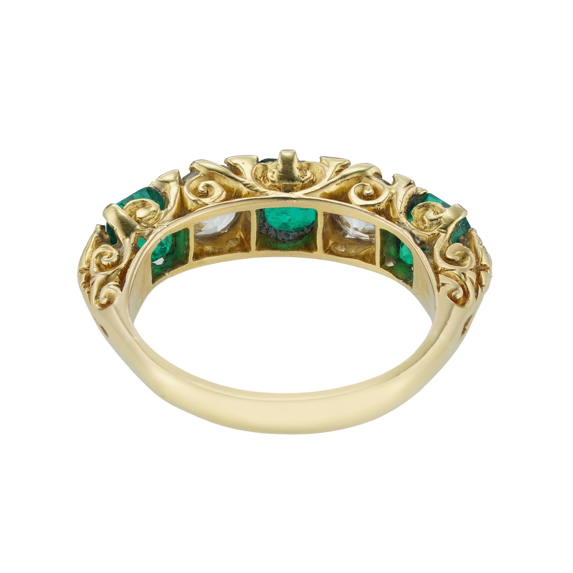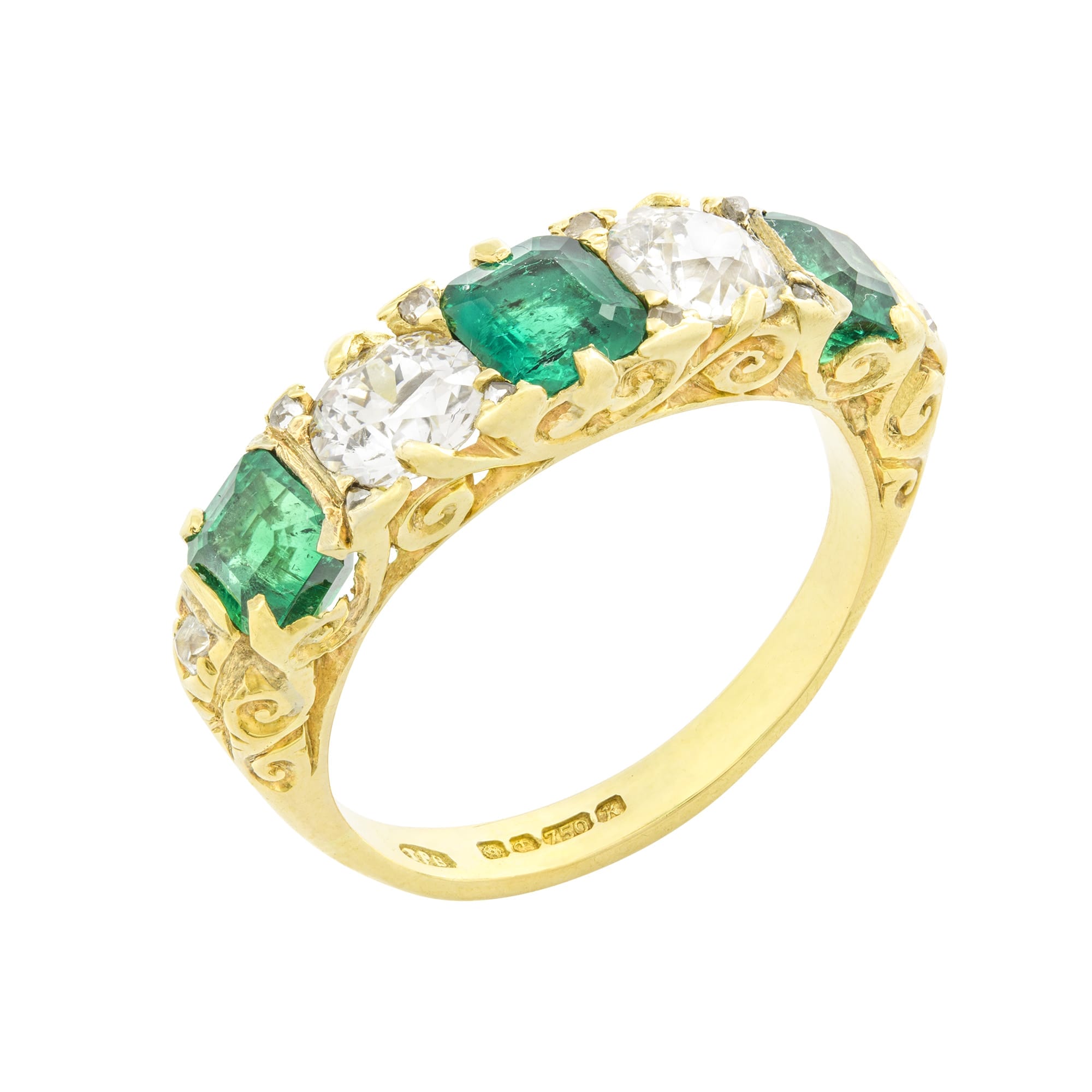 An emerald and diamond five-stone Victorian style ring, the three old octagonal-cut emeralds weighing 1.29 carats, accompanied by GCS report stating to be of Colombian origin, claw set between two old European-cut diamonds each estimated to weigh approximately 0.5 carats, with rose-cut diamond points between, all mounted in yellow gold mount with scroll carved gallery and carved shoulders, hallmarked 18 carat gold London 1984, the head measuring 0.6×2.3cm, finger size L, gross weight 4.9 grams