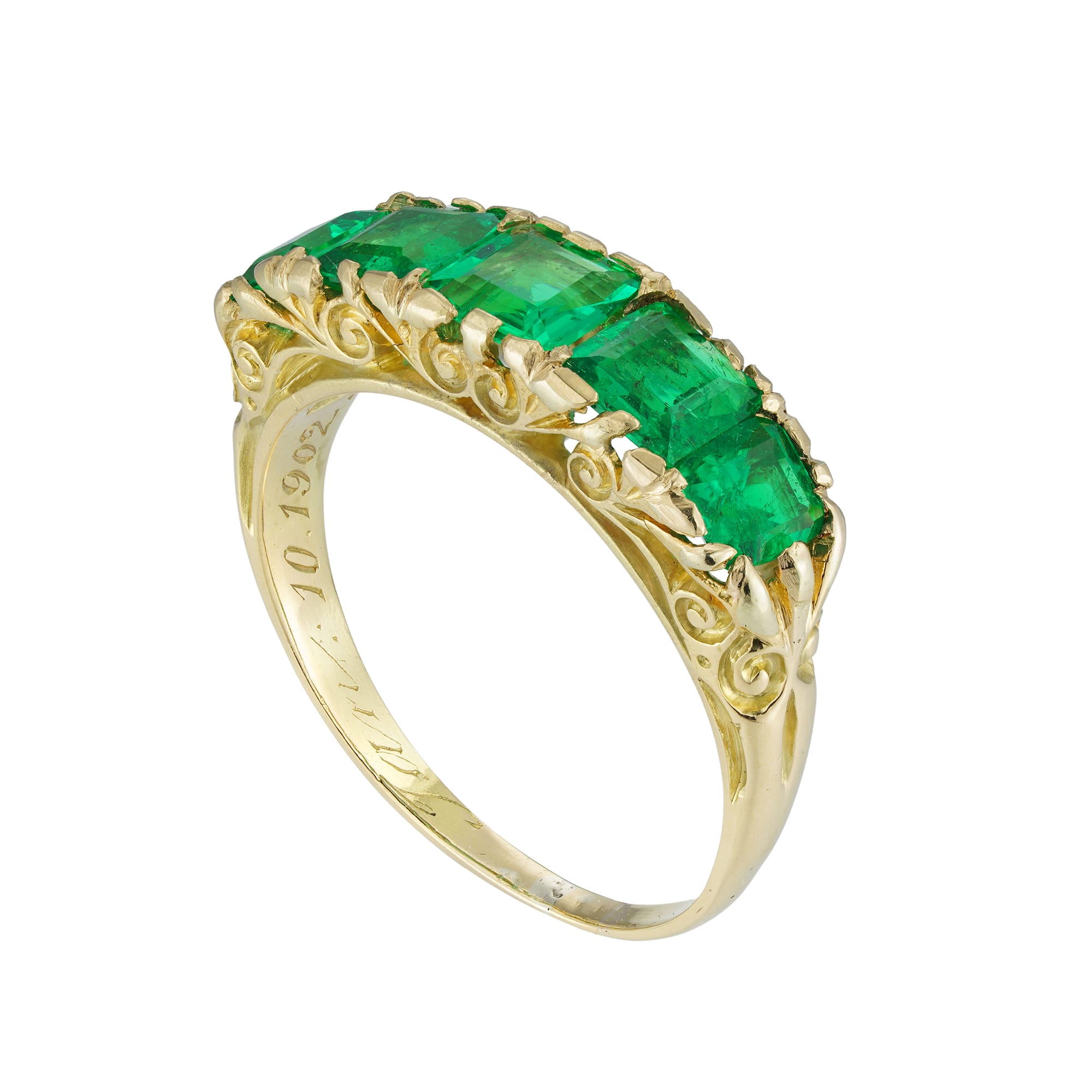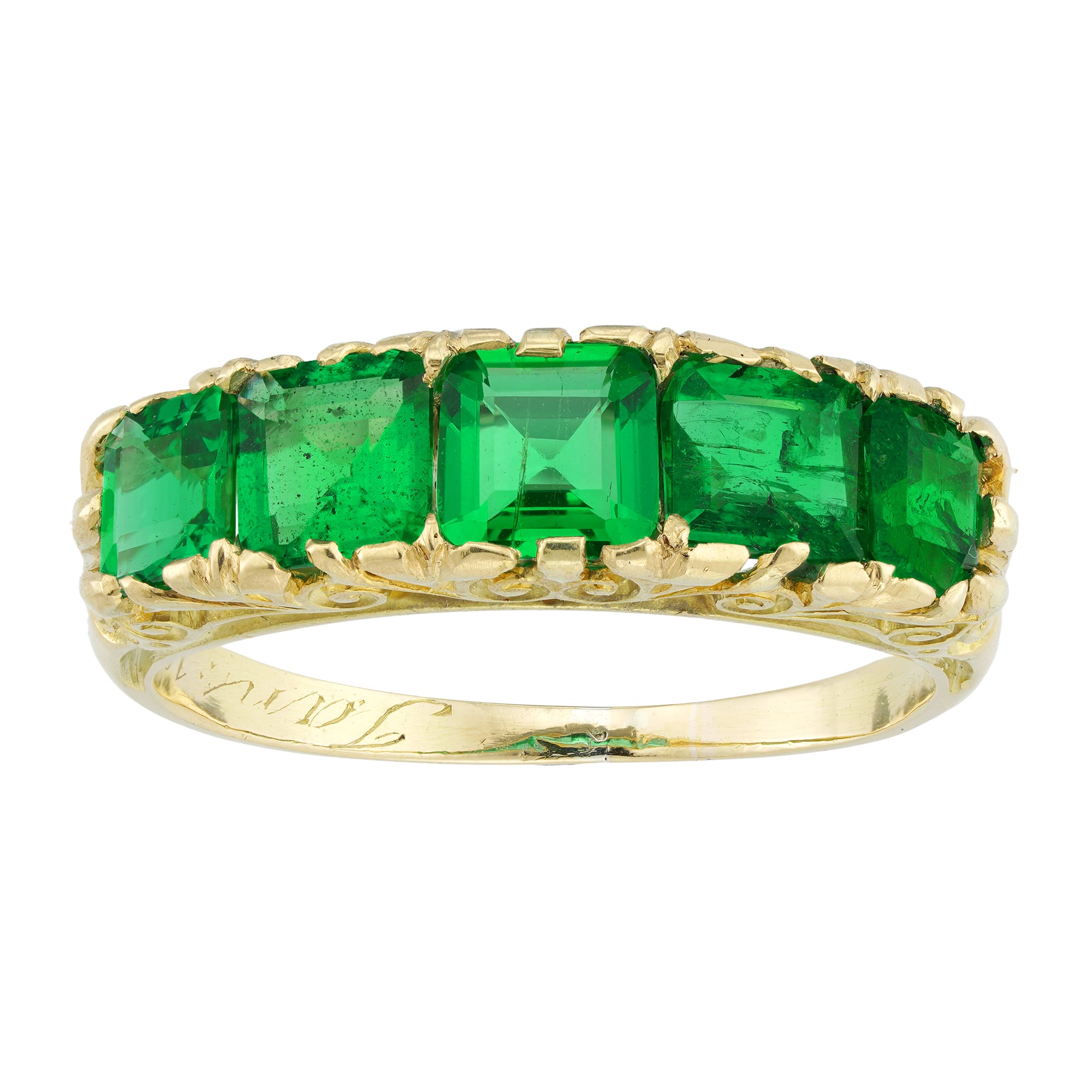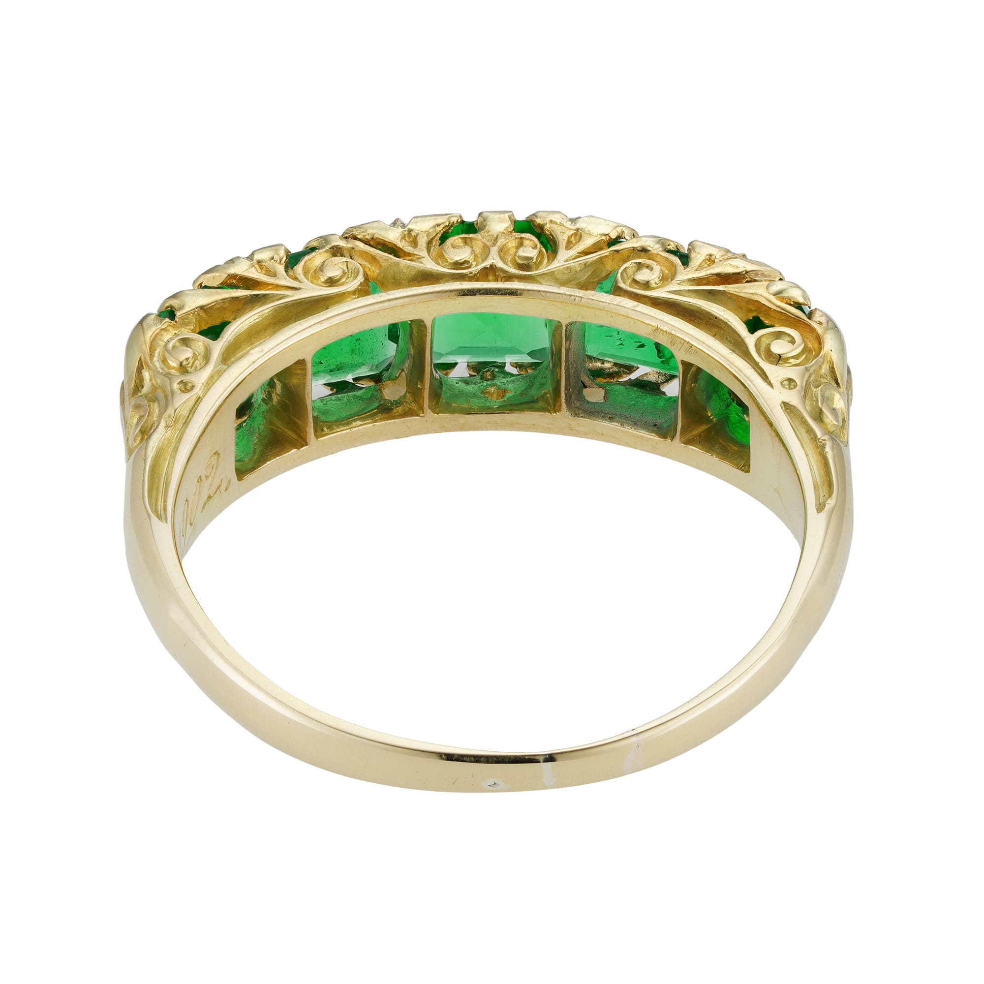 A Victorian five stone Colombian emerald ring, the five square-cut emeralds weighing 1.74 carats in total, accompanied by Gem & Pearl Laboatory certificate stating to be of Colombian origin, all claw-set to a bright yellow gold ornately scrolled carved gallery, all to a tapered D-section yellow gold shank, marked ‘Jan 10.1902’, measuring approximately 2.1 x 0.6cm, finger size O ½, gross weight 4.9 grams.