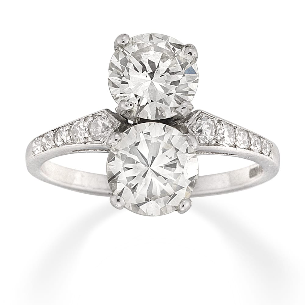 A vintage two-stone diamond ring, the round brilliant-cut diamonds, weighing 1.01 and 1.18 carats, accompanied by De Beers reports stating the first to be of N colour and VS2 clarity and the second to be of N colour and SI1 ...