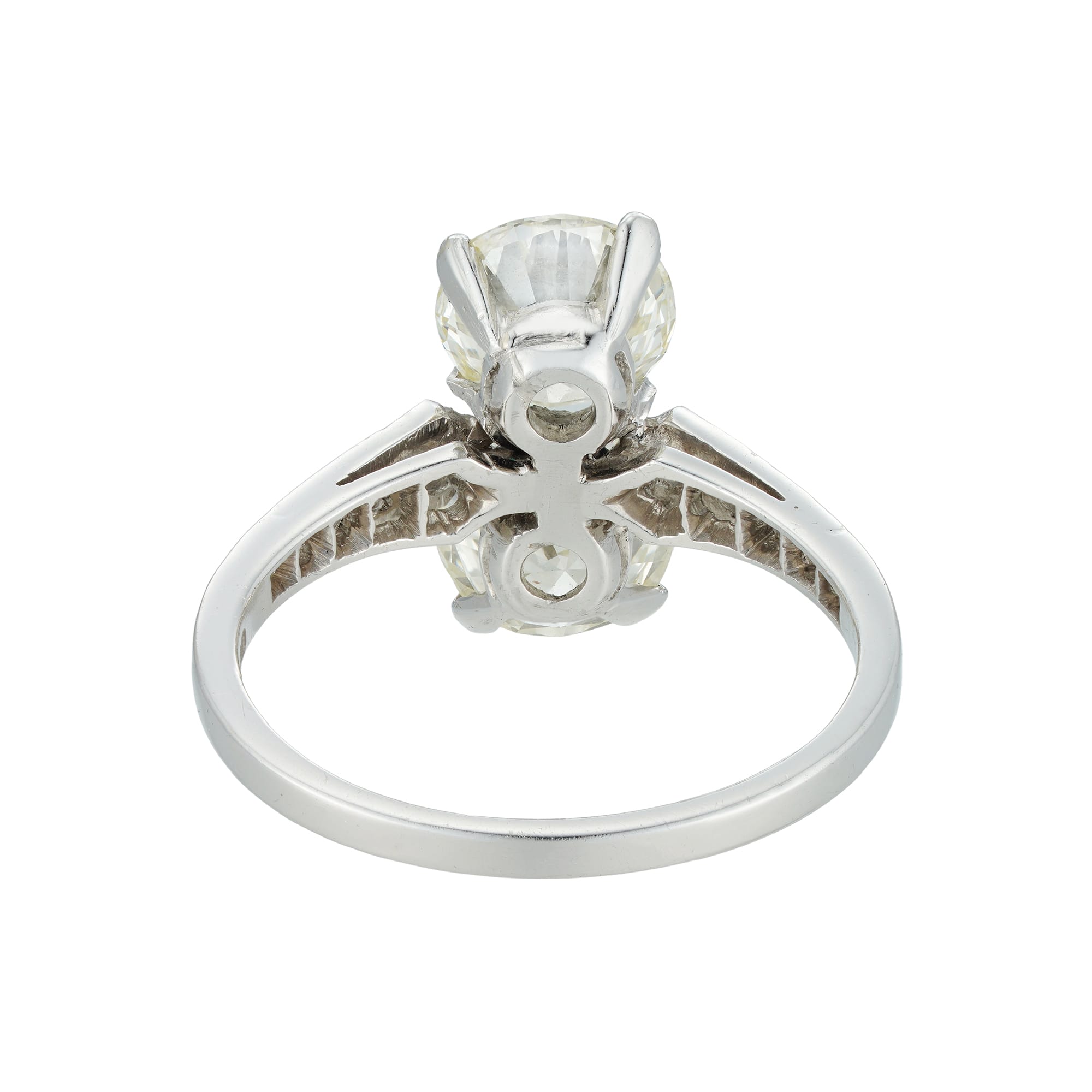 A vintage two-stone diamond ring, the round brilliant-cut diamonds, weighing 1.01 and 1.18 carats, accompanied by De Beers reports stating the first to be of N colour and VS2 clarity and the second to be of N colour and SI1 clarity, each four claw-set in a vertical formation, to a tapered square-section shank with five graduated eight-cut diamonds set to each shoulder, circa 1930, later hallmarked platinum, London 2010, bearing the Bentley & Skinner sponsor mark, head measuring 1.4 x 1.6 cm, finger size L, gross weight 3.8 grams.