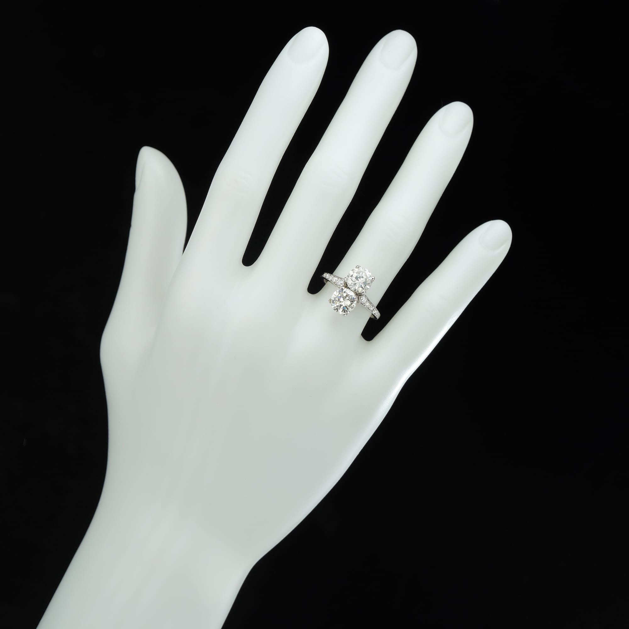 A spectacular diamond ring. This ring features two impressive diamonds stacked vertically, creating a ‘moi et toi’ or ‘me and you’ symbol. The two diamonds are flanked by elegant, tapered shoulders set with glittering diamonds. This sophisticated ring is a perfect and unique engagement ring.