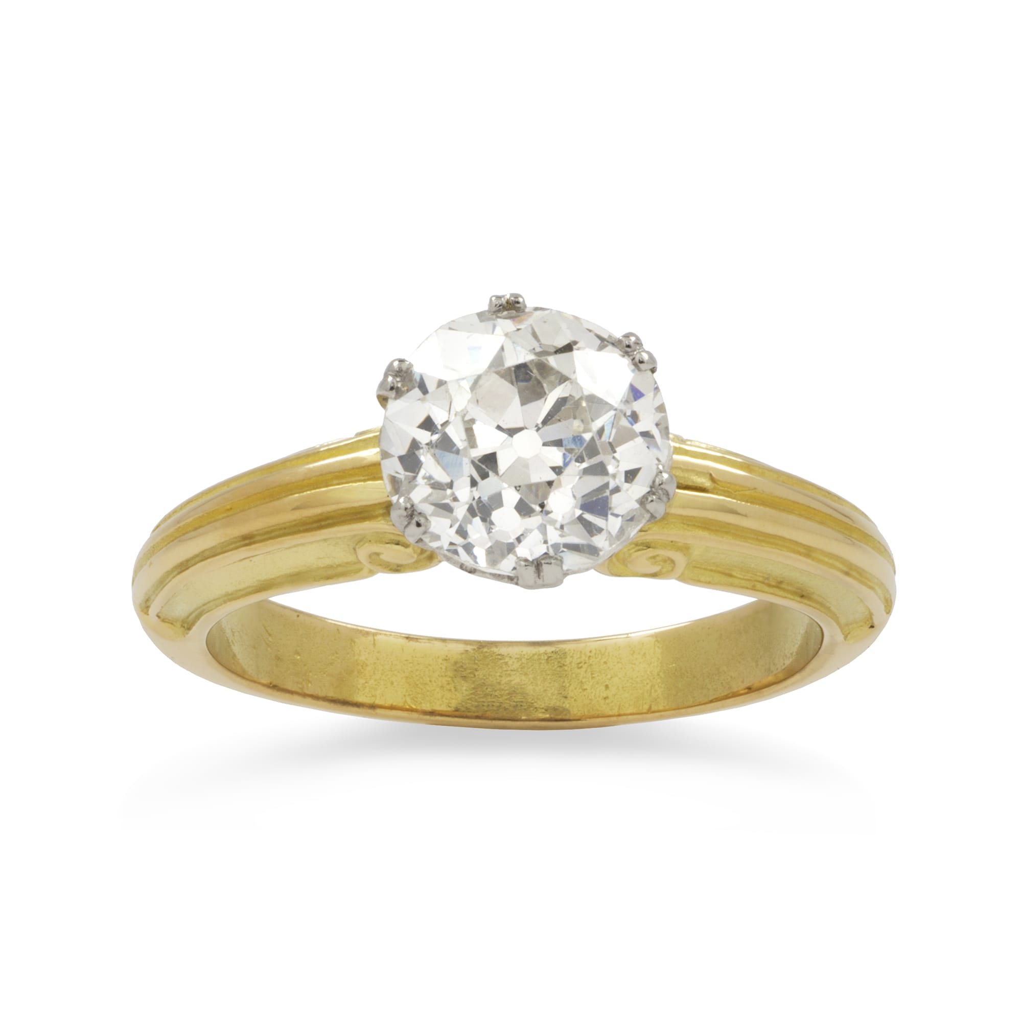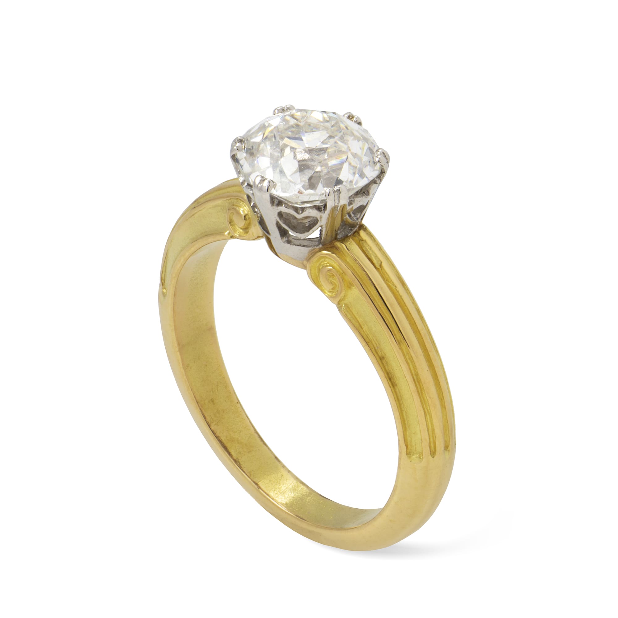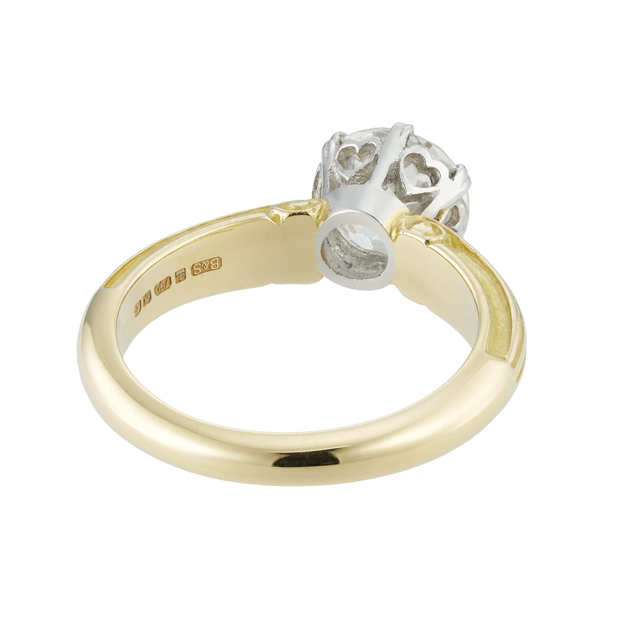 A single diamond ring, the old European-cut diamond, weighing 1.28 carats, accompanied by AnchorCert report, stating to be of G colour, SI2 clarity, set to a six double claw collet made in platinum, the gallery with heart-shape decorations, to a yellow gold shank with scroll design, hallmarked 18ct gold, London, made by Bentley & Skinner, size G, gross weight 3.8 grams.