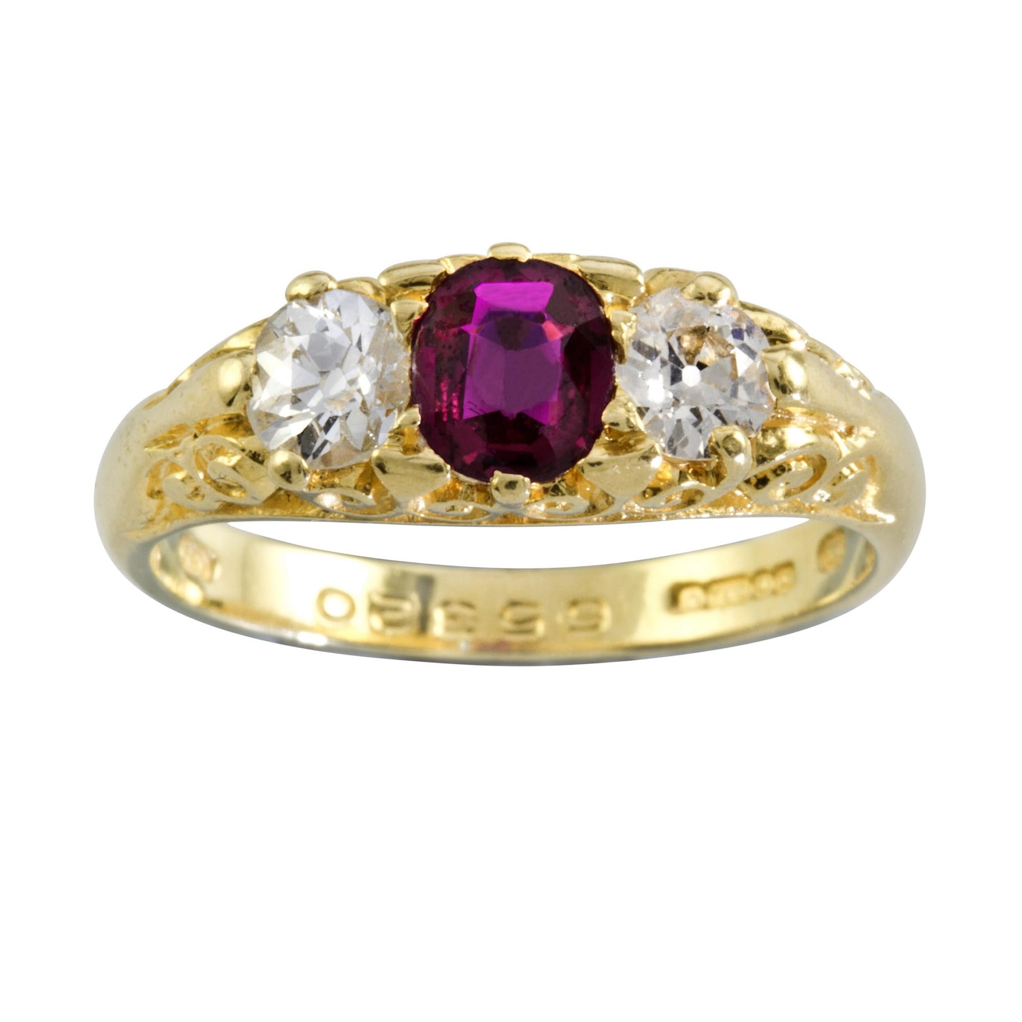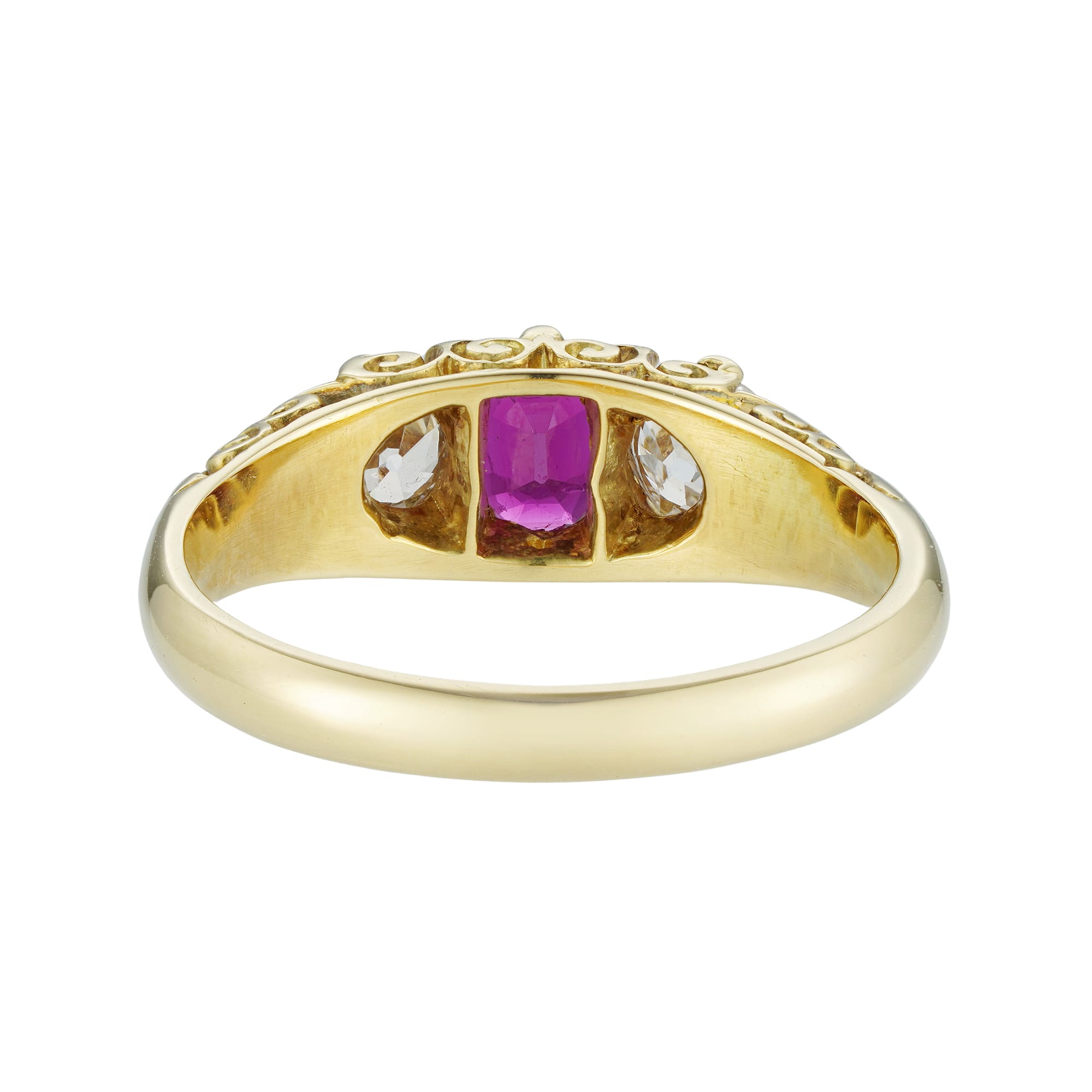 A ruby and diamond three stone ring, the cushion shape faceted ruby estimated to weigh 0.5 carats, flanked by two round brilliant-cut diamonds estimated to weigh 0.45 carats in total, all claw set to a gold mount with scroll engraved ...