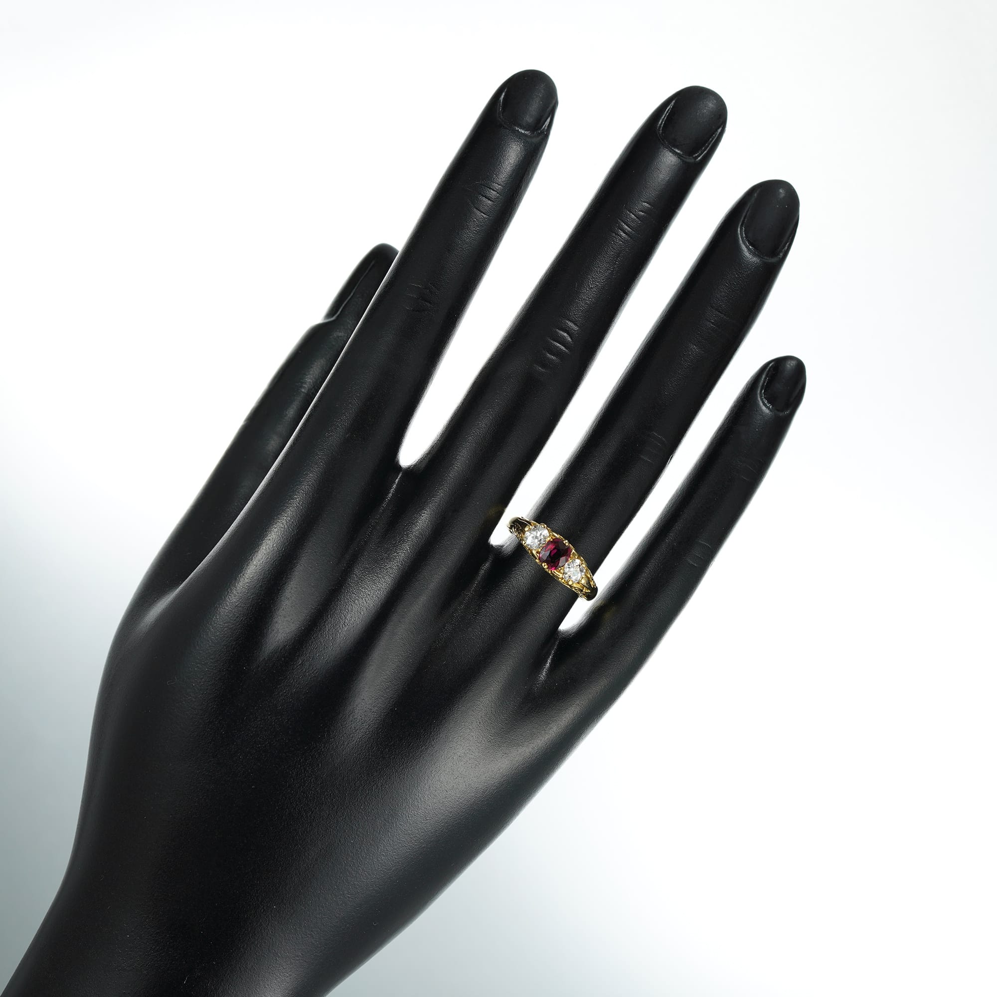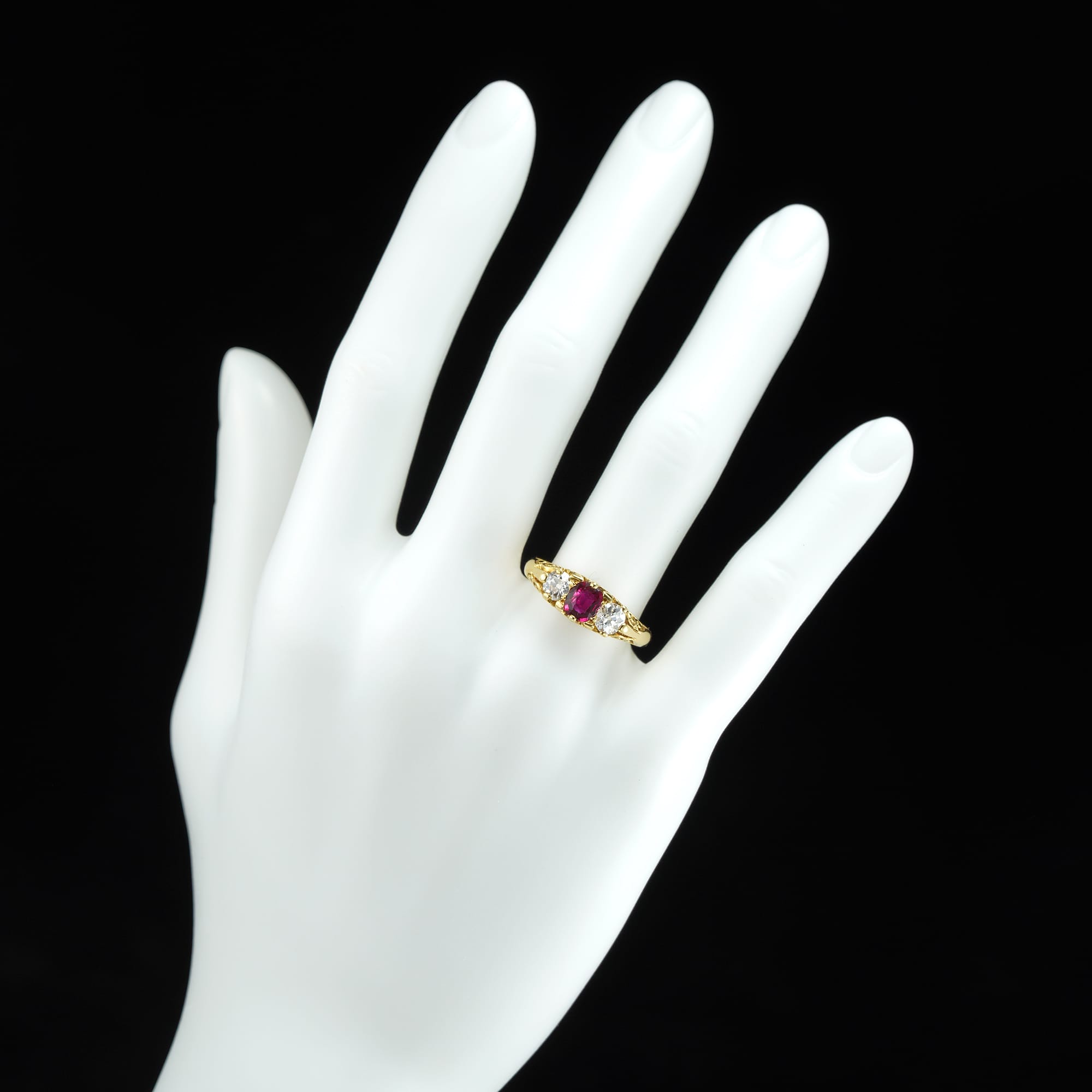 A lovely ruby and diamond ring. This ring draws stylistic inspiration from the ornate styles of the late Victorian era, featuring a central vivid ruby and two scintillating diamonds set in a detailed gold mount. The gold mount features scroll engravings, which were popular in the late nineteenth century. The yellow gold setting adds warmth and complements the beautiful ruby and diamonds. This piece would add colour and sparkle to everyday wear.