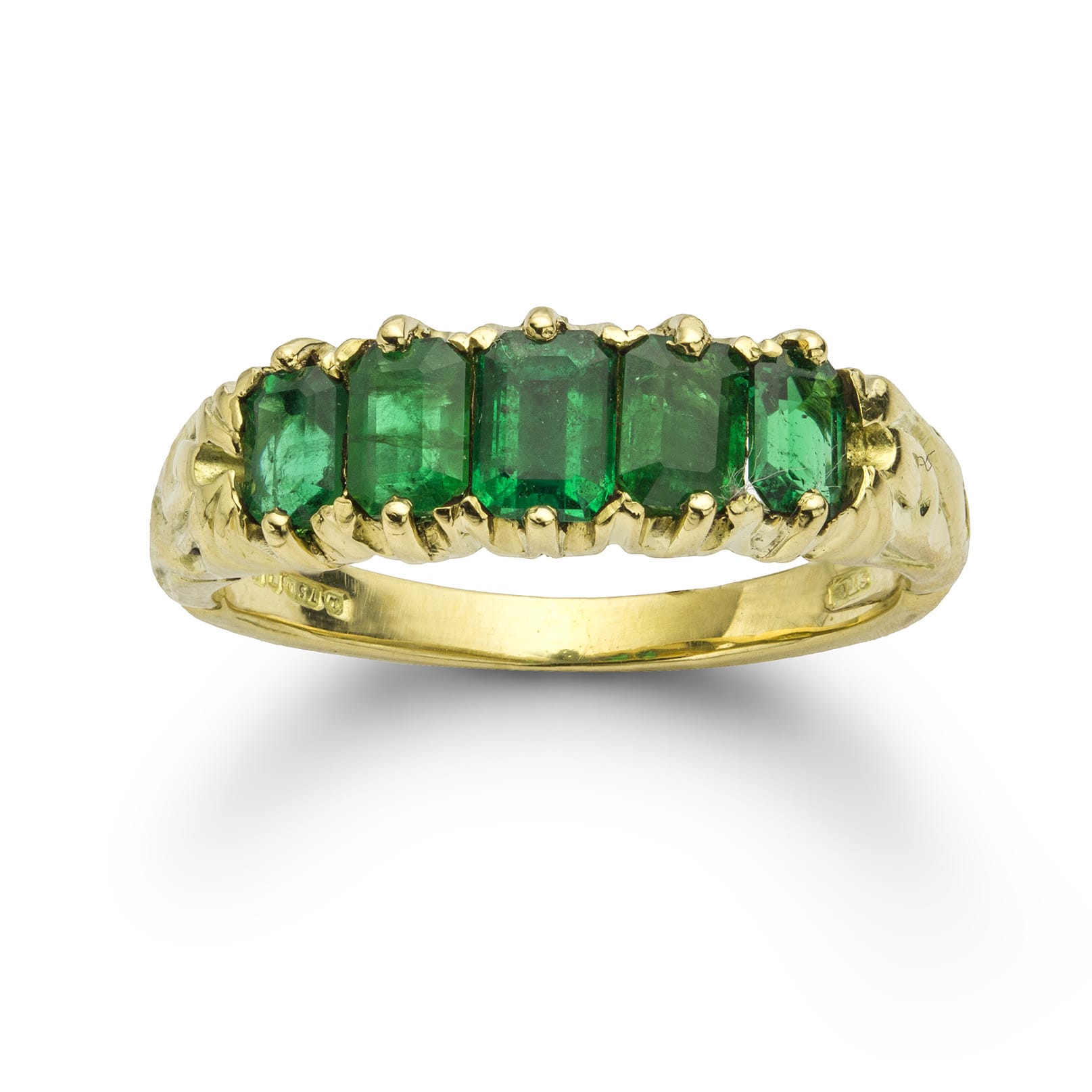 A vintage five stone emerald and gold ring, the five octagonal-cut emeralds weighing 1.10 carats in total, accompanied by GCS report stating to be of Zimbabwean origin, all claw-set in yellow gold mount of Victorian style with carved shoulders, hallmarked ...