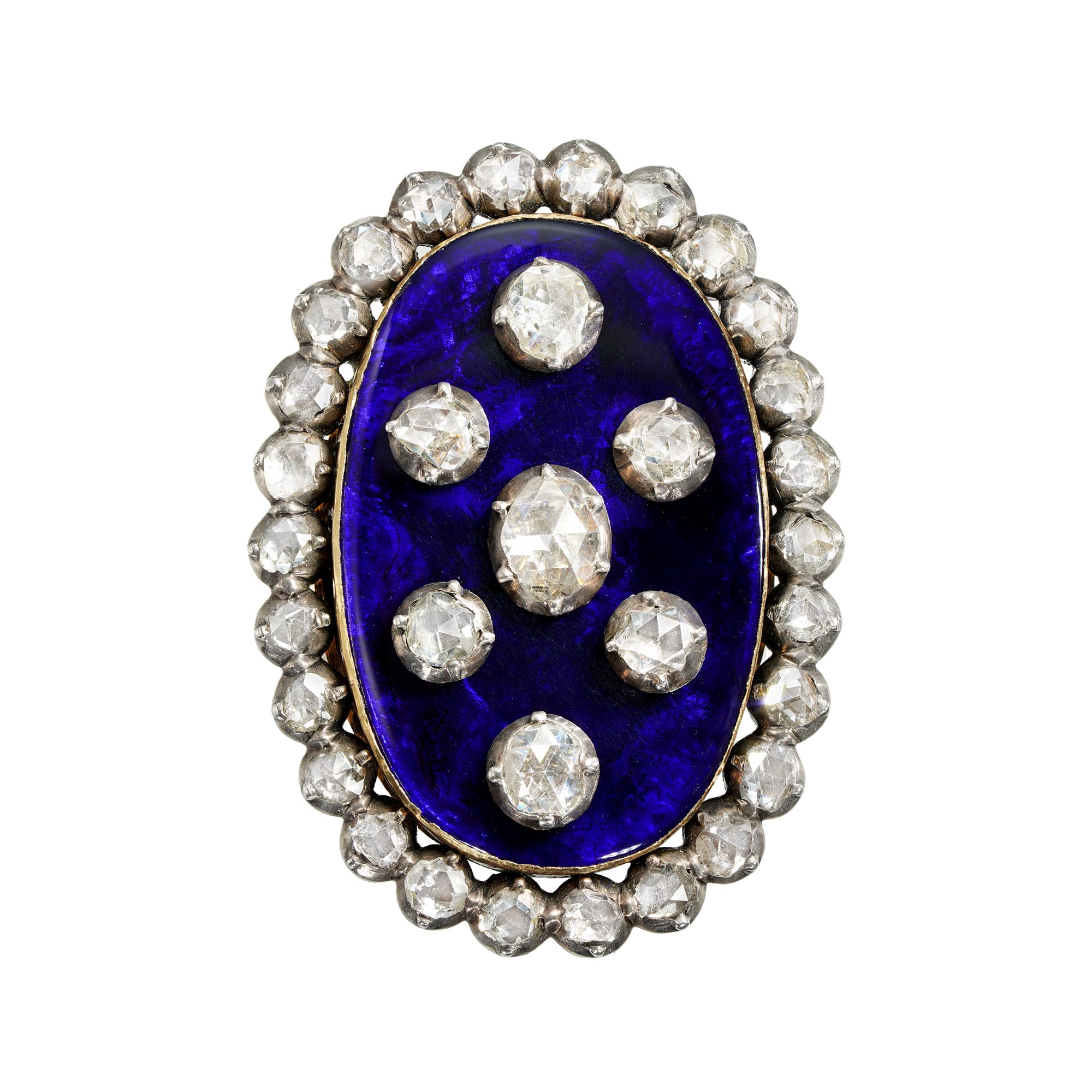More informationA Georgian Bague au Firmament blue enamel and diamond ring, the oval blue enamel set to the centre with an oval rose-cut diamond, surrounded by six round rose-cut diamonds all diamonds cut-down silver collet-set on enamel, to a rose-cut diamond-set boarder, diamonds estimated to weigh 1.50 carats in total, to a gold mount with tapering shoulders, circa 1800, head measuring 3.7×2.6cm, finger size J, gross weight 22.3 grams.
