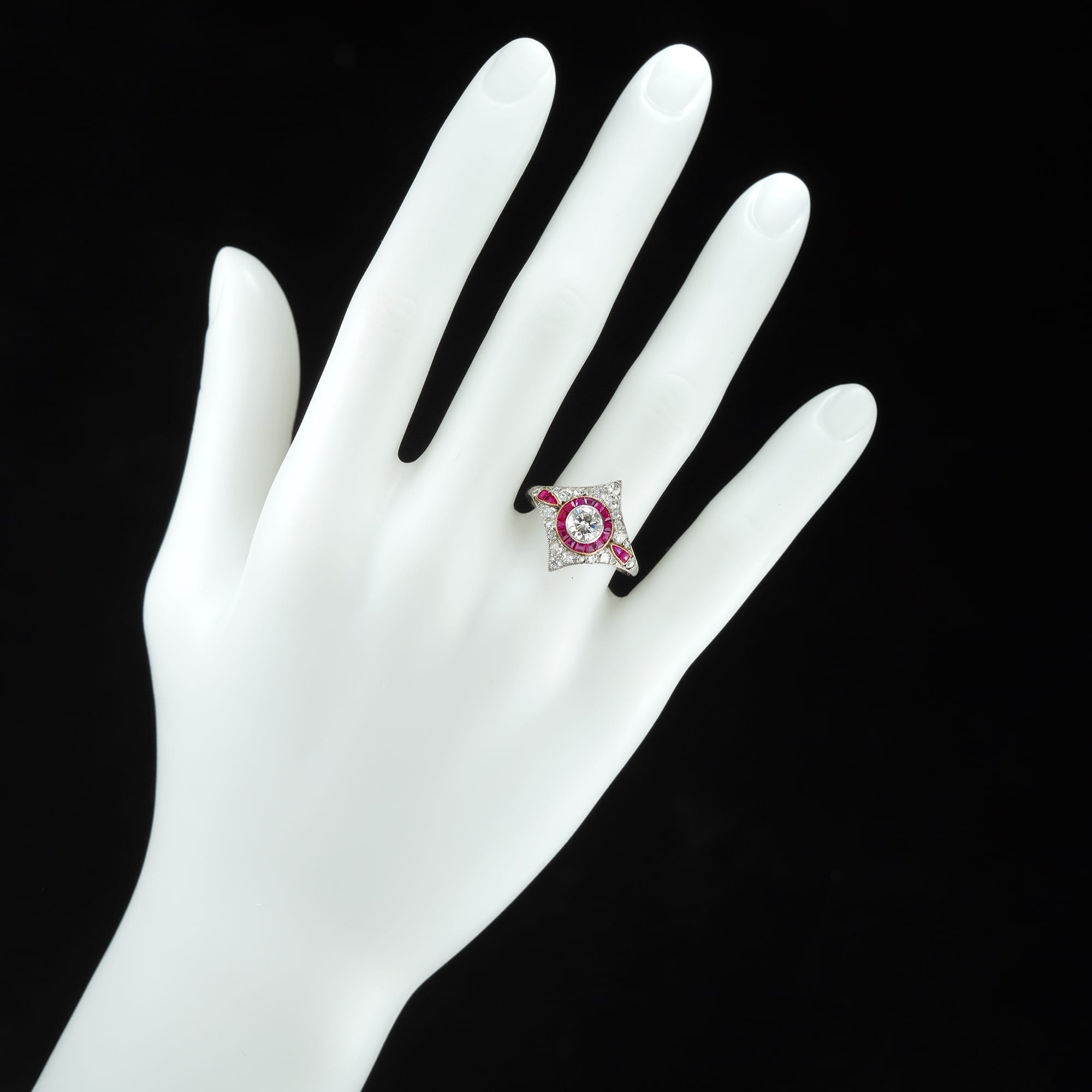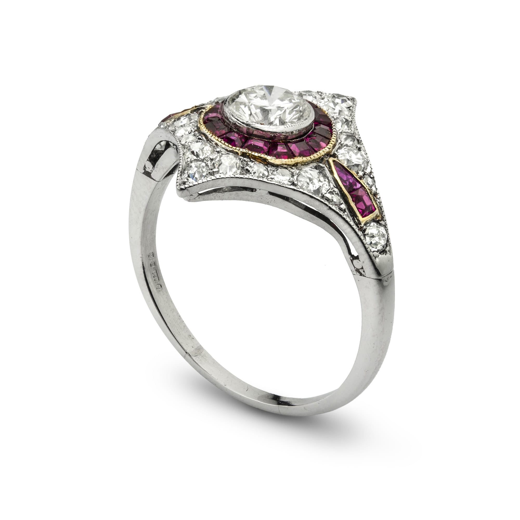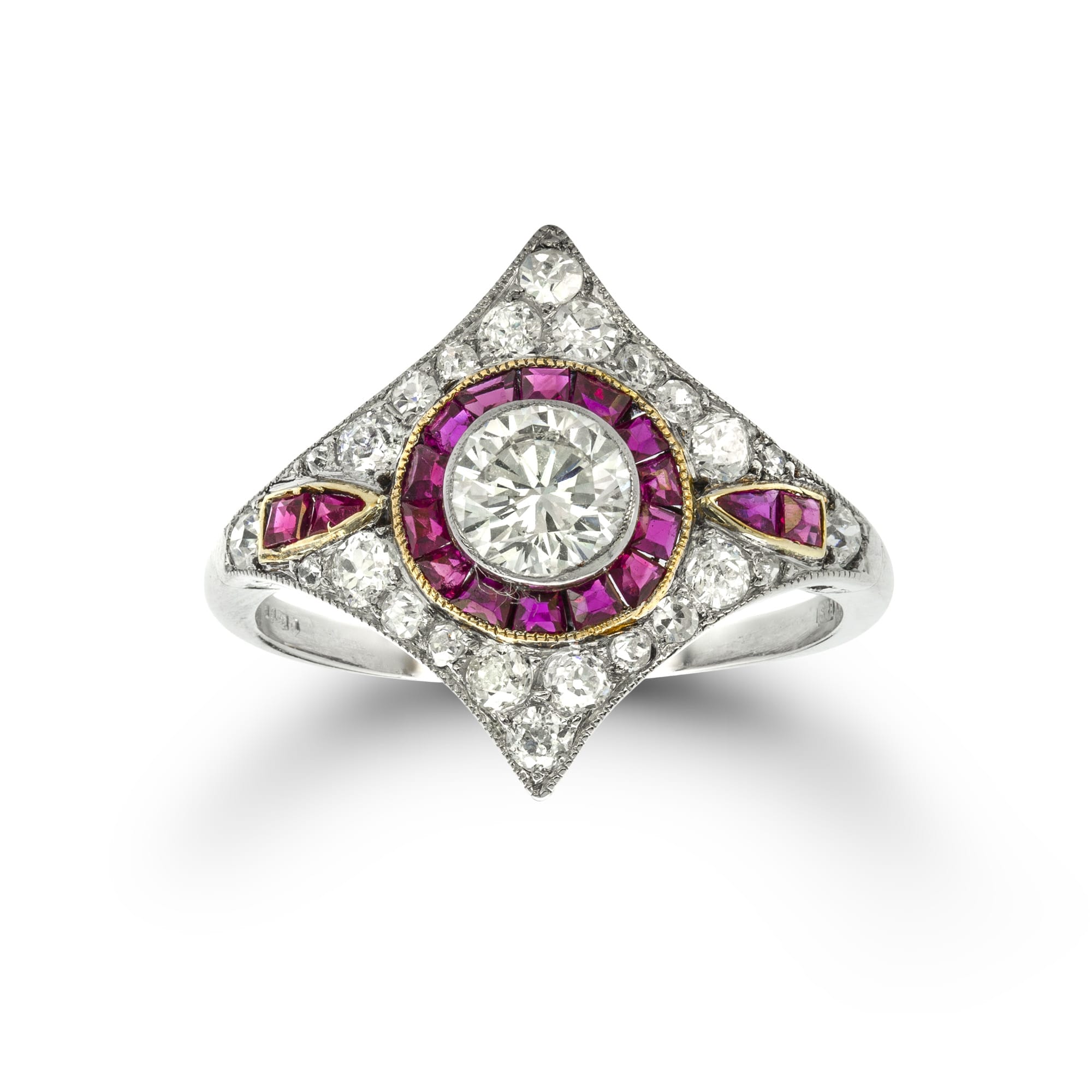 A ruby and diamond ring, the central round brilliant-cut diamond estimated to weigh 0.55 carats millegrain-set within a circle of calibré-cut rubies to a kite shape surround of pave-set old-cut diamonds estimated to weigh a further total of 0.6 carats, two more calibré cut rubies set to each shoulder, all in gold and platinum mount, circa 1950, later hallmarked platinum London 2000, bearing the Bentley & Skinner sponsor mark, finger size N, the head measuring approximately 1.7 x 19 cm, gross weight 3.4 grams.