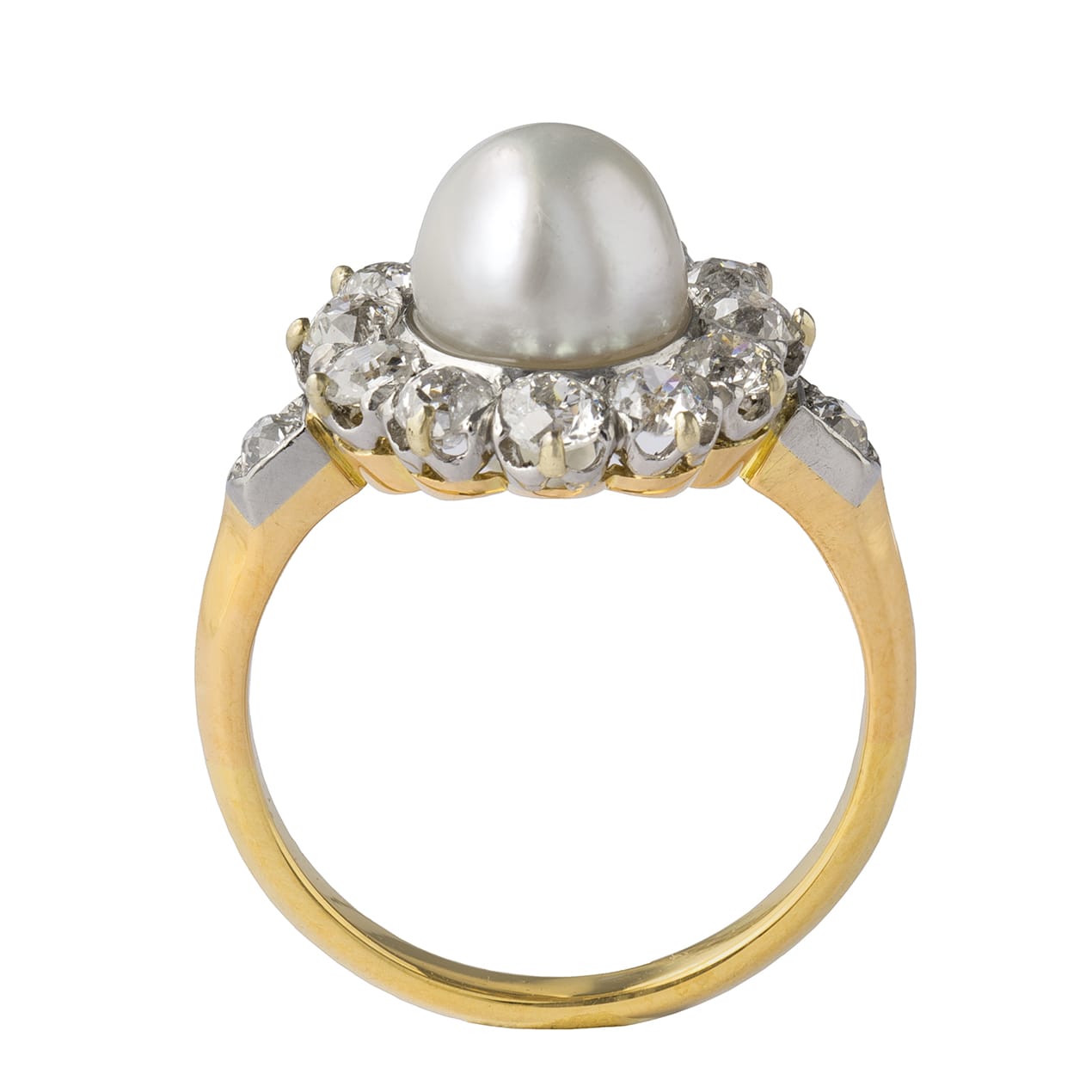 A natural pearl and diamond cluster ring, the central bouton pearl accompanied by GCS Report stating the pearl to be natural and of saltwater origin, surrounded by twelve old brilliant-cut diamonds and two old-cut diamond set shoulders, estimated to weigh a total of 1.30 carats, set in platinum on a gold mount with knife edge shank, circa 1900, head diameter measuring 1.5cm, finger size O 1/2, gross weight 5.95 grams, .