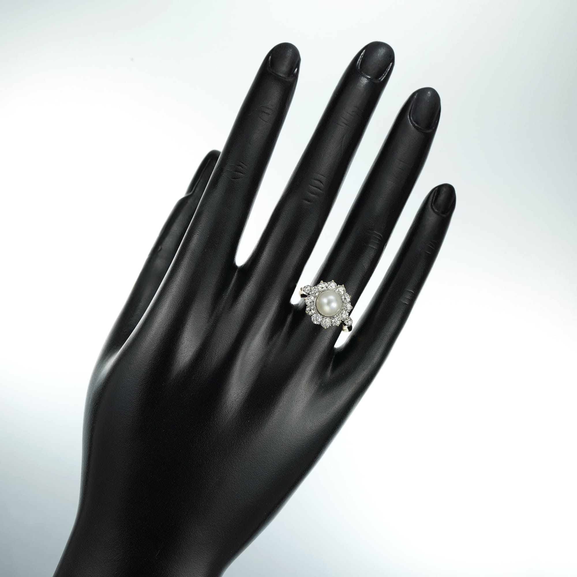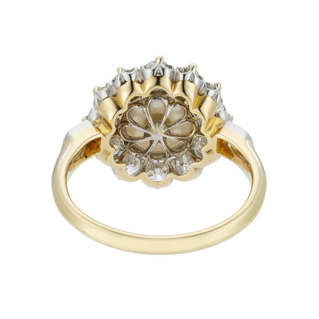 An elegant pearl and diamond ring. It features a natural saltwater pearl with a fine nacre, surrounded by a cluster of dazzling diamonds. The stones are set to platinum on a bright yellow gold band, which accentuates the central cluster with further diamonds. This ring reflects Edwardian sophistication with its simple design and use of lovely pearls and diamonds.