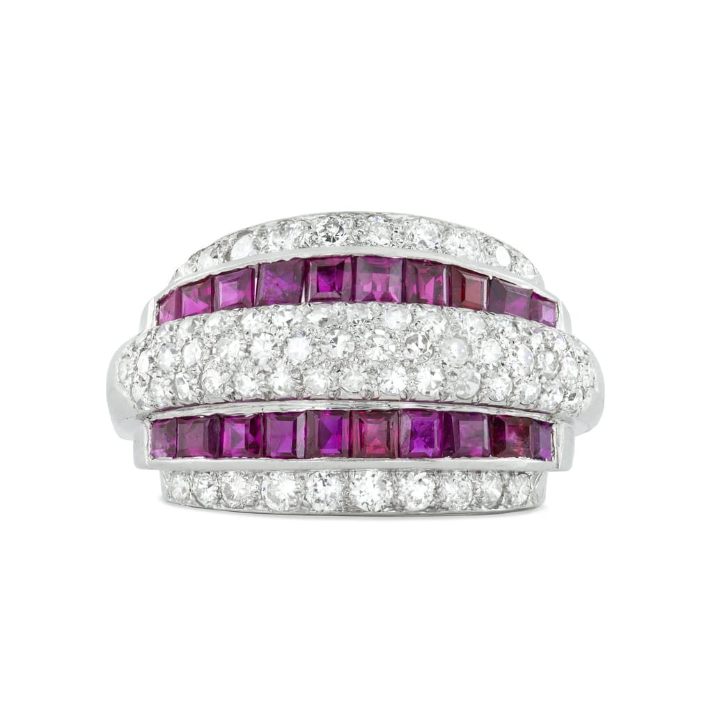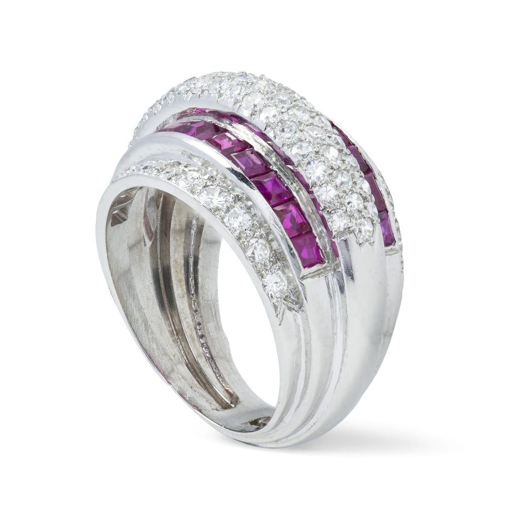 A French ruby and diamond bombe ring, the central row pave-set with eight-cut diamonds, set between two rows of calibre-cut rubies, within two rows of brilliant-cut diamonds, diamonds weighing approximately a total of 1.2 carats, the calibre-cut rubies weighing approximately ...