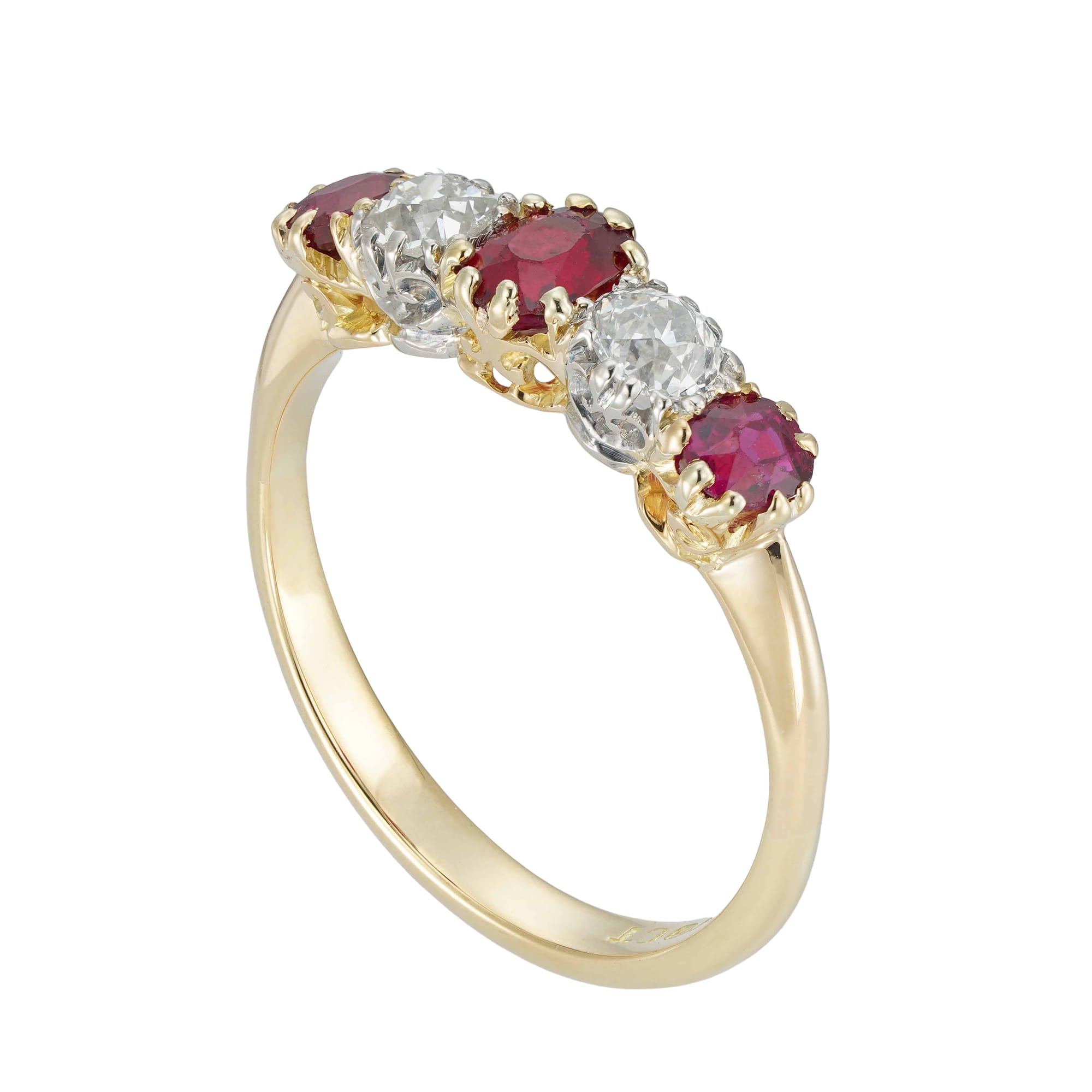 A charming five stone ring featuring glimmering diamonds and rubies. The five stone ring design was popular in the Victorian era and was otherwise known as a curved half hoop. This ring features three warm rubies and two glinting diamonds set between. The stones glimmer romantically and subtly catch the light when turned. This is a classic ring which will complement any outfit.