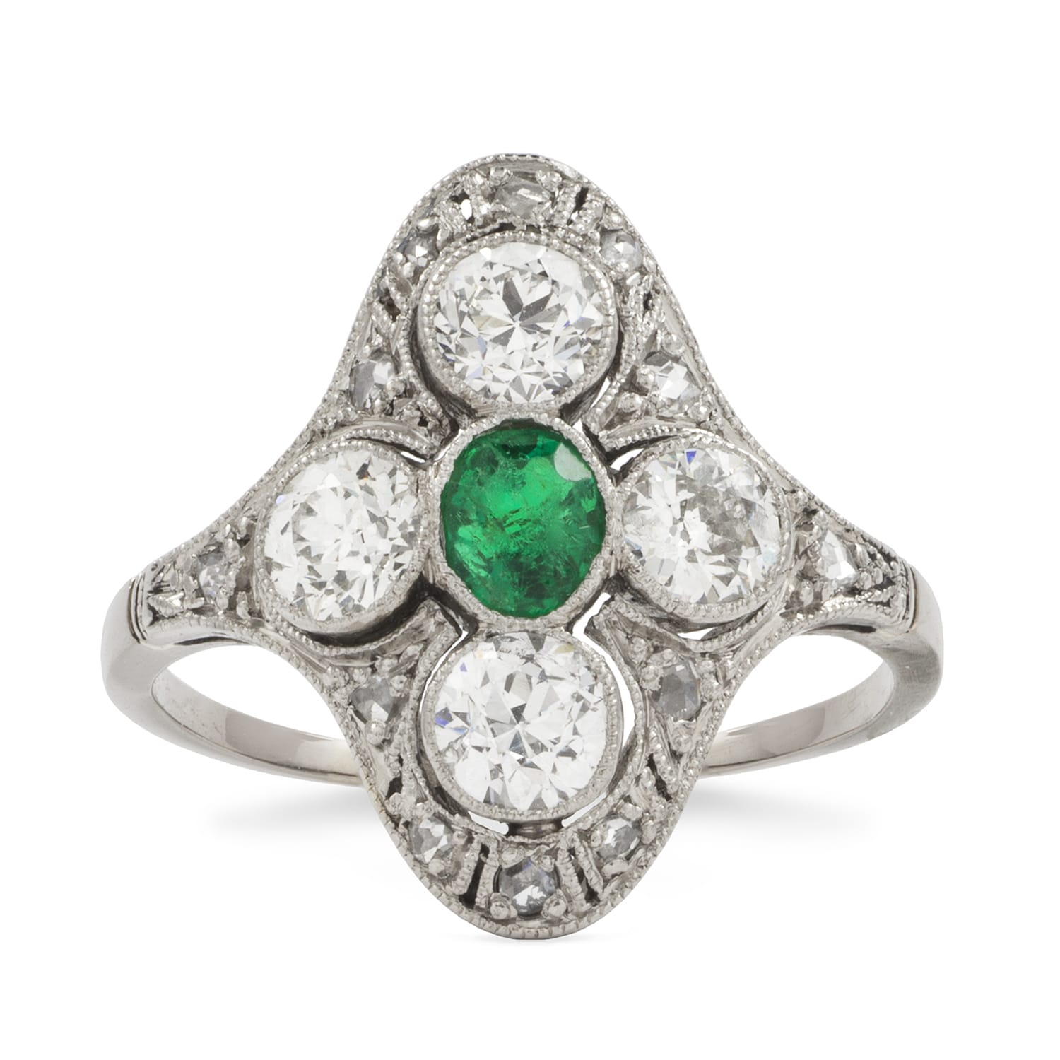 A turn of the century emerald and diamond plaque dress ring, the central emerald estimated to weigh 0.35 carat, vertically set with 4 old brilliant cut diamonds on the top, bottom and sides with further surround of smaller single cut diamonds estimated to weigh a total of 1.00 carats, rubover and grain set in platinum mount, circa 1900, the head measuring approximately 1.7×1.2cm, finger size L, gross weight 3.4 grams.