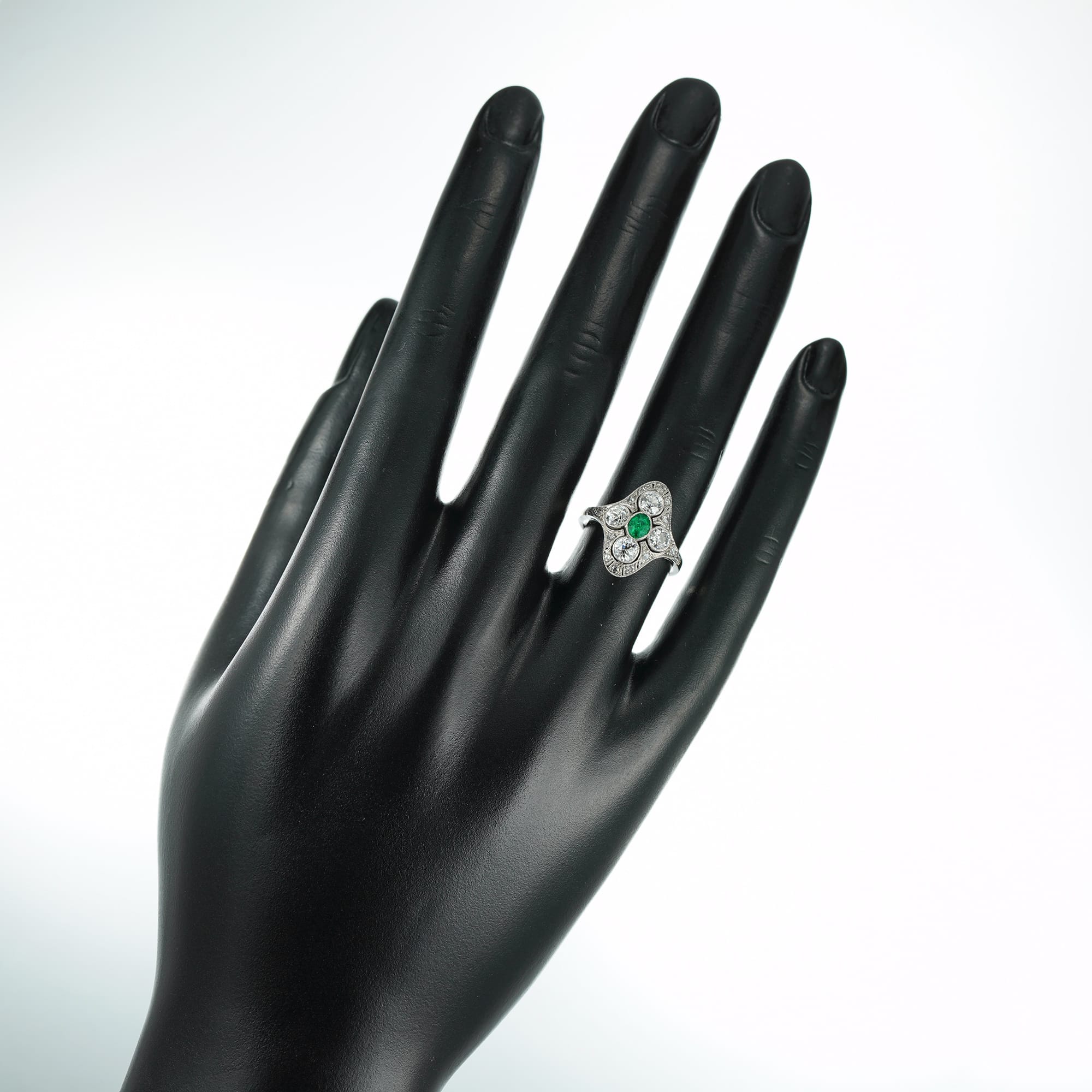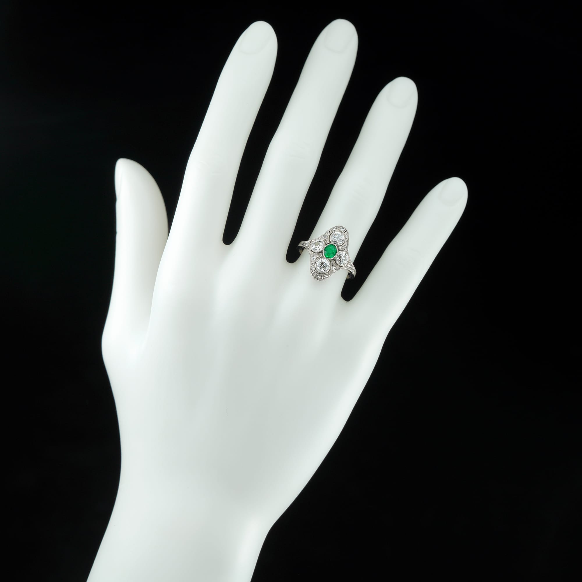 This dazzling Edwardian dress ring was made at the turn of the 20th century. This ring features a wonderful platinum plaque in which is set four scintillating diamonds surrounding a single deep green emerald. This gorgeous and classic ring exemplifies early twentieth century sophistication and would be a perfect accessory worn with a simple bias-cut evening gown.