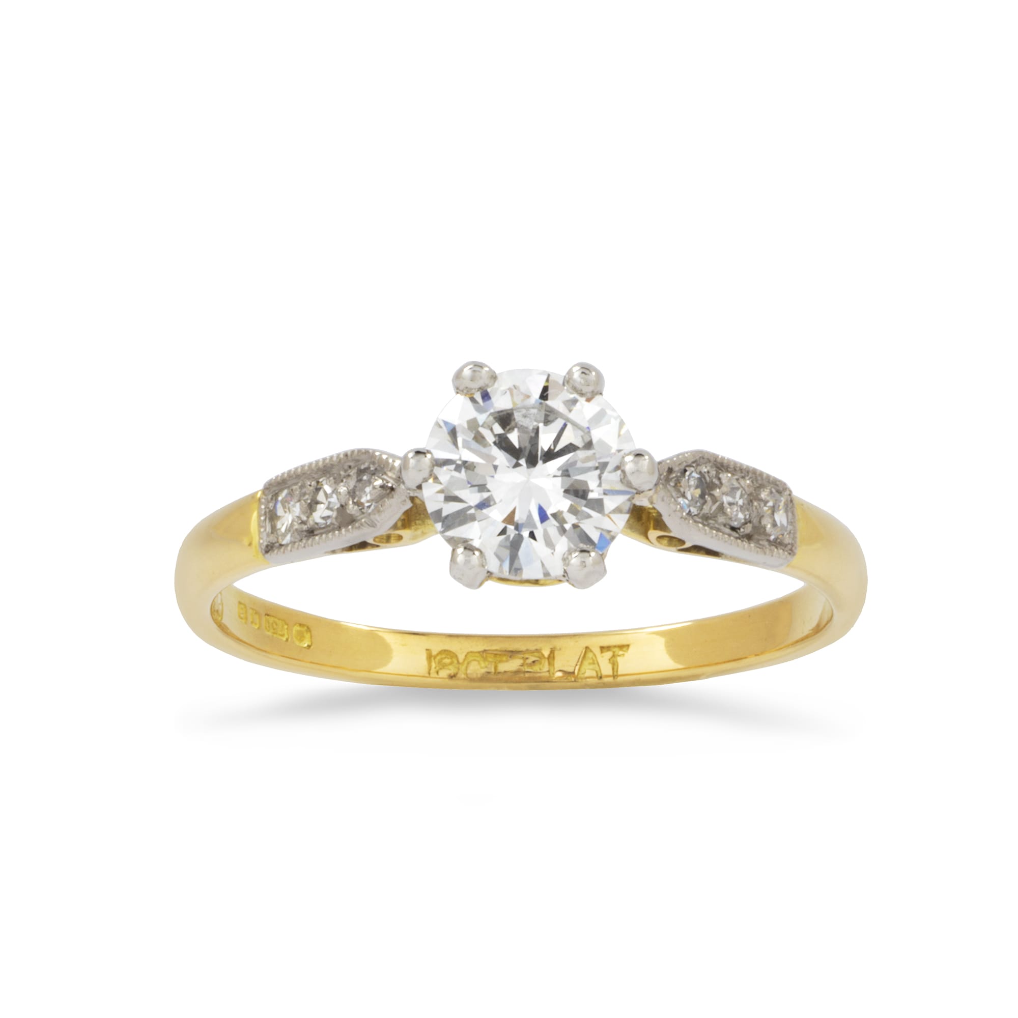 A single stone diamond ring, the round brilliant-cut diamond weighing 0.68 carats of G colour and VS1 clarity, accompanied by De Beers Grading Report, set in a six-claw platinum collet, to diamond millegrain-set shoulders and yellow gold shank, later hallmarked 18ct gold London, size M 1/2, gross weight 2.2 grams.