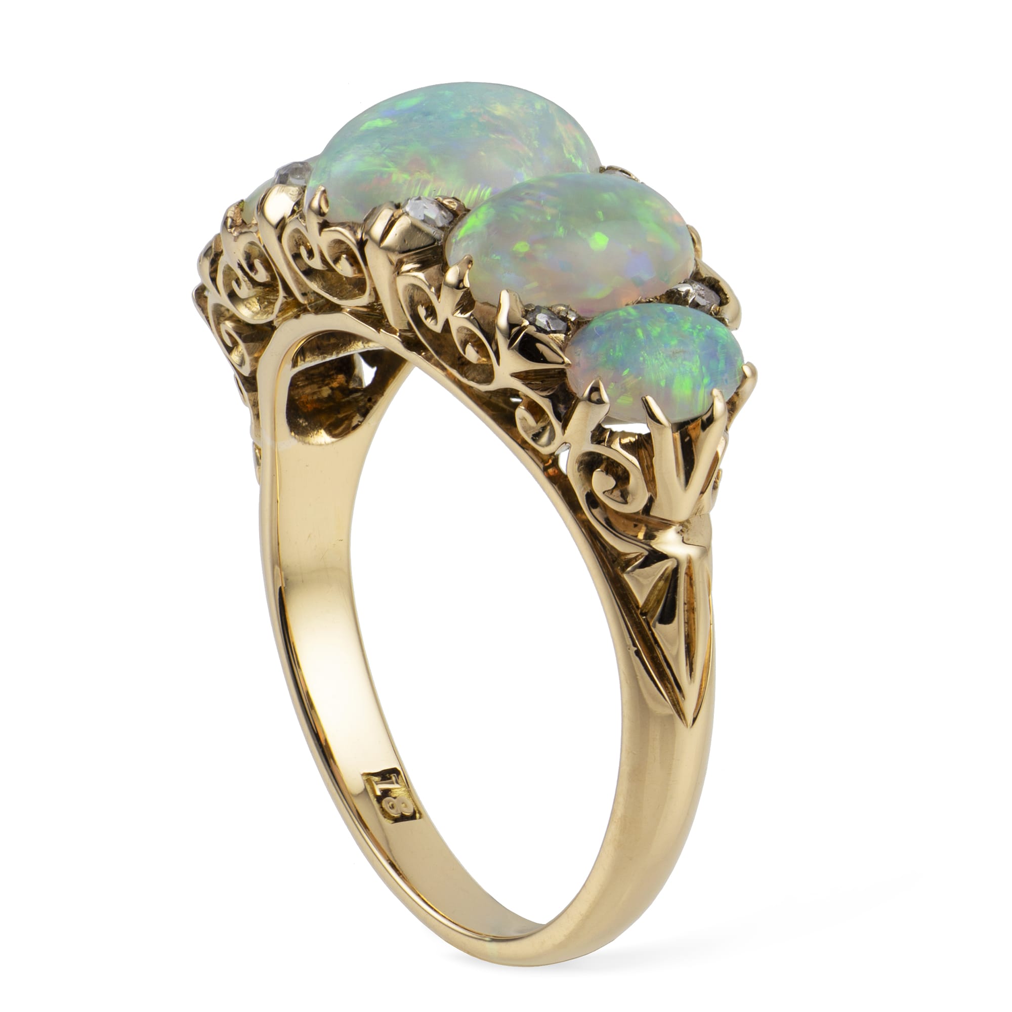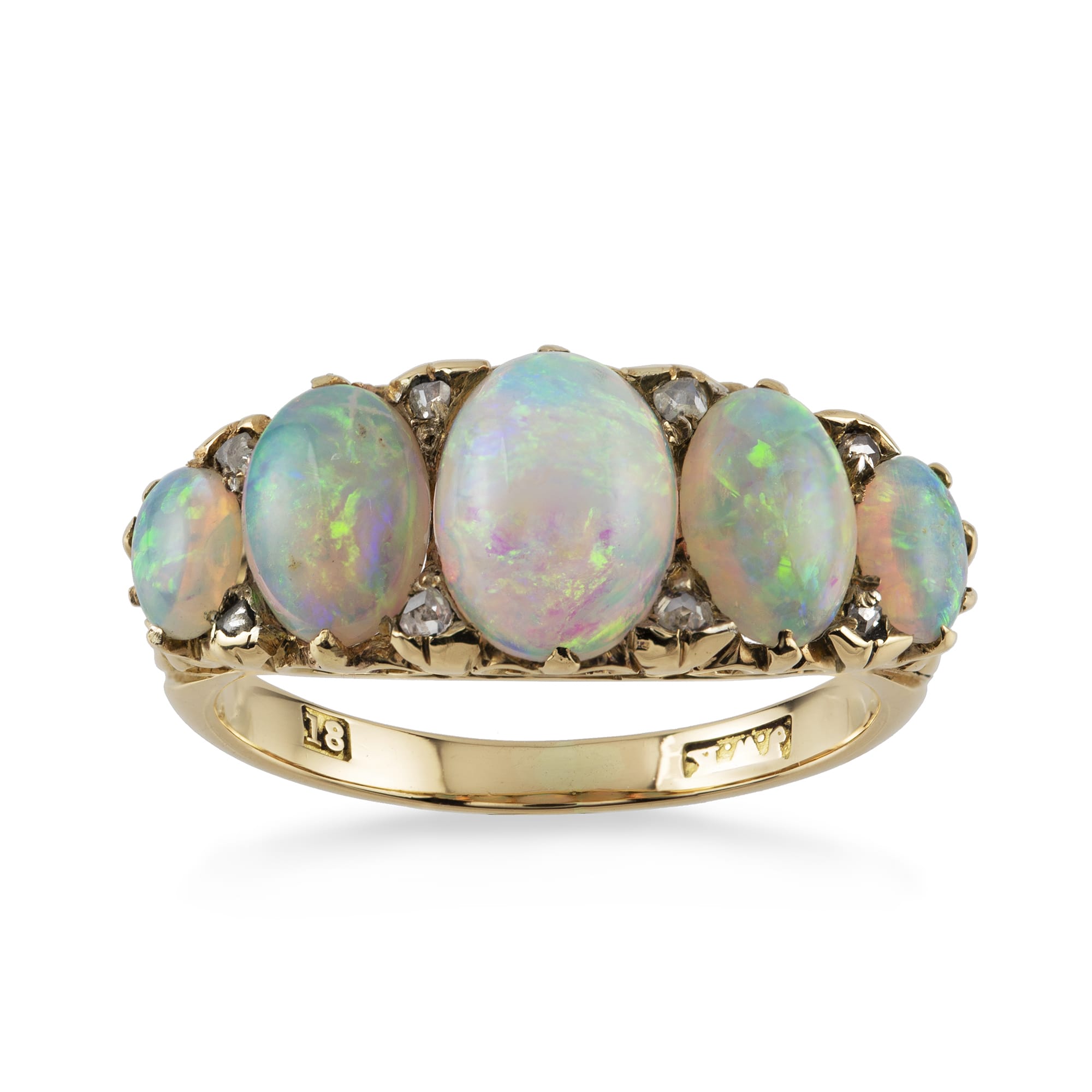 A Victorian five-stone opal ring, the five graduated from the centre oval cabochon-cut opals, flanked with rose-cut diamonds, all claw-set to a yellow gold mount, circa 1880, measuring 2.2 x 0.9cm, finger size L, gross weight 4.3 grams.