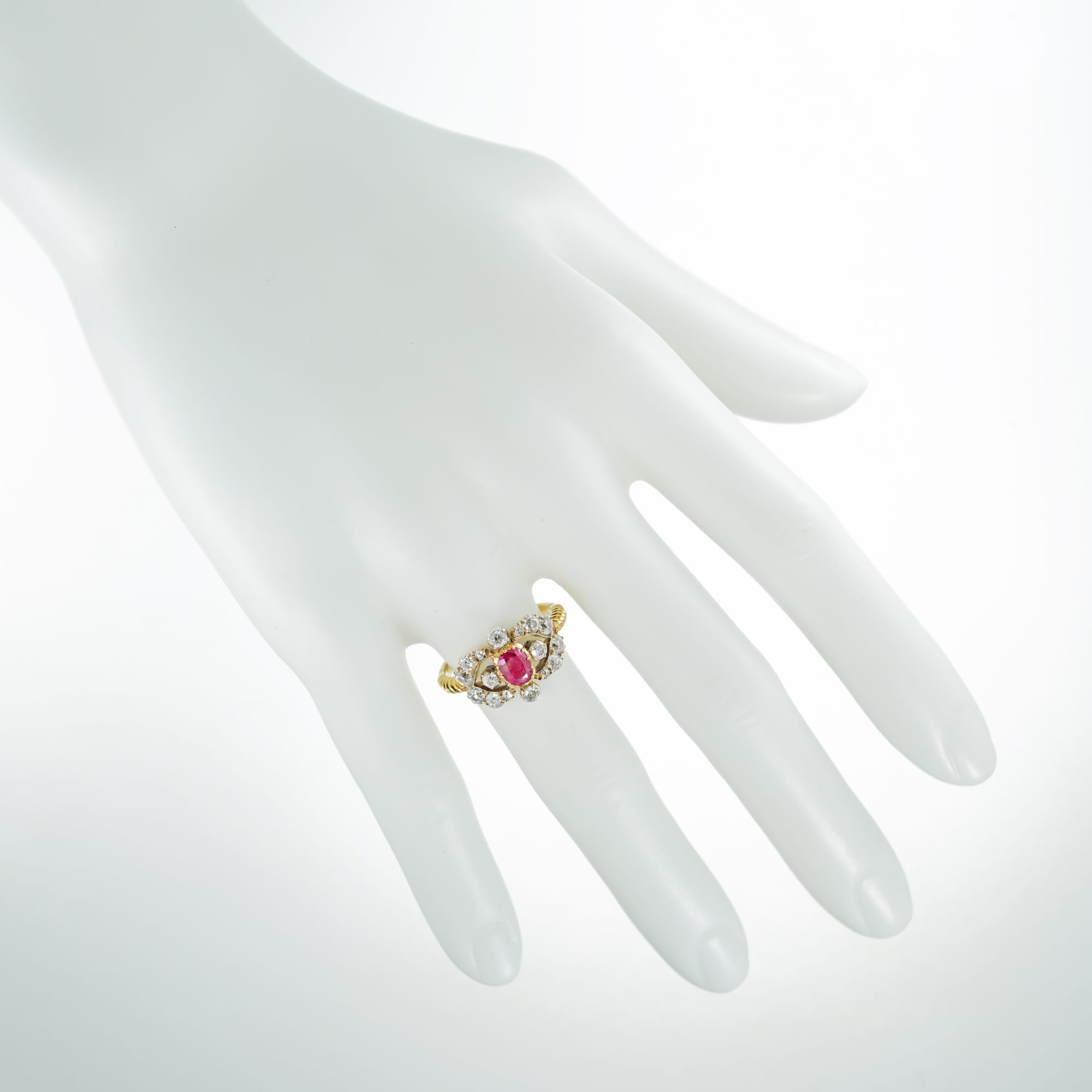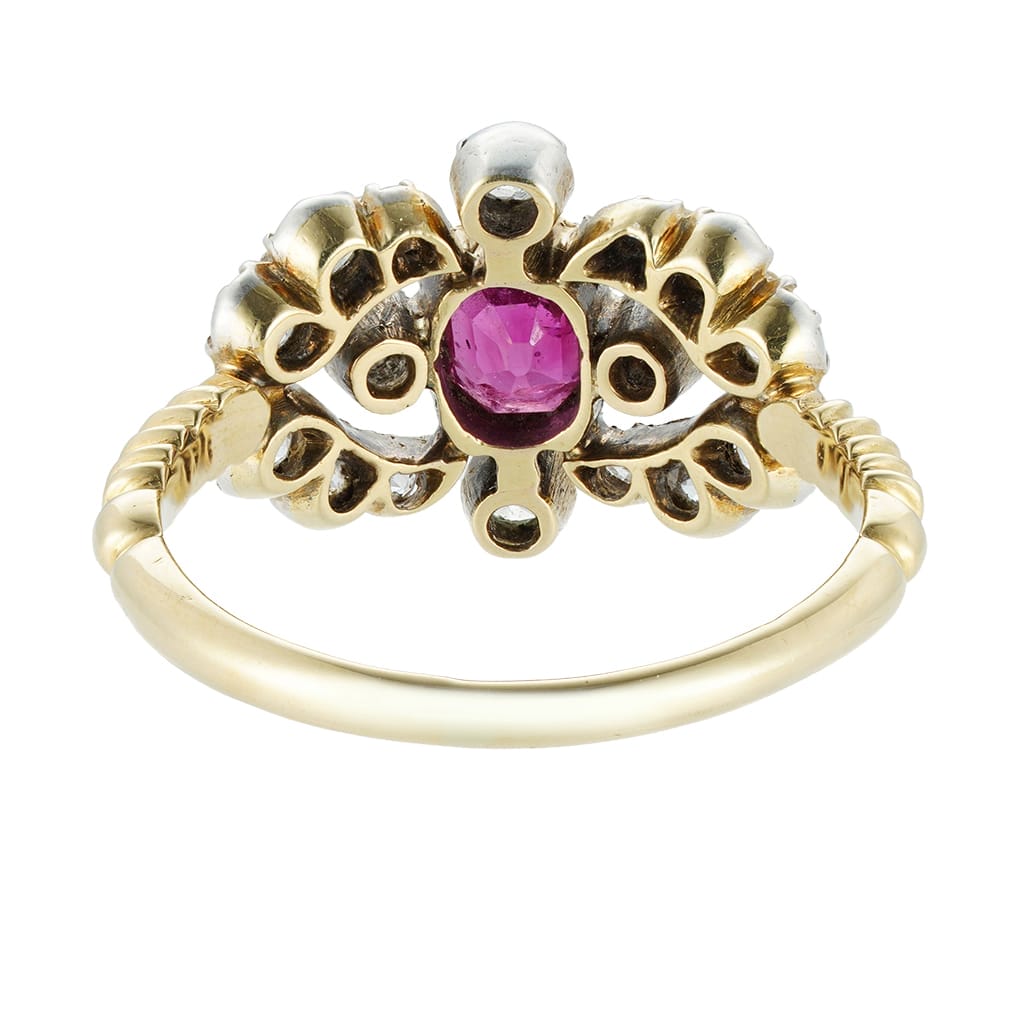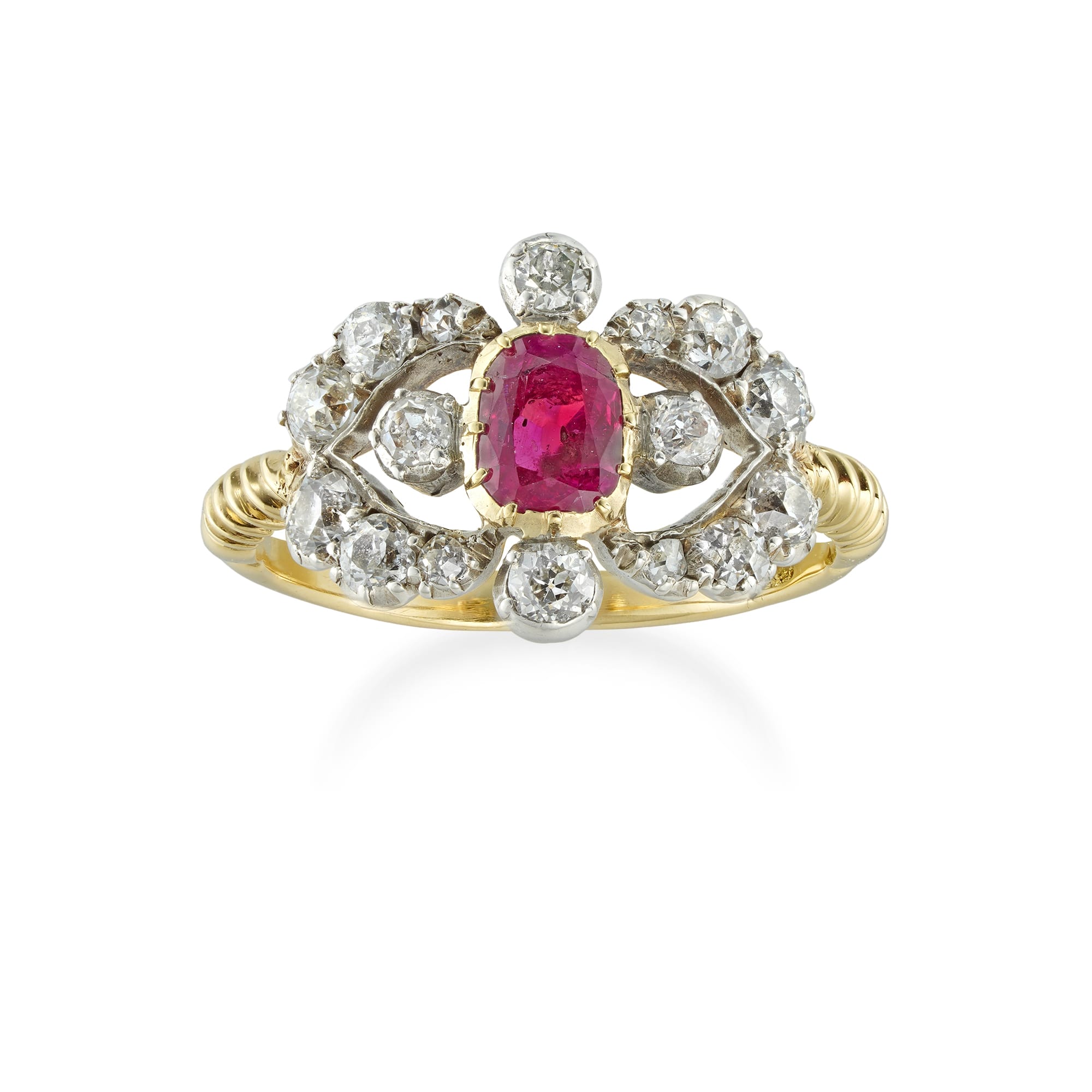 A Victorian ruby and diamond ring, to the centre a cushion-cut ruby estimated to weigh 0.65 carats, surrounded by four old European-cut diamonds, with V-shaped diamond-set sides encrusted with further twelve old-cut diamonds o graduating size, the diamonds estimated to weigh 0.8 carats in total, all mounted in silver and yellow gold, to a yellow gold shank with rope design decoration, circa 1890, the head measuring approximately 15mm x 12mm, finger size L ½, gross weight 3.3 grams,