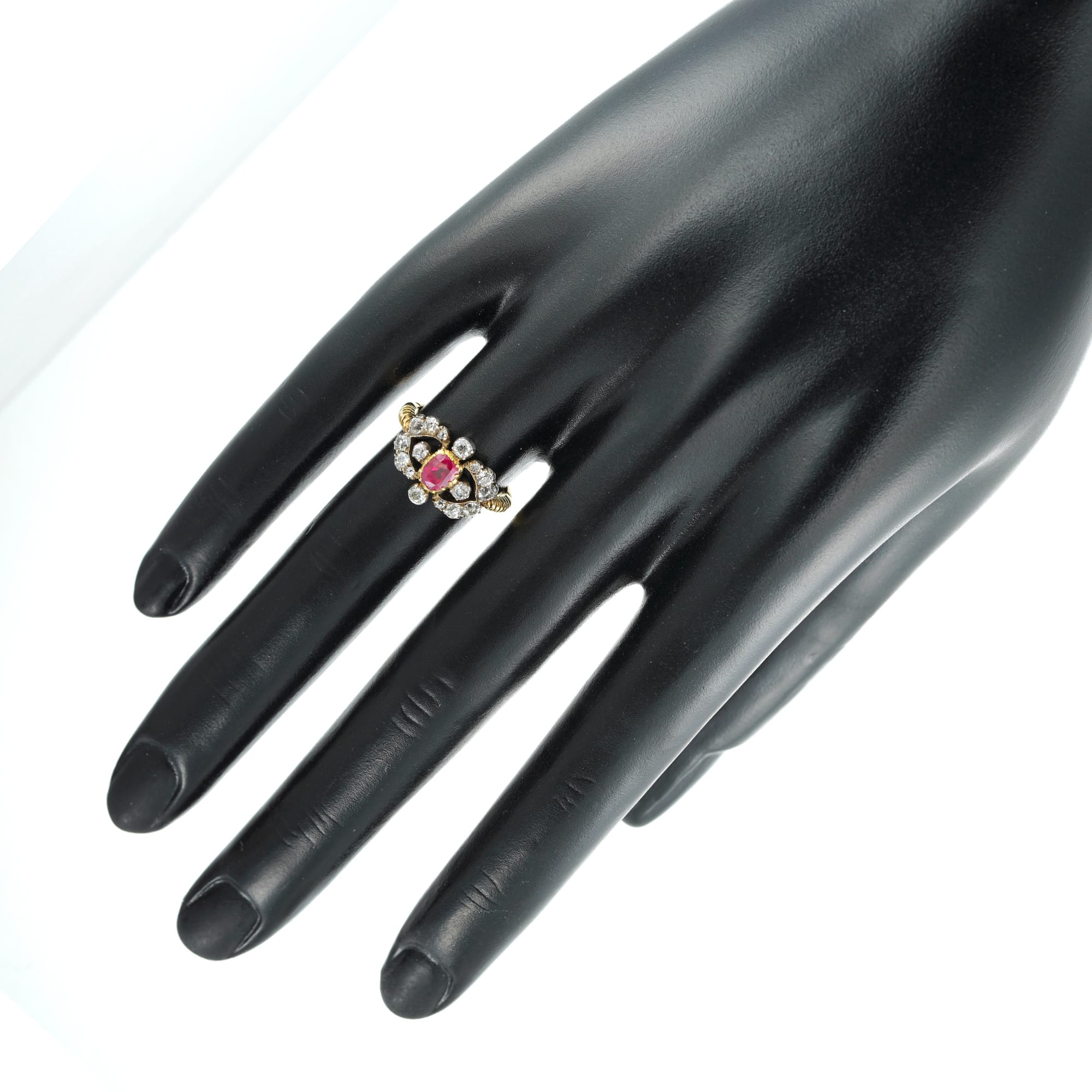 A marvellous Victorian ring. It features a vivid pigeon’s blood red ruby surrounded by a lovely openwork frame of glittering diamonds. This gorgeous and romantic ring exemplifies late Victorian femininity and would make a unique engagement ring.