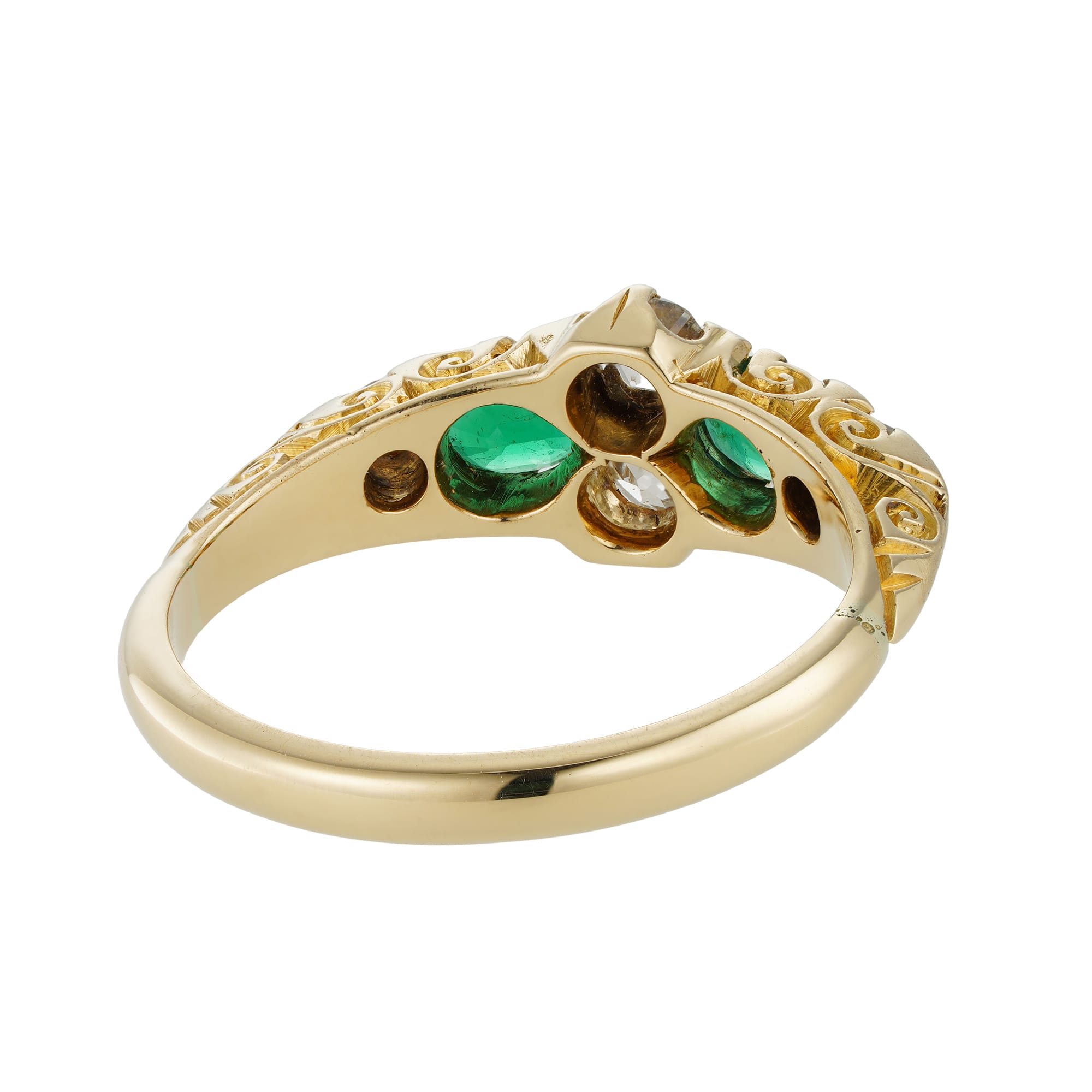 An Edwardian emerald and diamond ring, to the centre two small old-cut diamonds vertically set with an oval faceted emerald one each side, with one small old cut diamond at each end, the emeralds estimated to weigh 0.4 carats in total, the diamonds estimated to weigh 0.4 carats in total, all mounted in yellow gold with carved gallery and taping shank with engraved decorations, marked 18ct, circa 1905, measuring 1.9 x 0.7cm, finger size L, gross weight 3.6 grams.